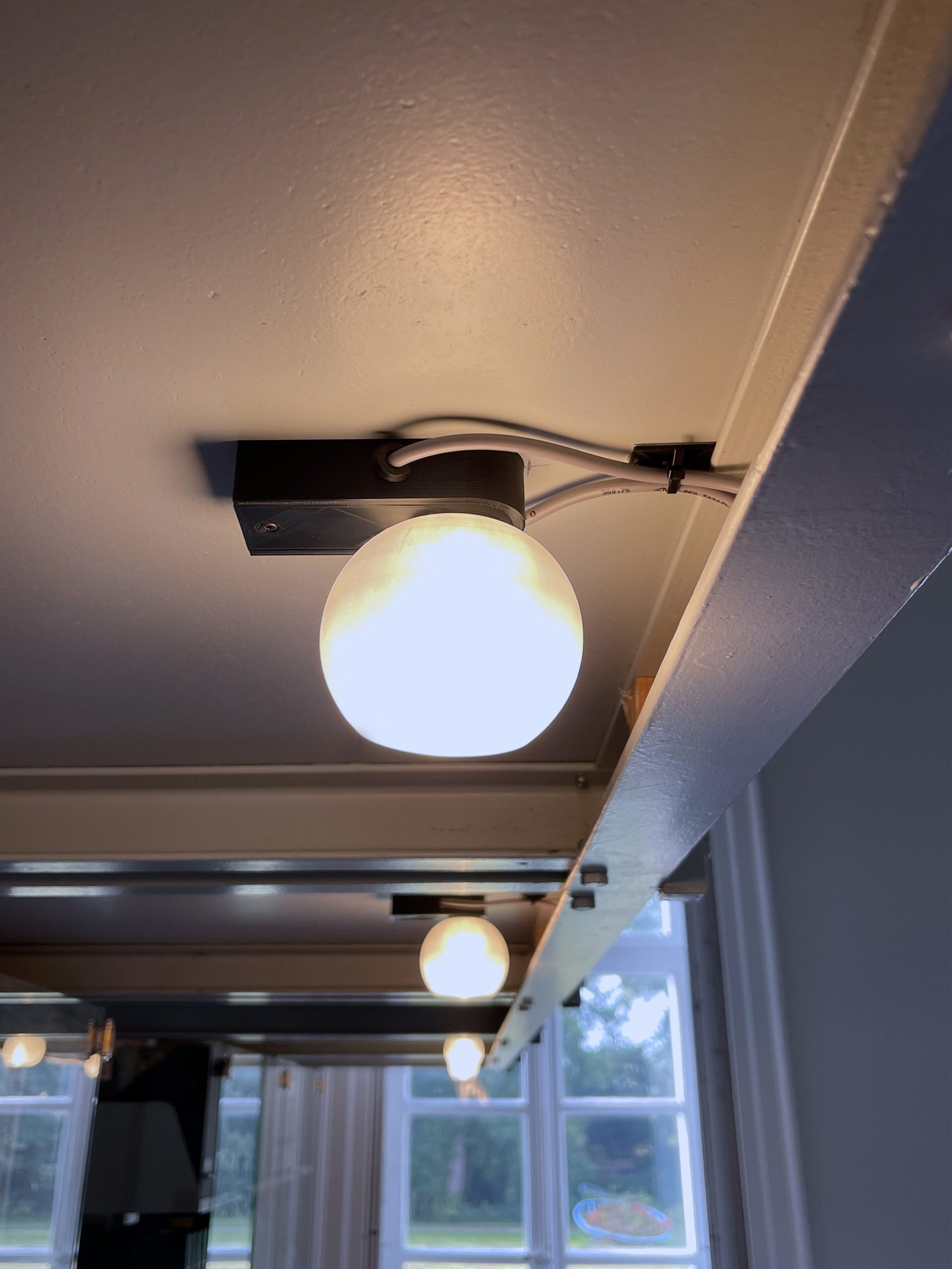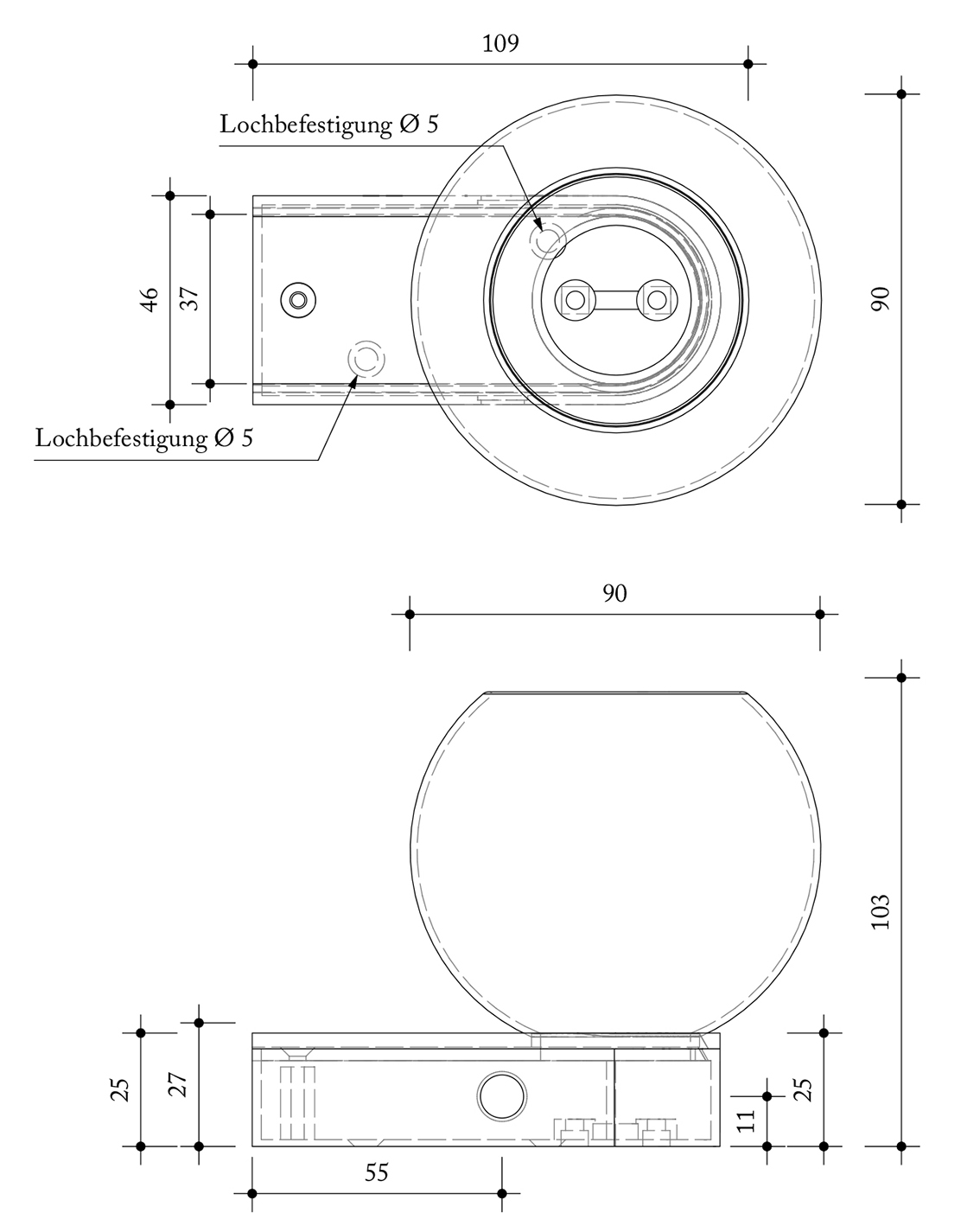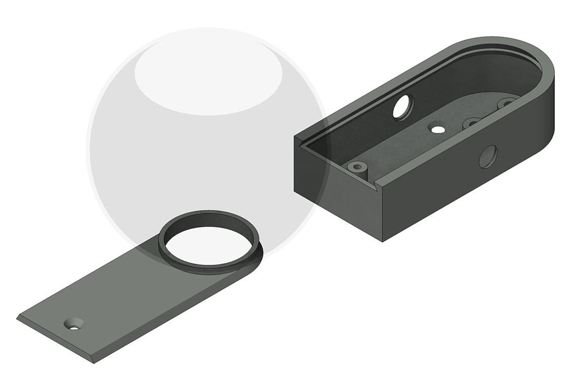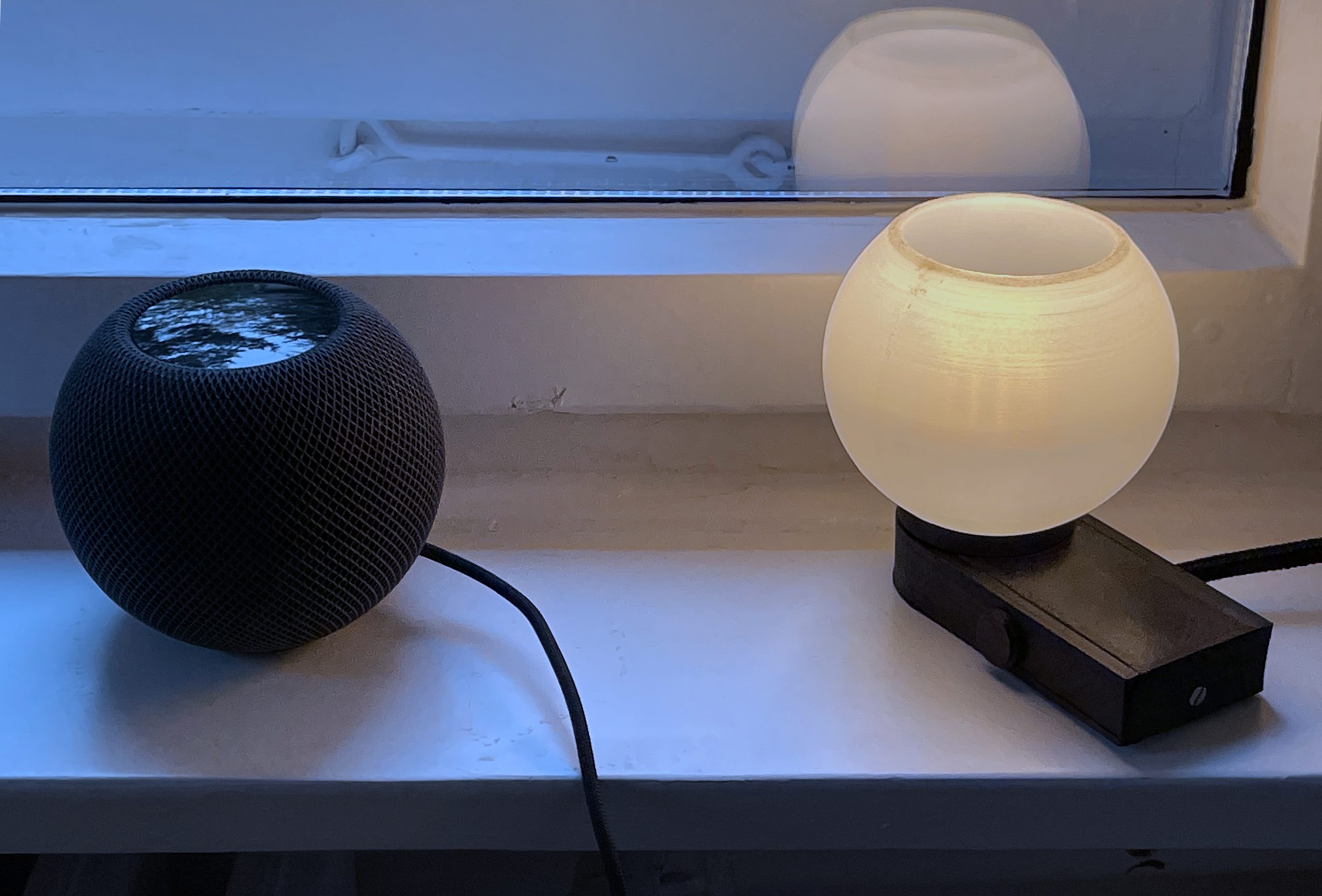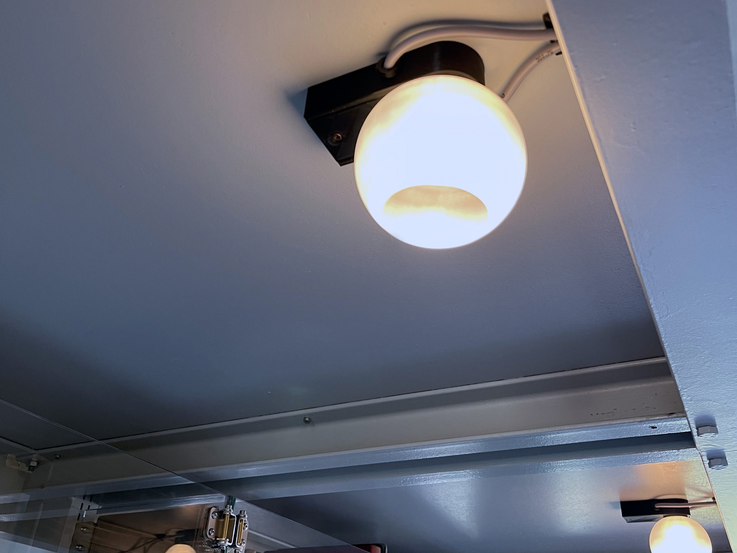 Da keine geeigneten Leuchten mit gleichmäßigem Licht von ganz oben bis unten, blendarm und mit elegantem Auftritt – die Leuchten spiegeln sich in der Verglasung – gefunden wurden, entwickelten wir eine Kugelleuchte für LED-Lampen mit GU10-Fassung, die aus zwei Teilen im 3D-Drucker hergestellt wird. Die Ähnlichkeit von Proportion und Form mit dem Home Pod Mini von Apple ist frappierend, aber zufällig. Das geeignetste Leuchtmittel mit einem Abstrahlwinkel von 120° hinterleuchtet die transluzente Kugel so, dass der obere Wandbereich diffus angestrahlt wird. Die direkte Strahlung beleuchtet weiter unten die Wand übergangslos.