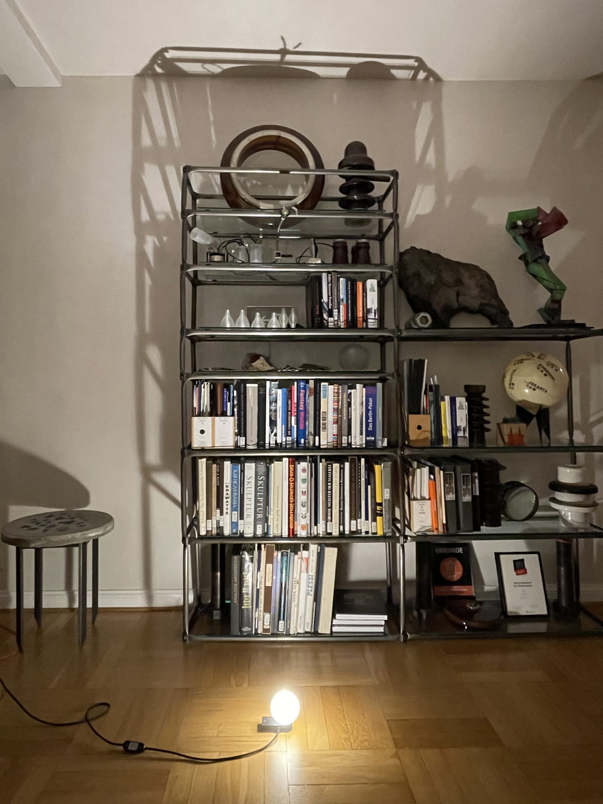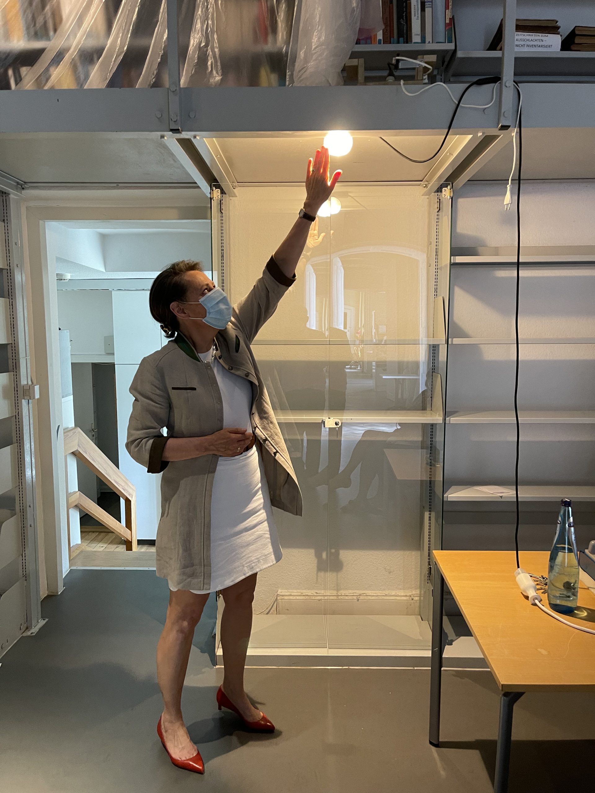Auf dem 5. und 6. Bild sind Beleuchtungsproben in unserem Büro zu sehen (mit umgekehrter Wirkung von unten nach oben). Die nächsten drei Bilder zeigen die Bibliothek vor der endgültigen Einrichtung. Das letzte Bild zeigt die Direktorin des Hauses, Dr. Gisela Vetter-Liebenow, während der Beleuchtungsprobe mit die Kugelleuchte im Museum am 28. Juni 2021