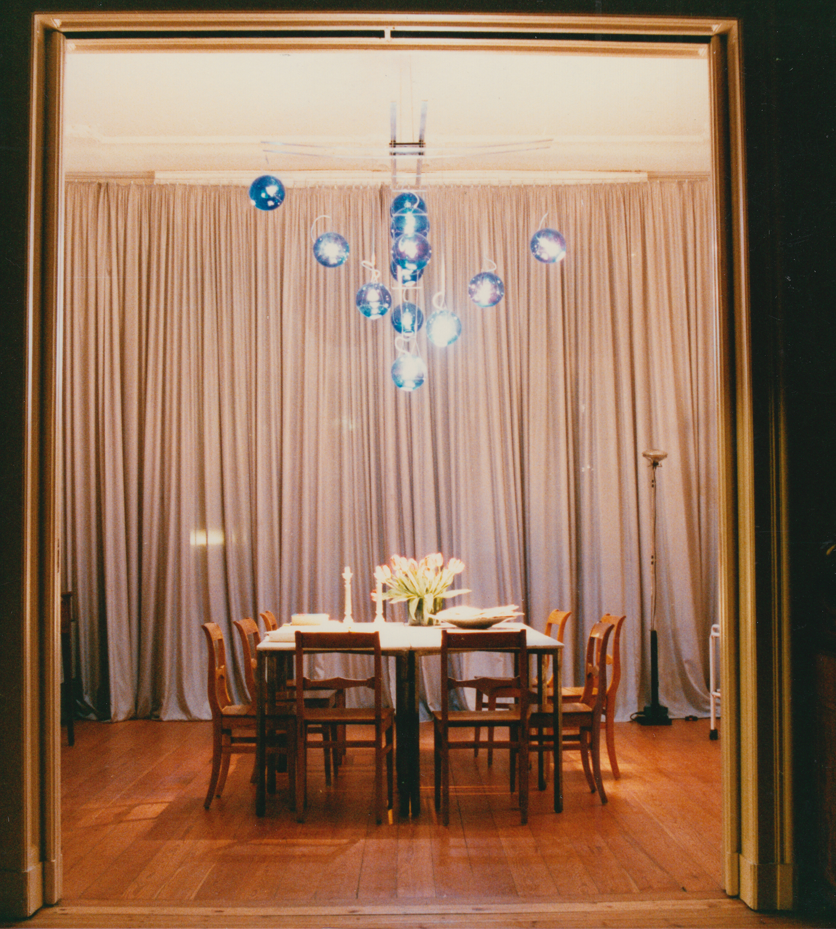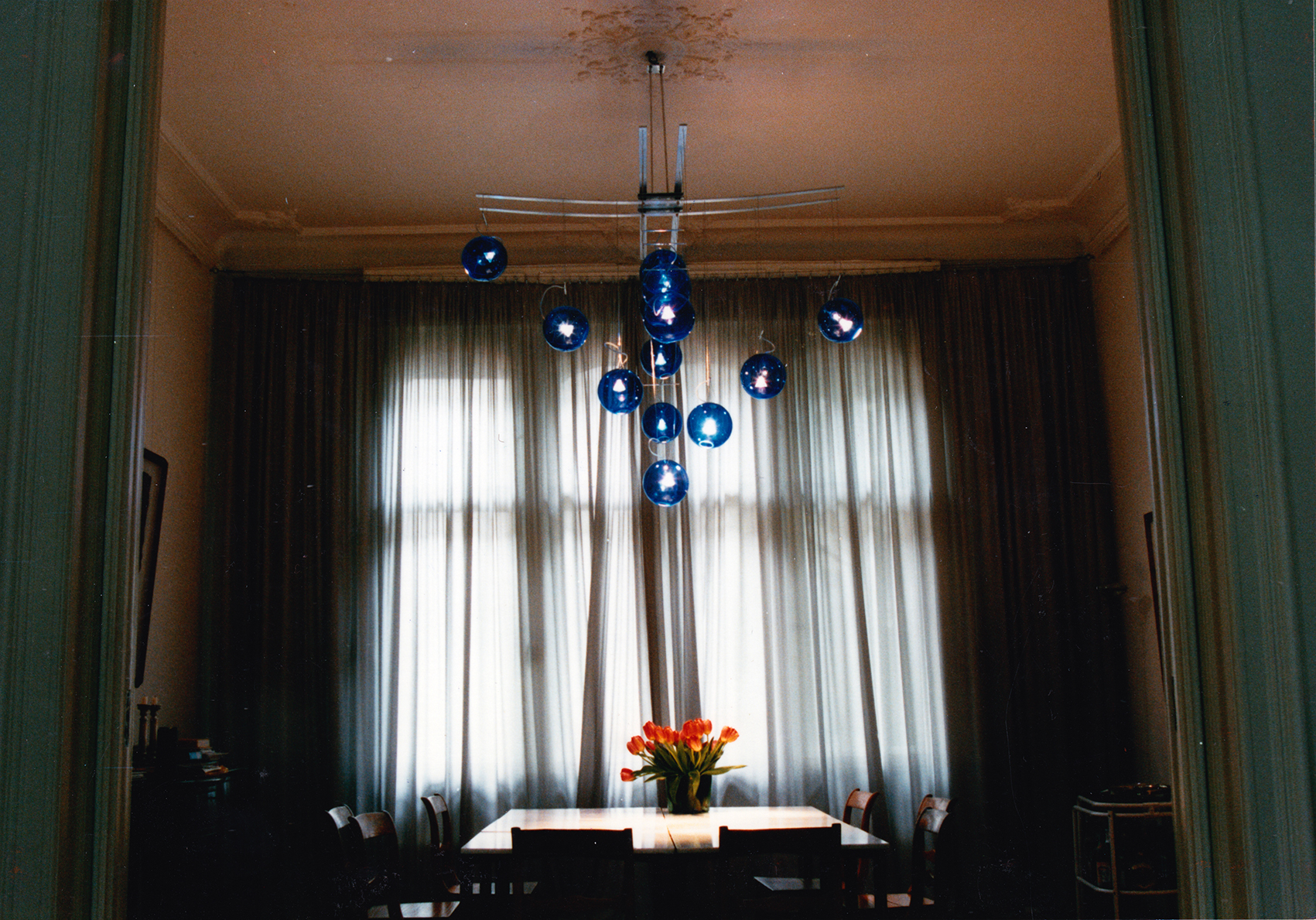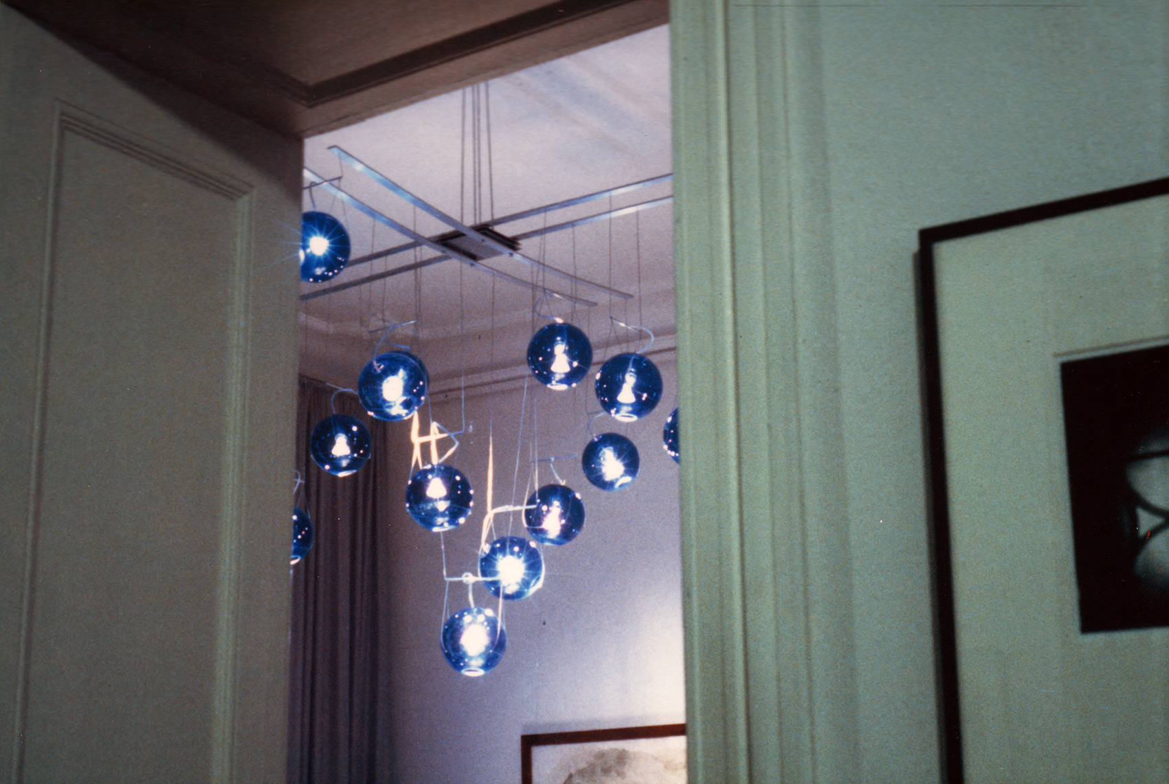 Die blauen Lichtkugeln aus der Ausstellung Schätze aus dem Topkapi Serail – das Zeitalter Süleymans des Prächtigen, 1988, waren sehr gefragt und wurden vielfach für den Wohnbereich variiert. Die abgebildete Leuchte in der Friedenauer Stadtvilla der Ärzte Peter Nottebaum und Manfred Tripodi besteht aus zwei sich kreuzenden, stromführenden Flachaluminumpaaren in polierter Ausführung.
