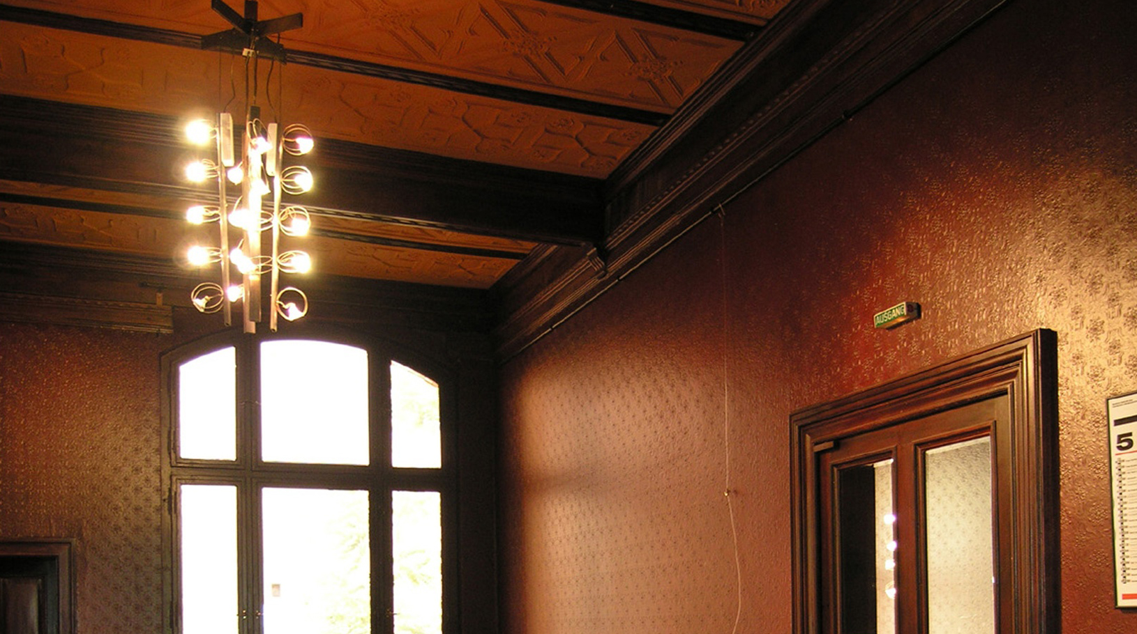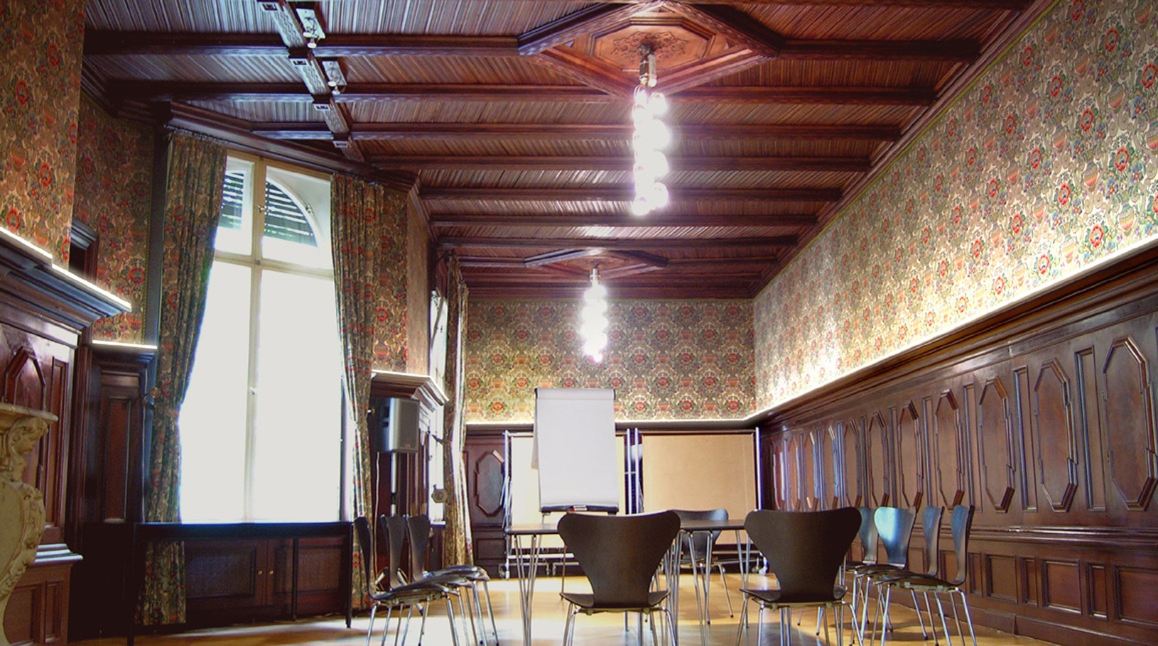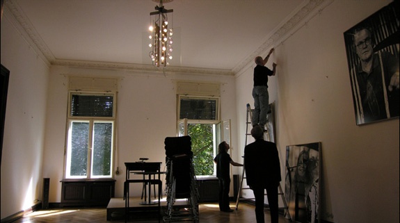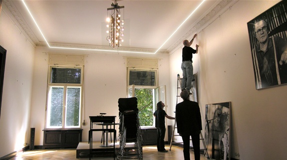 Vom Leiter des Literaturhauses Berlin angesprochen, war es eine besondere Herausforderung, die eigene 1986 entwickelte Beleuchtung mit einem zentralen Kronleuchter für Kunstausstellungszwecke zu optimieren. Zwar lassen sich alle Halogenlampen des Kronleuchters einzeln ausrichten, doch eine Gleichmässigkeit der Lichtabbildung ist nur durch eine linienförmige Leuchte zu gewährleisten. Der Vorschlag besteht in feinen Leuchtstofflampenlinien, im Ausstellungsraum relativ hoch angebracht; für das etwas düstere Kaminzimmer ist die gleiche Leuchte auf der Oberkante der Holztäfelung aufgelegt um die oberen Wandbereiche aufzuhellen. Trotz der verbesserten Lichtwirkung vermieden wir Eingriffe in die vorhandenen Oberflächen.