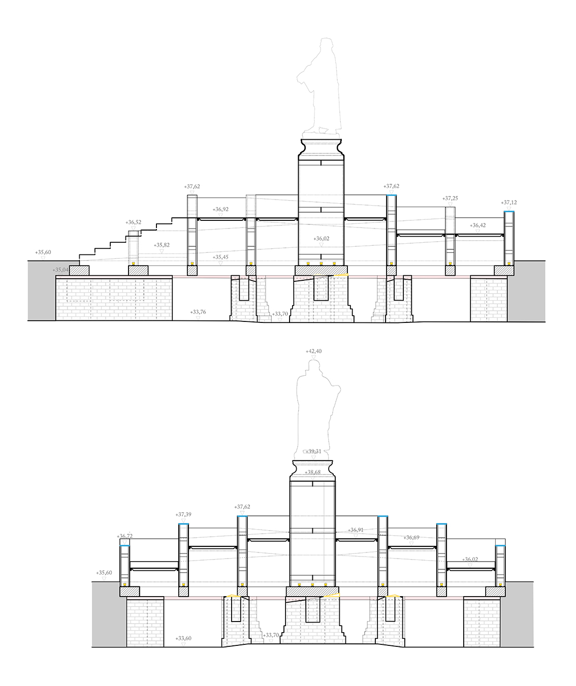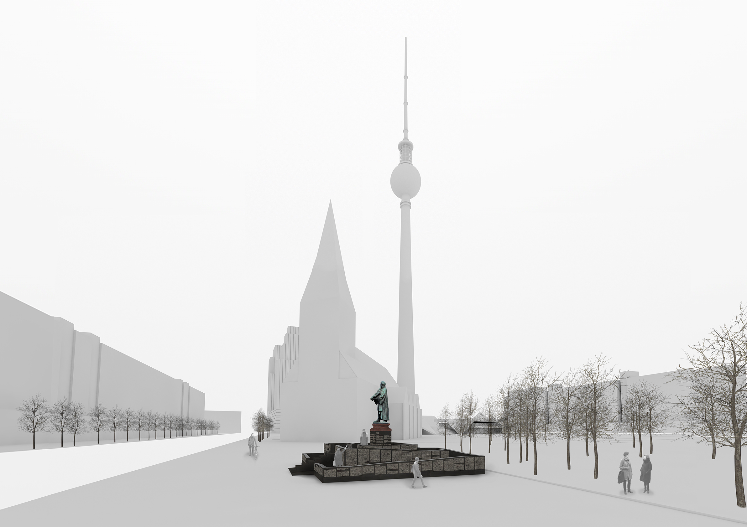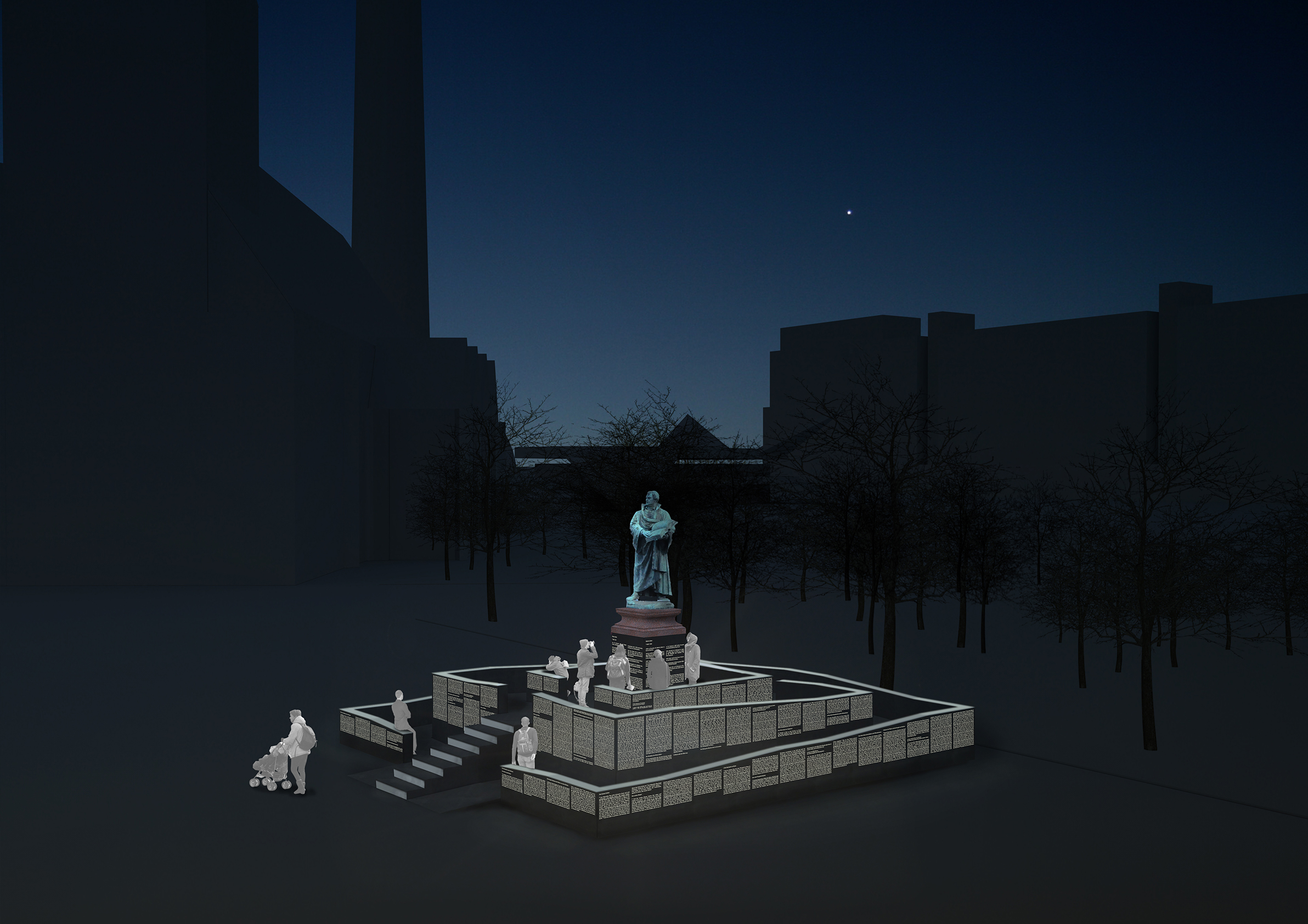 Das Bronzebild Martin Luthers erhebt sich in die Höhe, in der sich die Figur im natürlichen Licht entfaltet und gleichzeitig vor Vandalismus geschützt ist. Dabei erscheint Martin Luther mit den Menschen, die das Denkmal aufsuchen, in immer wechselnden Kompositionen. Sie nehmen den Platz der verloren gegangenen Figuren des ursprünglichen Denkmals ein und stehen damit in ständigem Bezug zu Luther und unserer heutigen Zeit.