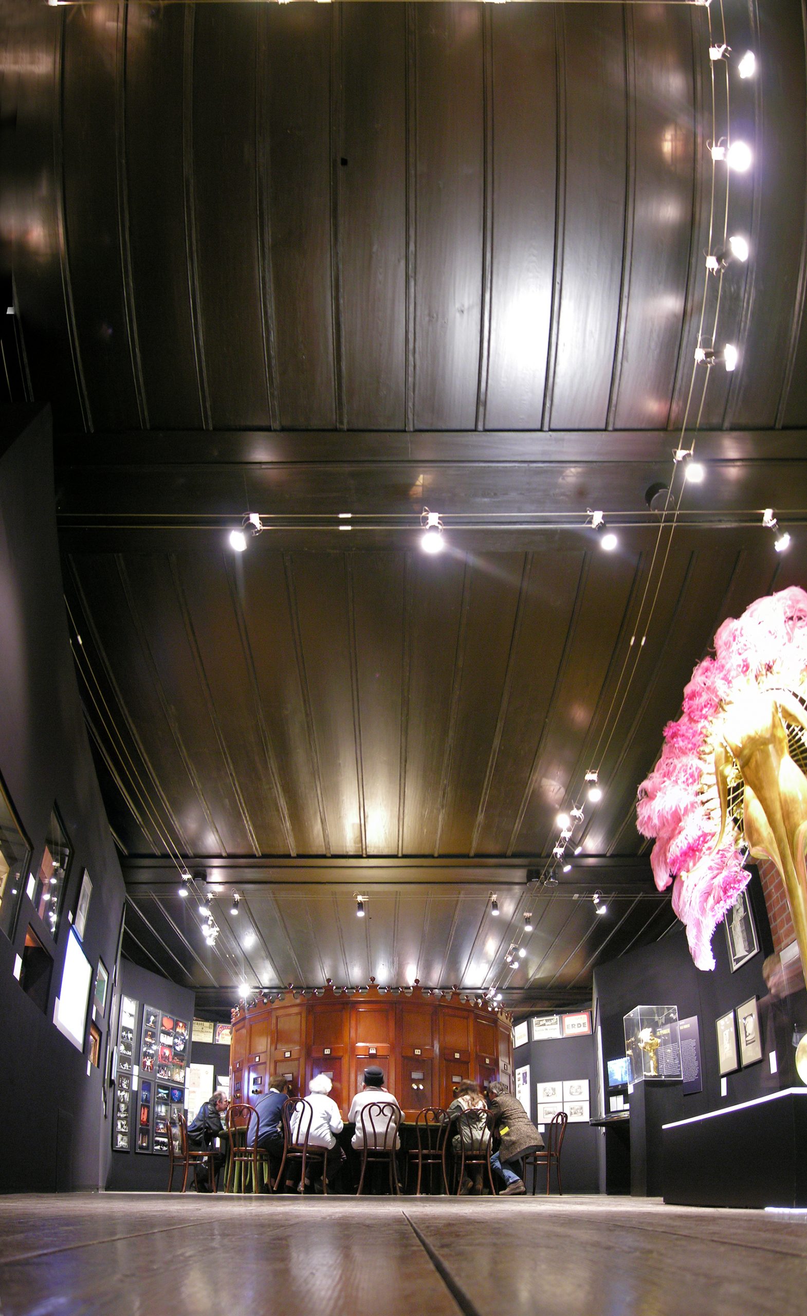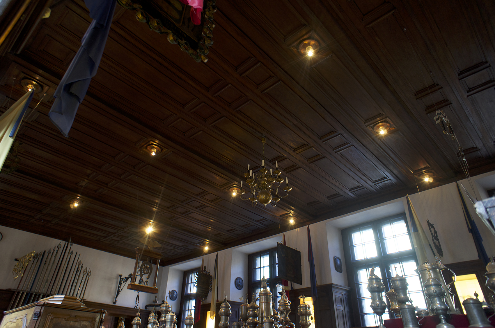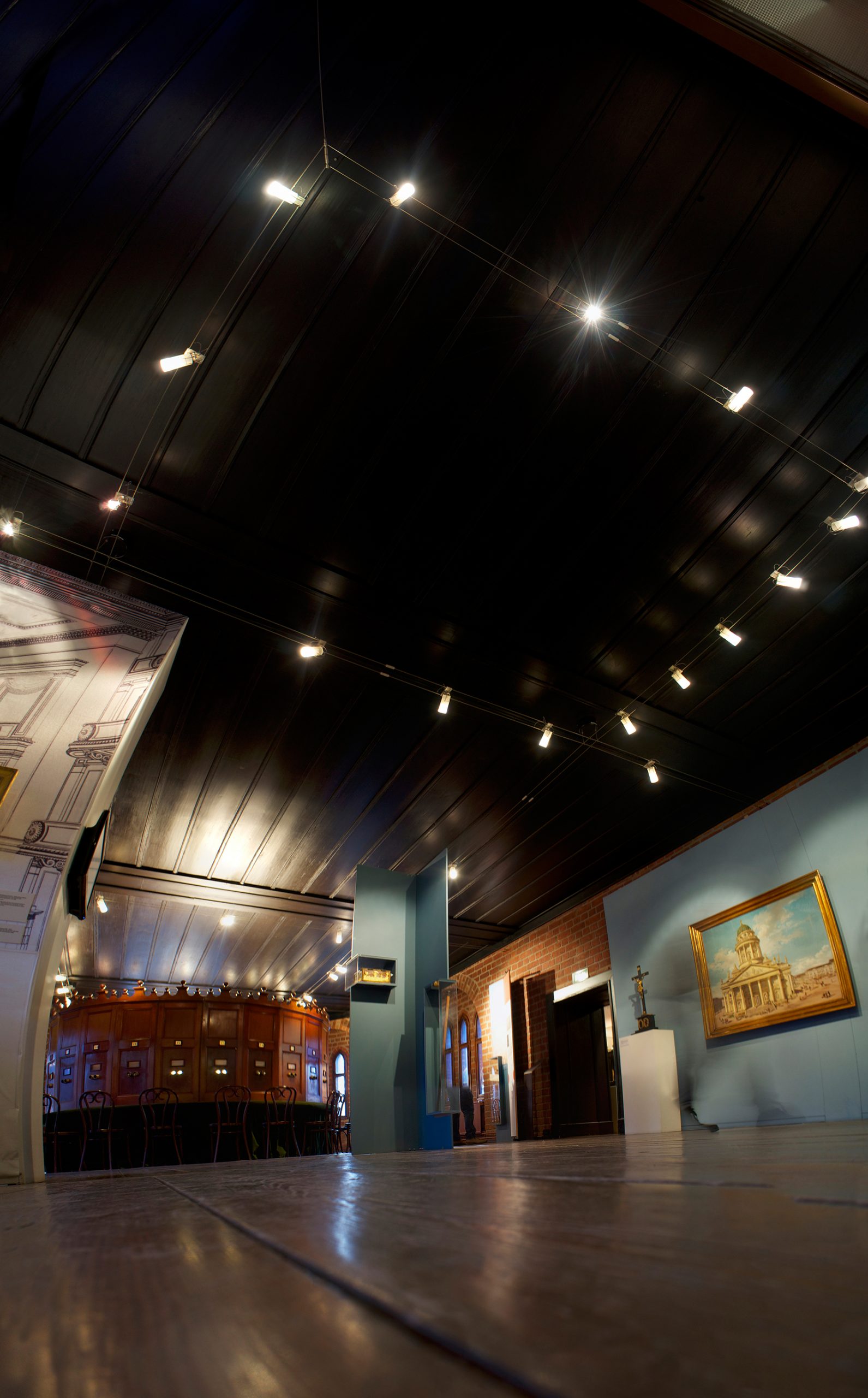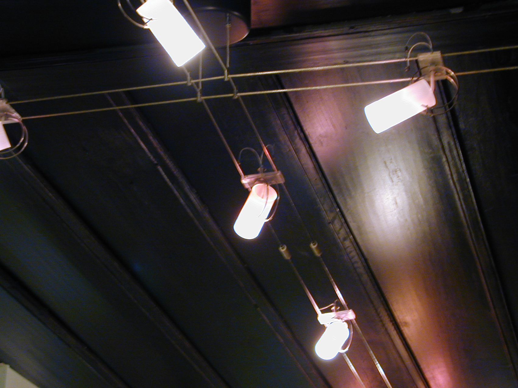 Für diesen Saal adaptierten wir ein Seilleitersystem mit isolierten Stromführungen auf Niedervoltbasis, das an wenigen, durch Auslässe vorgegebene Stellen an der Decke aufgehängt und zu den Wänden gespannt wurde. Grundprinzip dieses Lichtsystems ist eine Entblendung der einzelnen Brennstellen, hier durch mattierte Glaszylinder erreicht. In diesen werden Kaltlichtspiegelreflektorlampen in der Lichtachse verschiebbar gelagert. Den Glaszylinder zeichnet aus, dass das Nebenlicht diffus für die Raumbeleuchtung und Stimmung zum Einsatz kommt, um dadurch den gesamten Lichtstrom zu nutzen.