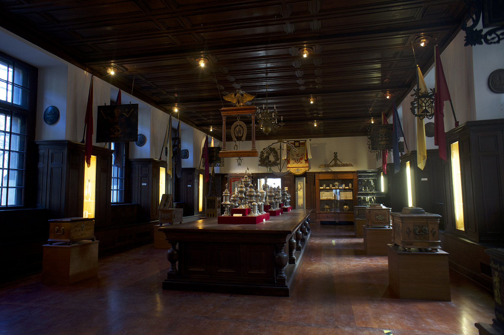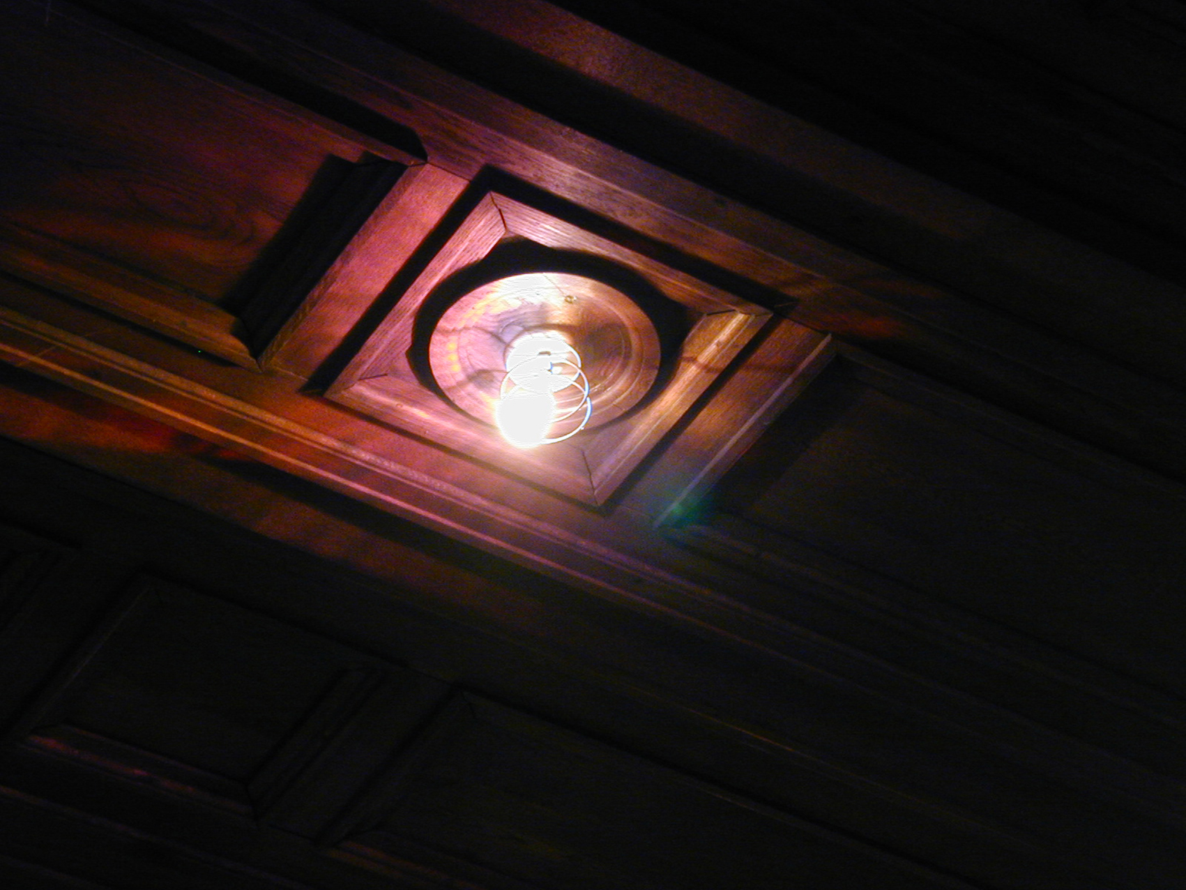 Die Aufgabe für die Lichtgestaltung war, die Harmonie von Thema, Objekten und Raum zu befördern. Man darf behaupten, dass eine Leuchte praktisch nicht eingesetzt wurde, vielmehr schwebt dank des Drehrades die Halogenglühlampe im Raum, genau an den vom Deckenbild vorgegebenen Stellen. Die schöne Mischung zwischen Kunst- und Tageslicht verhilft dem Raum zu seiner besonderen Wirkung.