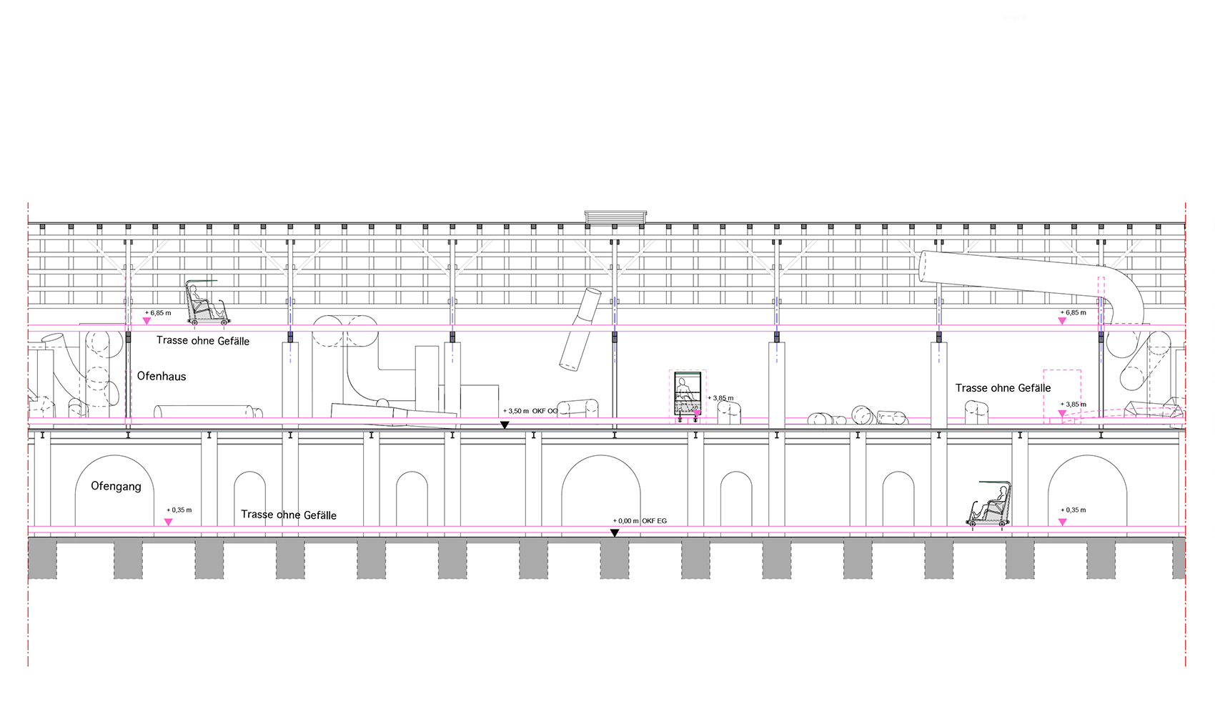 The theme of the successful competition design dating from 1999 is to enable the whole building to be viewed from carriages on rails. This avoided the need for elaborate traffic safety measures. The public can relax on the museum tour and enjoy a high quality museum experience. The carriages are drawn up a ramp to the highest point and then move down through the building by the power of gravity. The most urgent task is to safeguard the structure of the building, especially by repairing the roofs. Supervision of the safety and repair measures to make the complex suitable for its future use and implementing the competition design are the tasks in 2001.