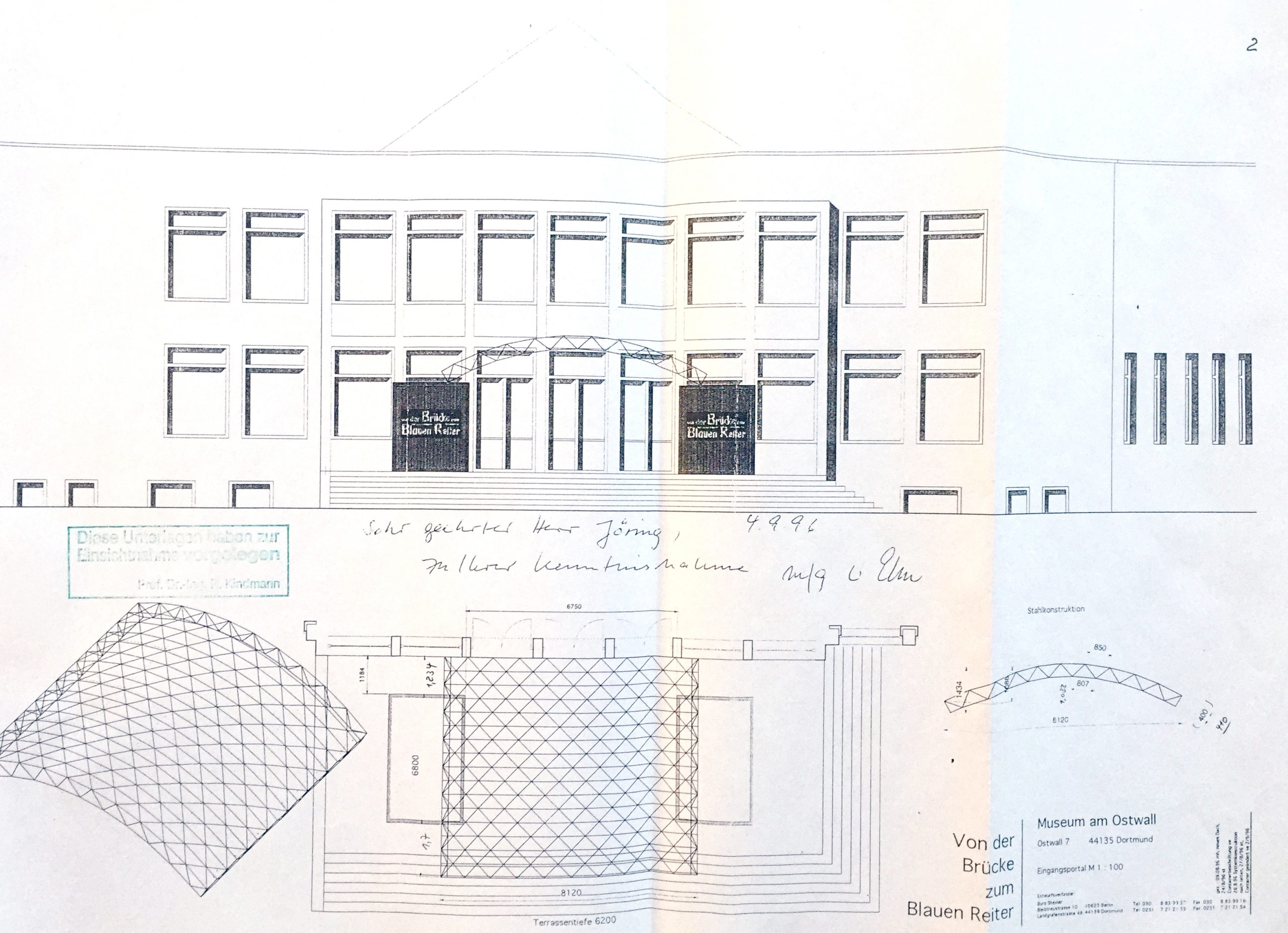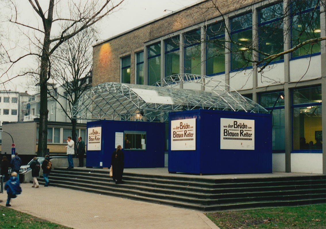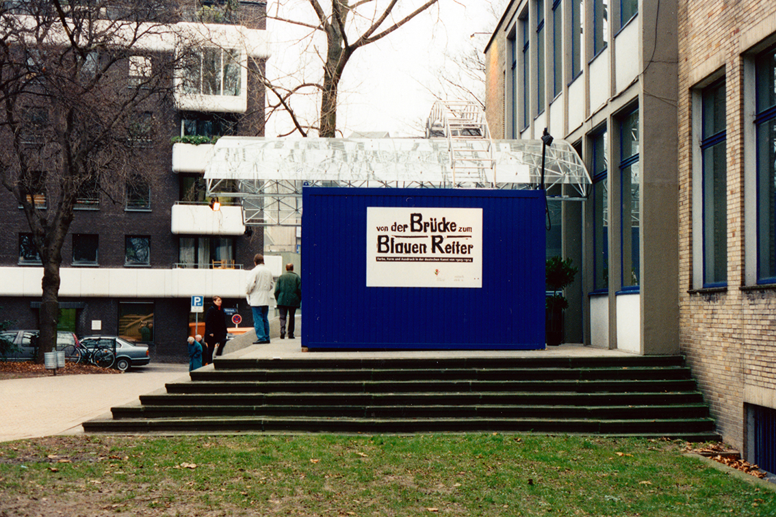 Für die Ausstellung Von der Brücke zum Blauen Reiter in Museum am Ostwall, bei der die rückwärtige Terrasse als Eingang benutzt wurde, beauftragte der Direktor des Hauses, Ingo Bartsch, das Büro Steiner mit dem Entwurf einer temporären Vordachkonstruktion, die zwei Container miteinbeziehen sollte.