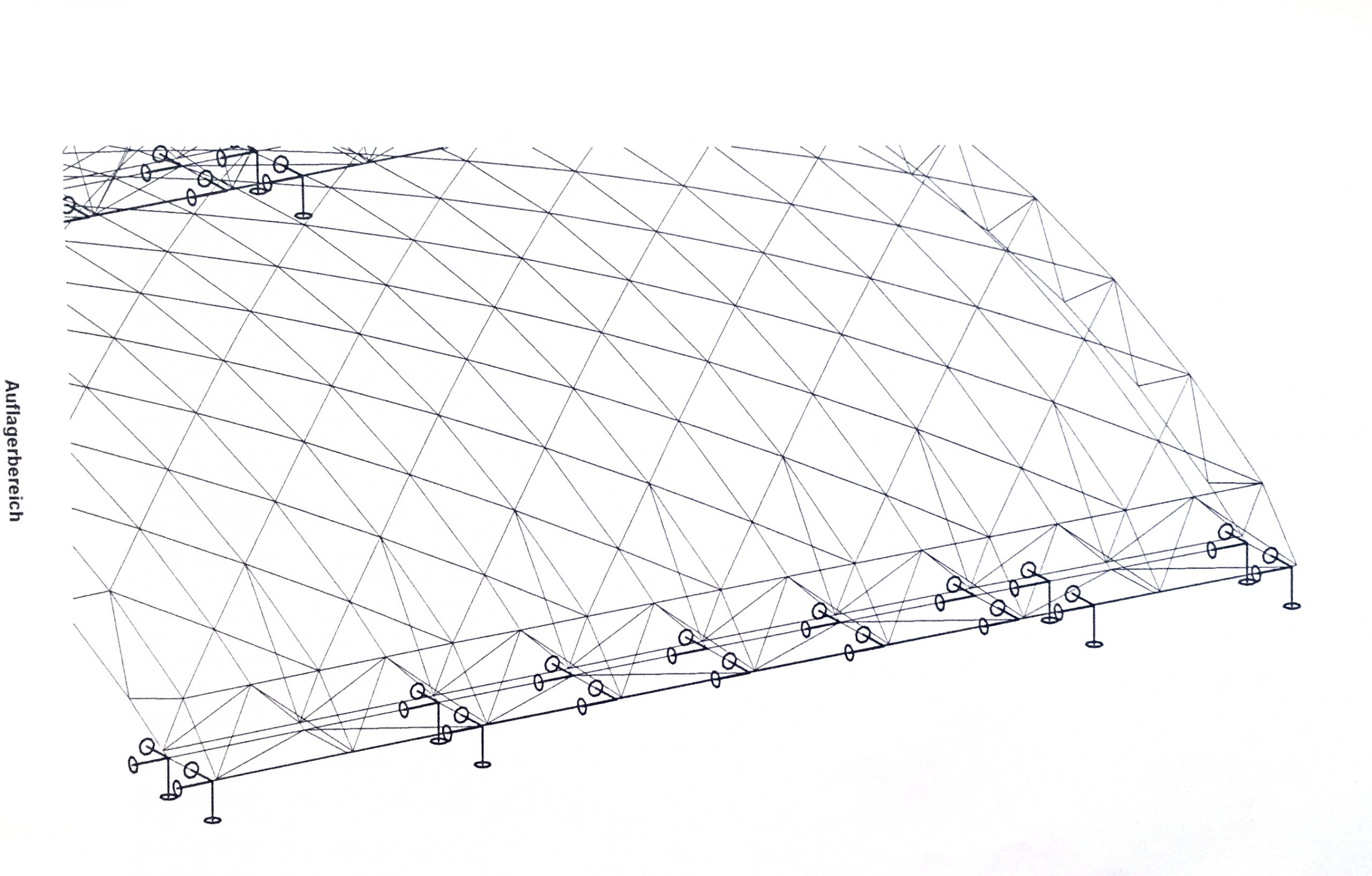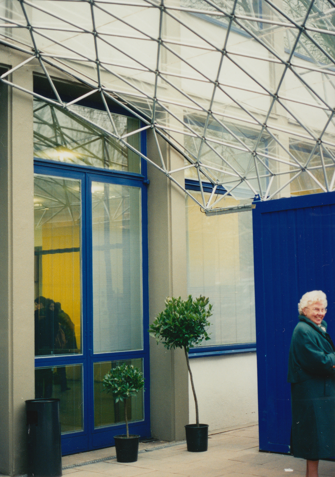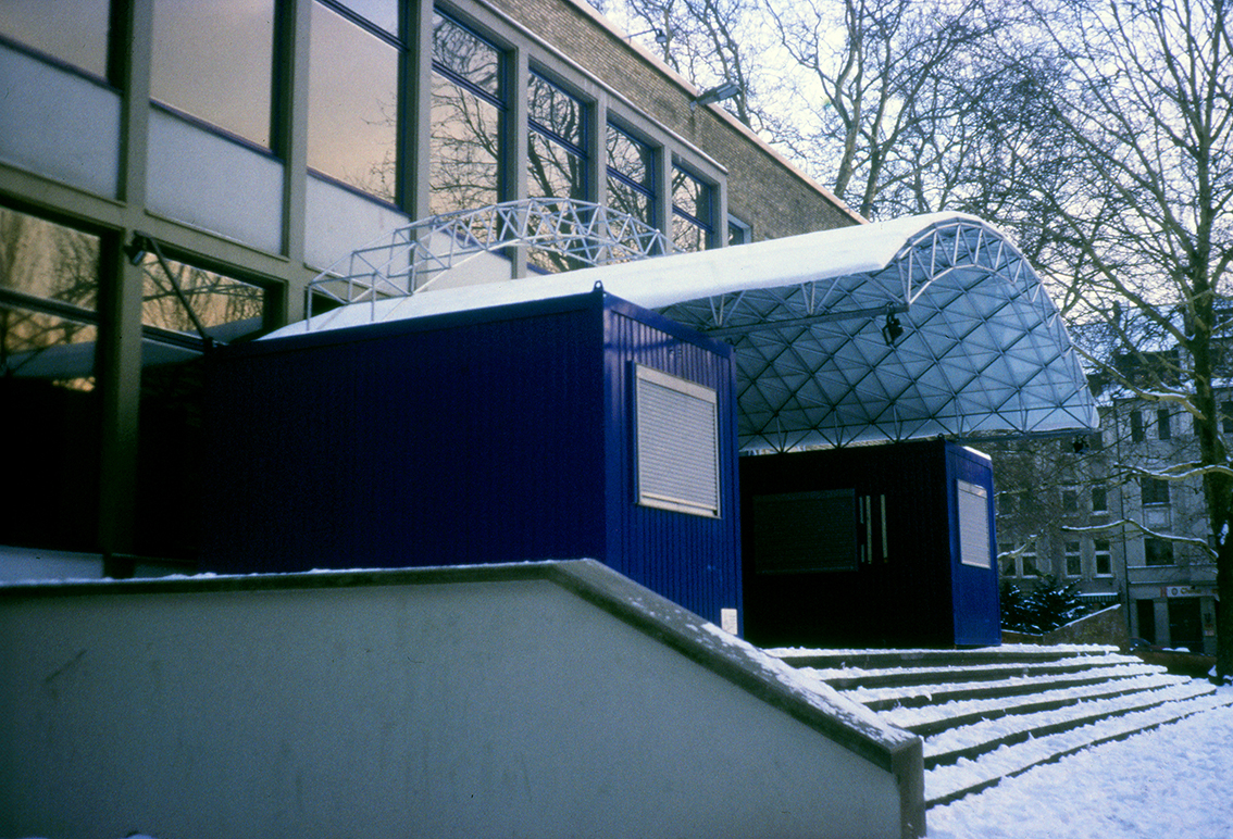 Die Container in Museum am Ostwall beherbergten Kasse und Garderobe. Ein einschaliges, tonnenförmig gebogenes Fachwerk aus System 180 wurde an den gebogenen Kanten durch flache Gitterträger zusätzlich versteift. Die linienförmgen Auflager auf den Containern wurden räumlich versteift. Auf die Konstruktion legte man von oben Sicherheitsglas, das befestigt und versiegelt wurde. Die Statik des gemeinsam mit der Firma System 180 GmbH in Berlin konstruierten Dachs wurde vom Büro Warns, Dortmund, rechnerisch nachgewiesen. Der Vorbau blieb lange stehen – die letzten drei Fotos wurde 2001 gemacht.