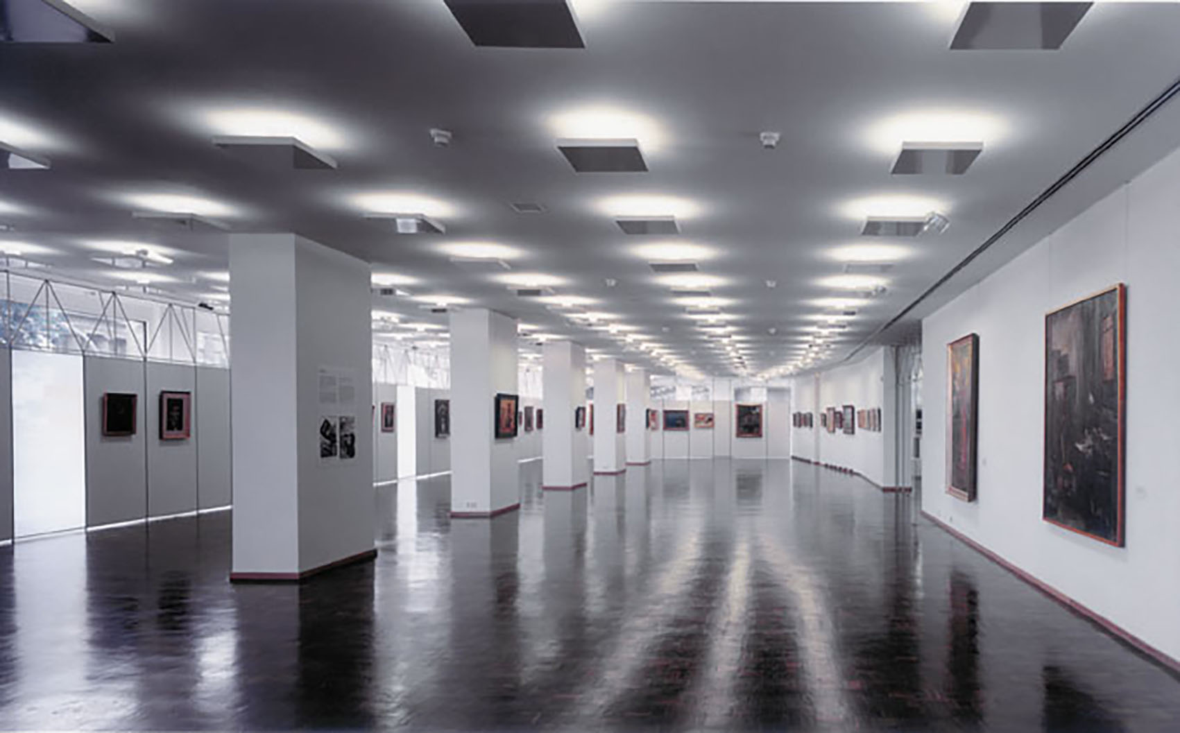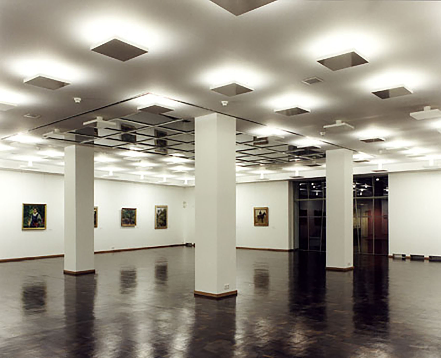 Ausgehend von den Gegebenheiten des Rohbaus, galt es, Wandflächen zu schaffen, um die neuen Räume museumsgerecht gestalten und ihrer Struktur und Verbindung nach dem Publikum eine klare Wegführung anbieten. Den Raum dominierten unregelmässige Stützenreihen – letztlich ein Unding für eine Ausstellungshalle. Jürg Steiner, der den Umbau leitete, funktionierte die Stützen in nutzbare Wandpfeiler um und synchronisierte deren Abstände mit dem regelmässigen Raster der Lichtinseln. Hinter den Schaufenstern wurde ein mobiles, teilweise mit mattiertem Glas ausgefülltes Wandsystem installiert. Durch diese Trenntüranlagen aus Glas wurde die Möglichkeit geschaffen, die dem räumlichen Nutzungskonzept entsprechenden Bereiche herzustellen, ohne jedoch die Räume in ihrer optischen Verbindung zu beeinträchtigen.