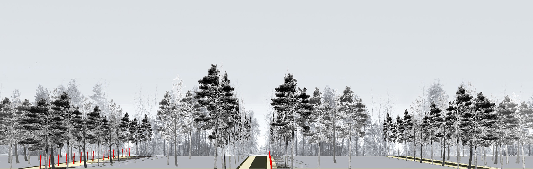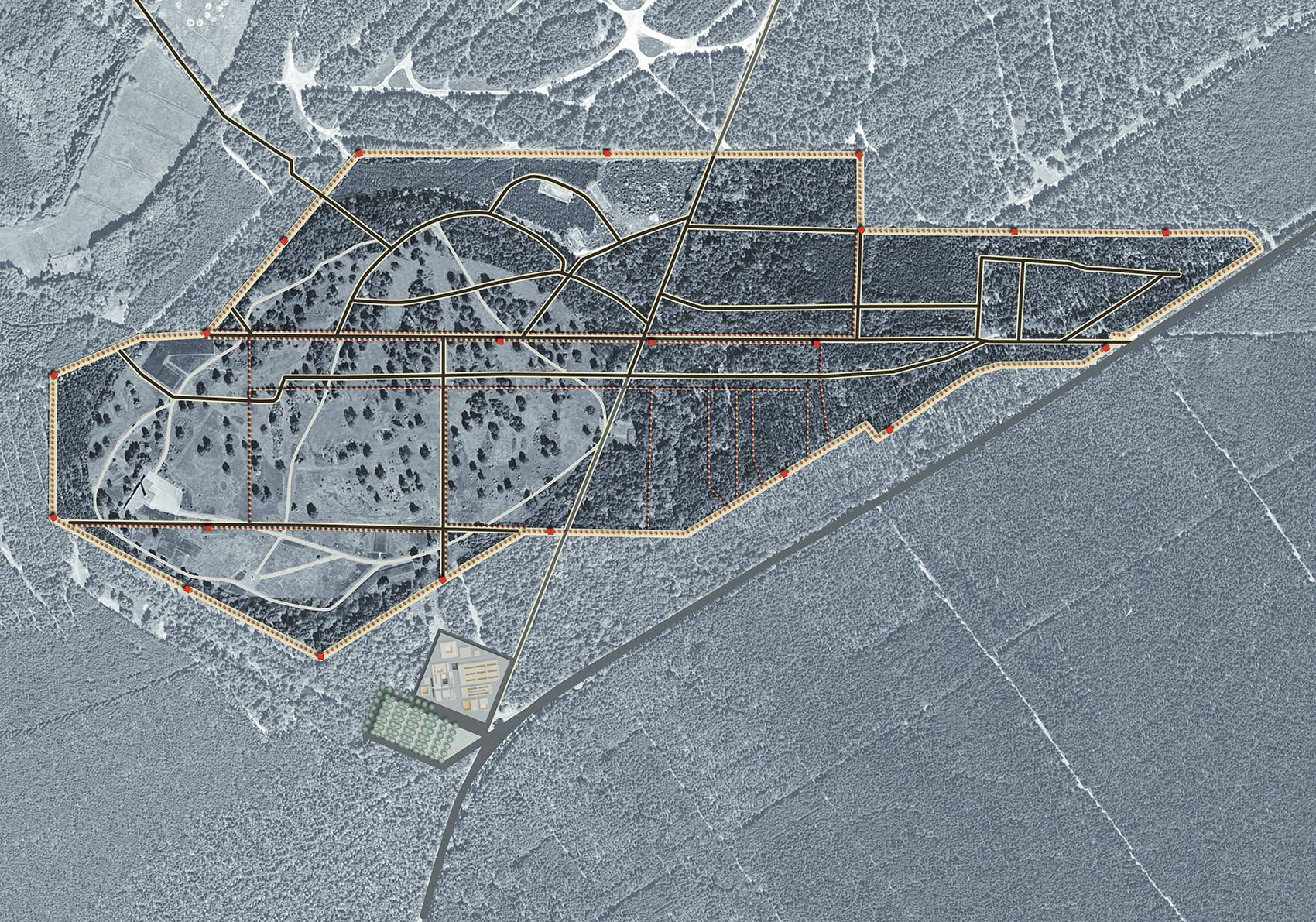 Das Lagergelände, als historischer Ort von weltweiter Bedeutung, soll in seiner Dimensionierung wieder erfahrbar gestaltet werden. Denn sowohl die Begrenzung des ursprünglichen Areals als auch dessen Struktur und Gliederung als Ort nationalsozialistischer Gewaltherrschaft ist heute nicht mehr nachvollziehbar. Daher geht der Entwurf von der Identifizierbarkeit des Lagerkomplexes und seines räumlichen Gefüges aus. Das neue Dokumentationszentrum orientiert sich an der historischen Landstraße von Walle nach Hörsten. Gleichzeitig erfolgt hierüber die Erschließung von Lagergelände und Gedenkstättenbereich. Die bereits bestehende Architektur wird durch eine Anzahl von Neubauten ergänzt, die den Charakter der Lagerstruktur einzelner Baukörper entwurflich aufnehmen. Das angestrebte Gefühl einer baulichen Einheit wird hergestellt durch eine ausladende Deckenplatte, die sich über die Gebäude legt und diese miteinander vernetzt. Die einzelnen Funktionen und Bauetappen sind Trabanten unter einem gemeinsamen Dach. Sie sind im Trockenen jeweils untereinander vernetzt. Gefluchtet an der wieder hergestellten Landstraße dynamisiert dieses Deckenelement durch seine Drehbewegung zu den Gebäudekanten das Gesamtgefüge des Zentrums.