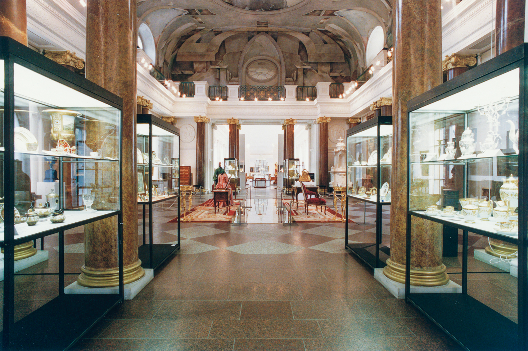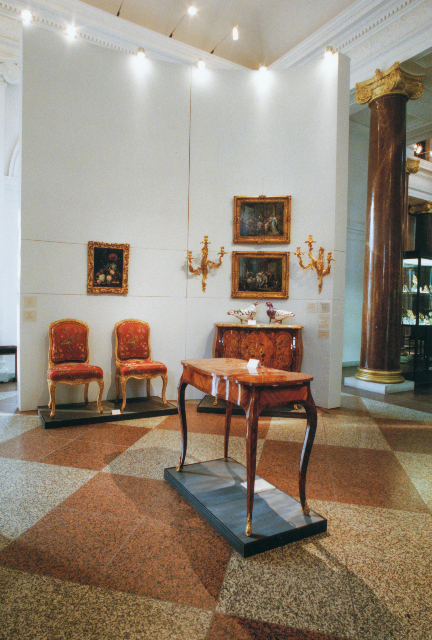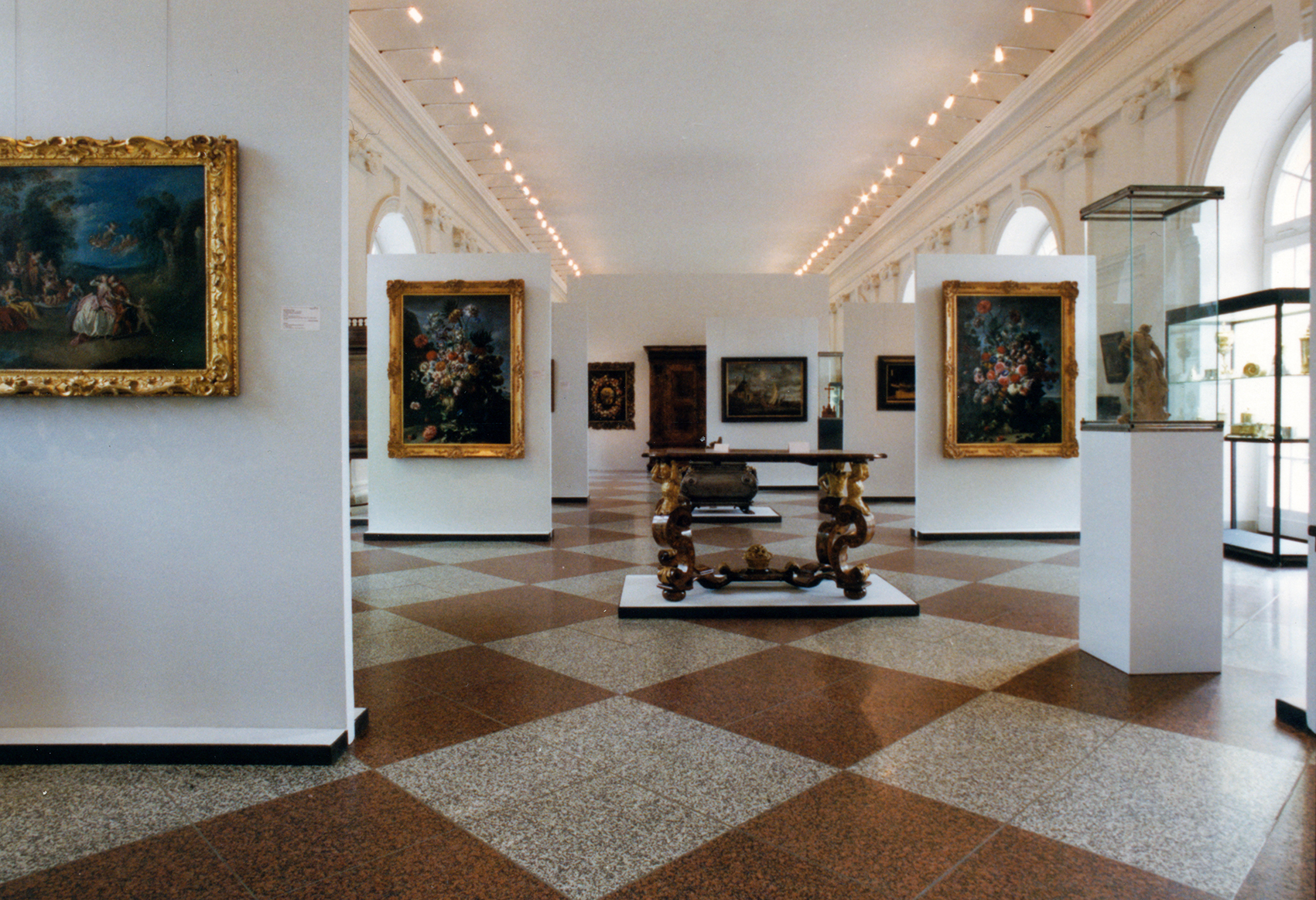 An Stromschienen hinter dem Wandabschlussprofil sind leichte Auslegerleuchten befestigt, die praktisch jeden Punkt in näherer Umgebung treffen. Die im Haus vorhandene, stimmungshemmende, indirekte Beleuchtung der beiden Flügel und die verflachenden Fluter des Deckenbildes in der zentralen Halle blieben ausgeschaltet.