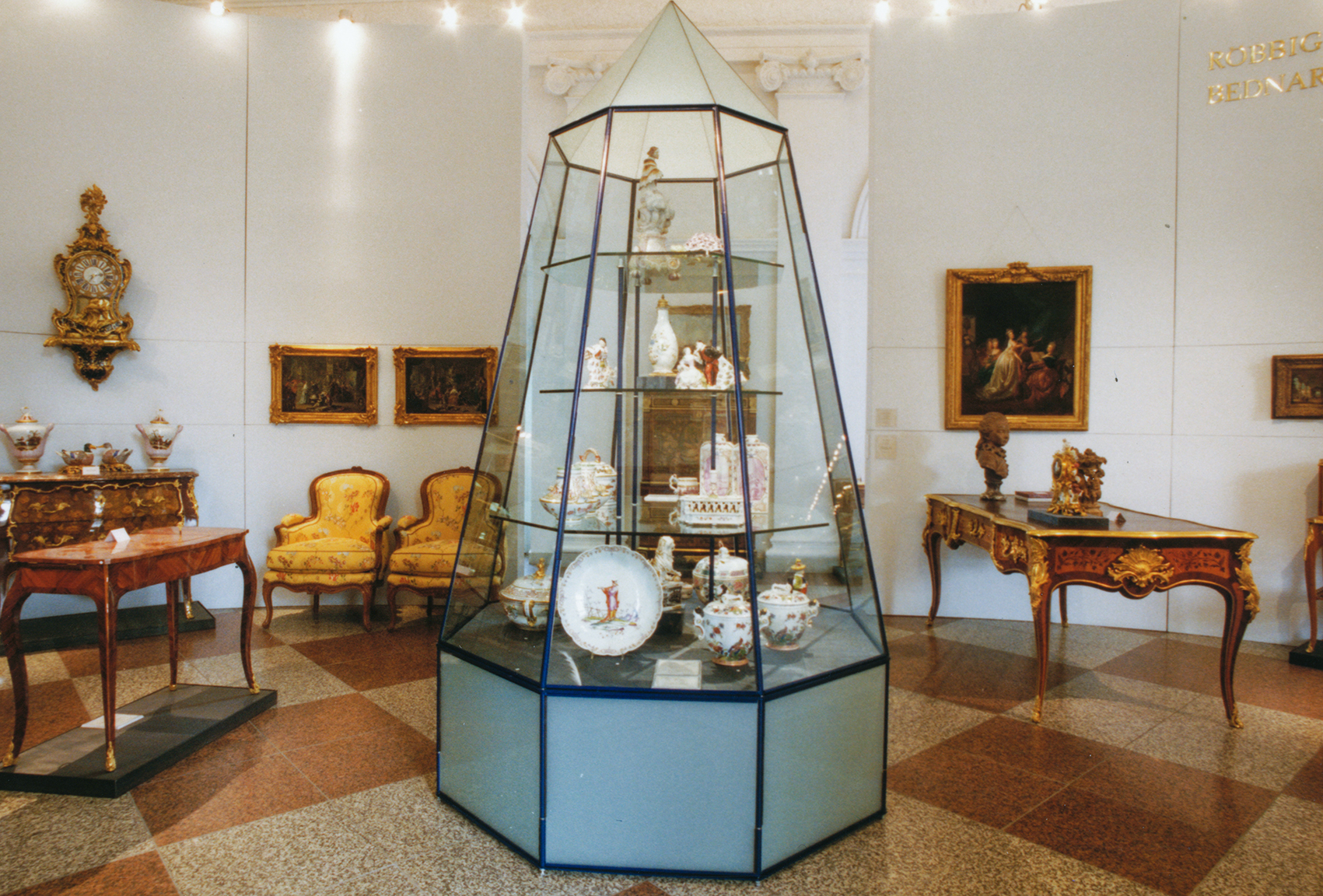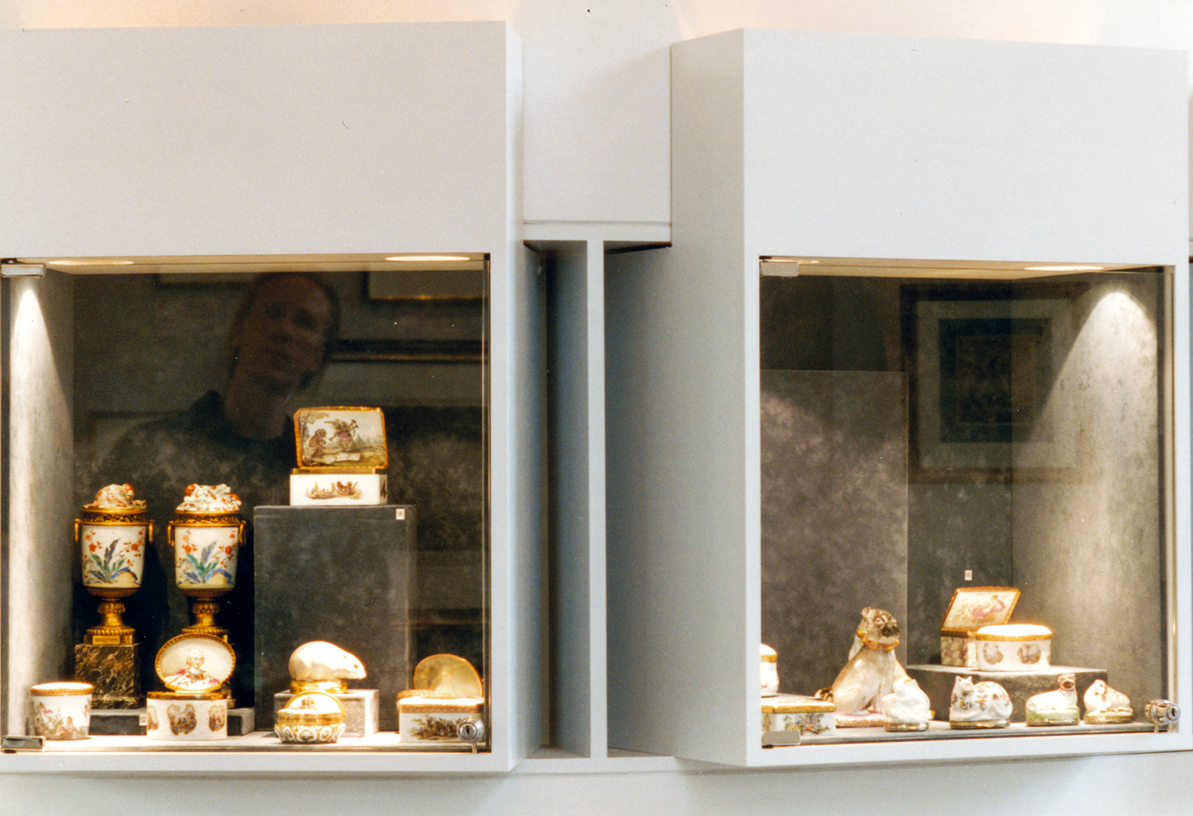 Zum ersten Mal wurde das Prinzip der Kunsthandelsmesse ohne Kojen durchbrochen. Einige Händler erhielten eigens für sie gestaltete Bereiche. Die erste Aufnahme zeigt eine hohe, frei einsehbare Vitrine, die für ein ganzes Ensemble konzipiert wurde: Das vollständige Service sollte möglichst originalgetreu auf edlen Tischtüchern präsentiert werden. Vitrinen dieser Art sind des Öfteren konzipiert worden. Ihre Statik beruht auf räumlichen Tektonik und der Stabilität von Einscheibensicherheitsglas, das an der Ober- und Unterkante von Glasleisten gehalten wird.