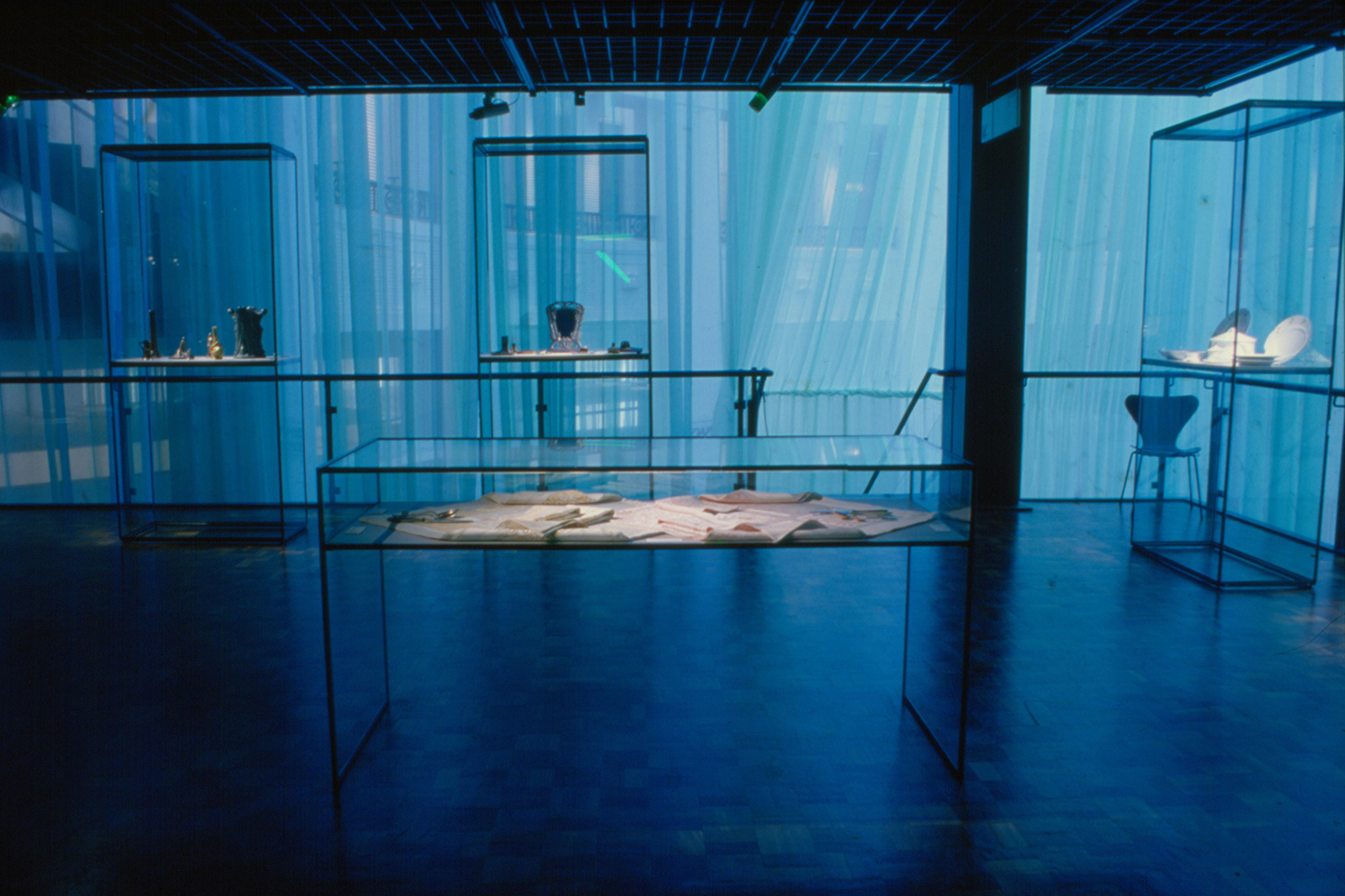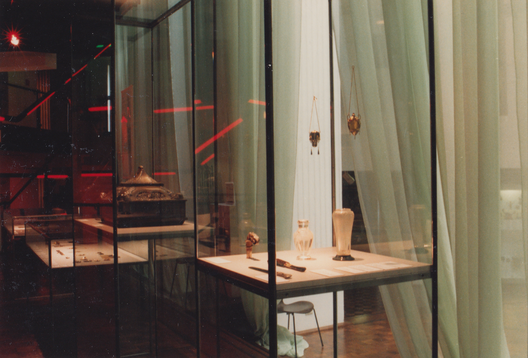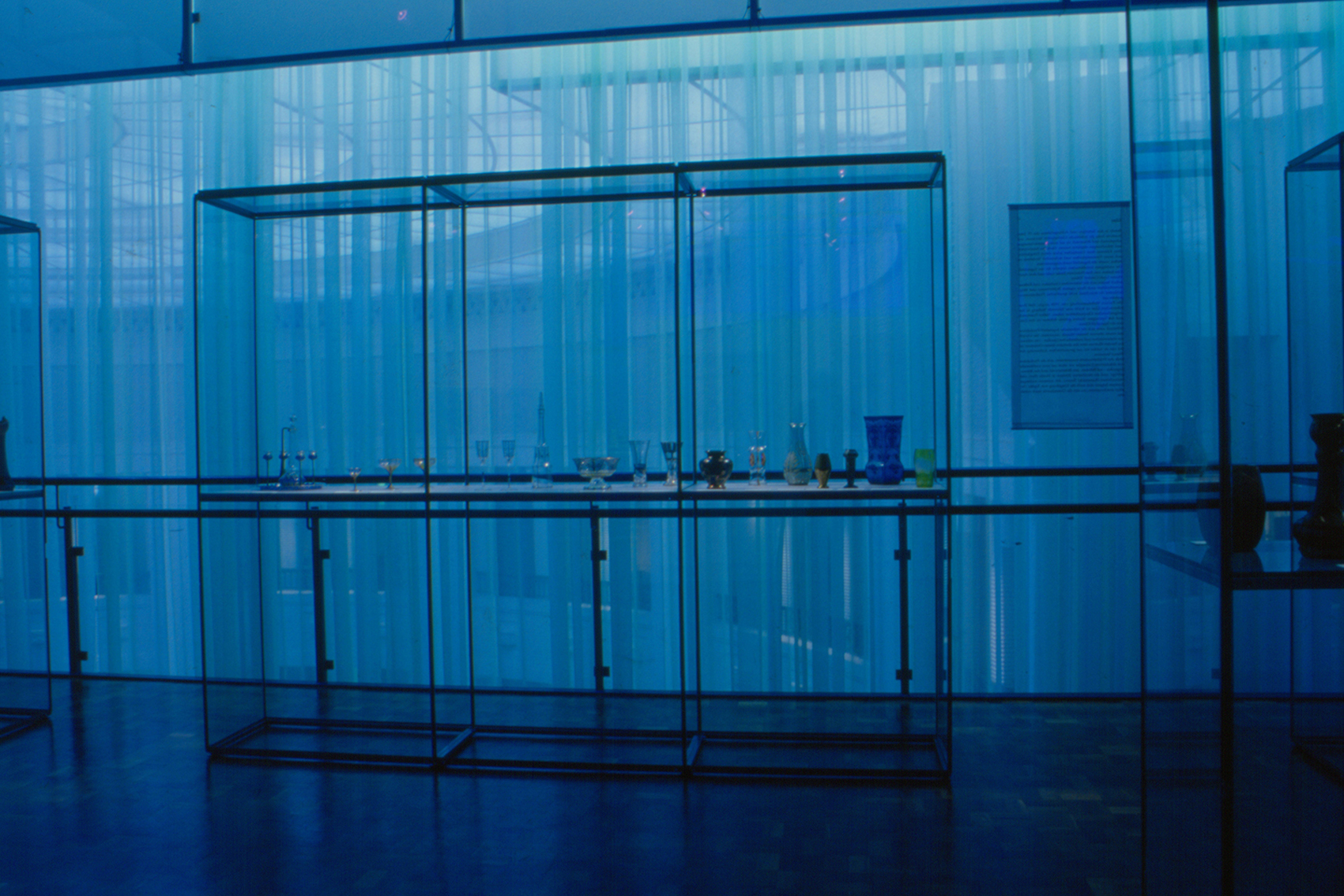 Mit einem hellgrünen Vorhang aus Schleiernessel wurden die über mehrere Geschosse reichenden Ausstellungsflächen gegen das helle Licht aus der Rotunde des Hauses geschützt. Das Grundlicht im Ausstellungsraum hatte eine lila Tönung, sodass hier das Licht auf dem Vorhang eine andere Wirkung erzeugte. Das neu entwickelte modulare Vitrinensystem unterstützte die minimalistische Gestaltungssprache. Durch gerichtete Spots zeigten sich die Objekte im richtigen Licht.