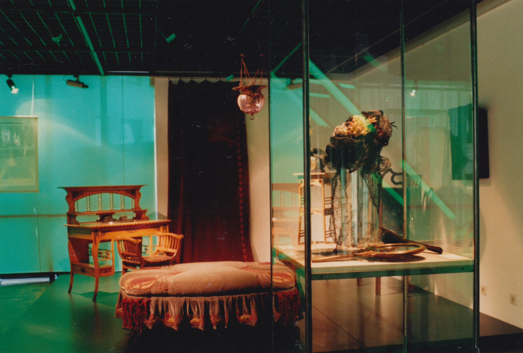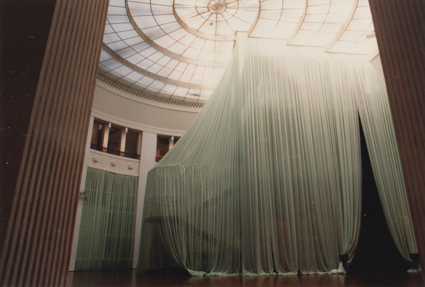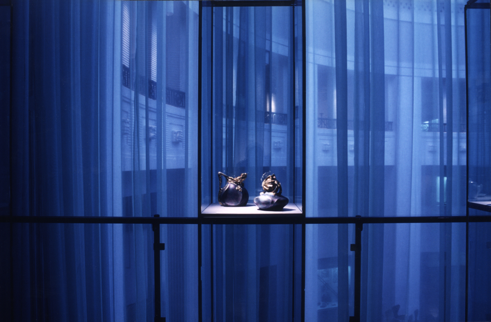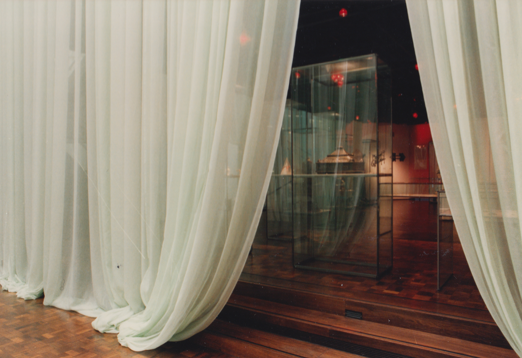 Mit einem hellgrünen Vorhang aus Schleiernessel wurden die über mehrere Geschosse reichenden Ausstellungsflächen gegen das helle Licht aus der Rotunde des Hauses geschützt. Das Grundlicht im Ausstellungsraum hatte eine lila Tönung, sodass hier das Licht auf dem Vorhang eine andere Wirkung erzeugte. Das neu entwickelte modulare Vitrinensystem unterstützte die minimalistische Gestaltungssprache. Durch gerichtete Spots zeigten sich die Objekte im richtigen Licht.
