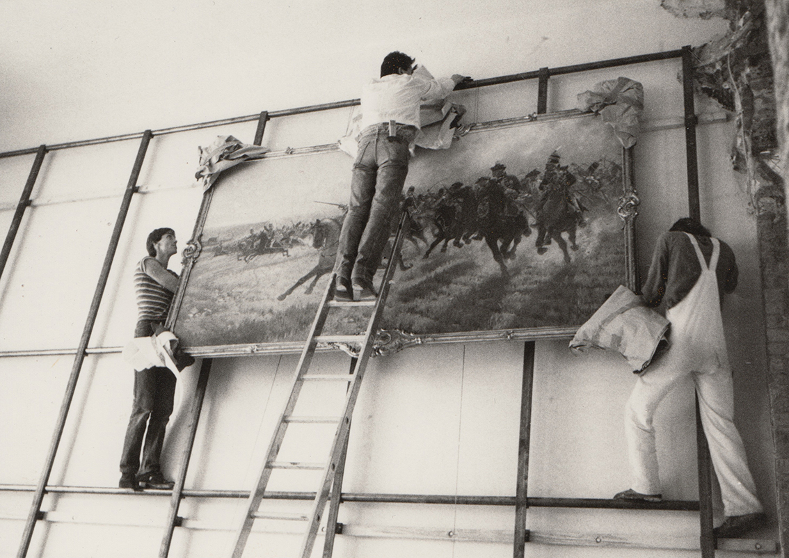 Die letzten beiden Bilder zeigen den Produktionsleiter im Einsatz: das erste in der Luft bei der Hängung  eines historistischen Bildes im heutigen Eingangsfoyer mit Bernhard Nägele und Thomas Kupferstein und das zweite am Boden kurz vor dem Hochziehen des Ballons mit Dieter Vorsteher und Martin Dostal.