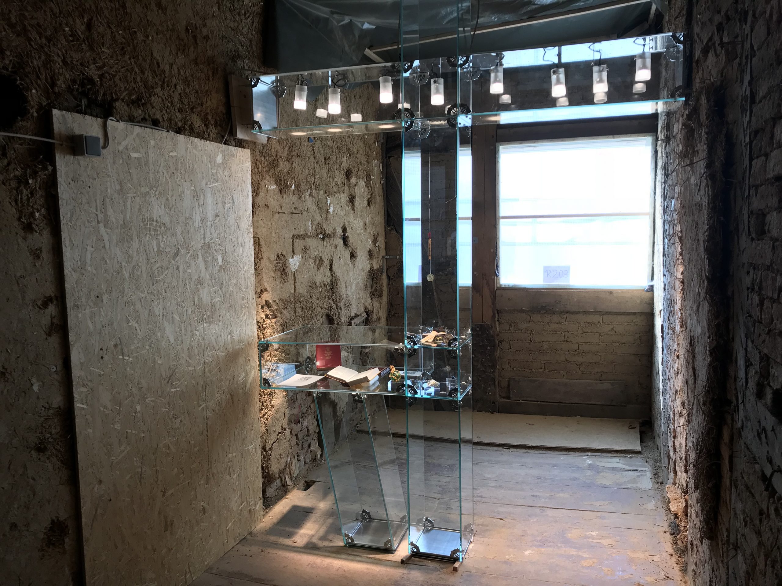 Dabei standen gestalterische und technische Überlegungen genauso im Vordergrund wie die Einpassung der Fachwerkvitrine in das Baudenkmal. Zu überprüfen galt es auch die Beleuchtung, die ausschließlich im oberen Riegel der Fachwerkvitrine untergebracht ist.
