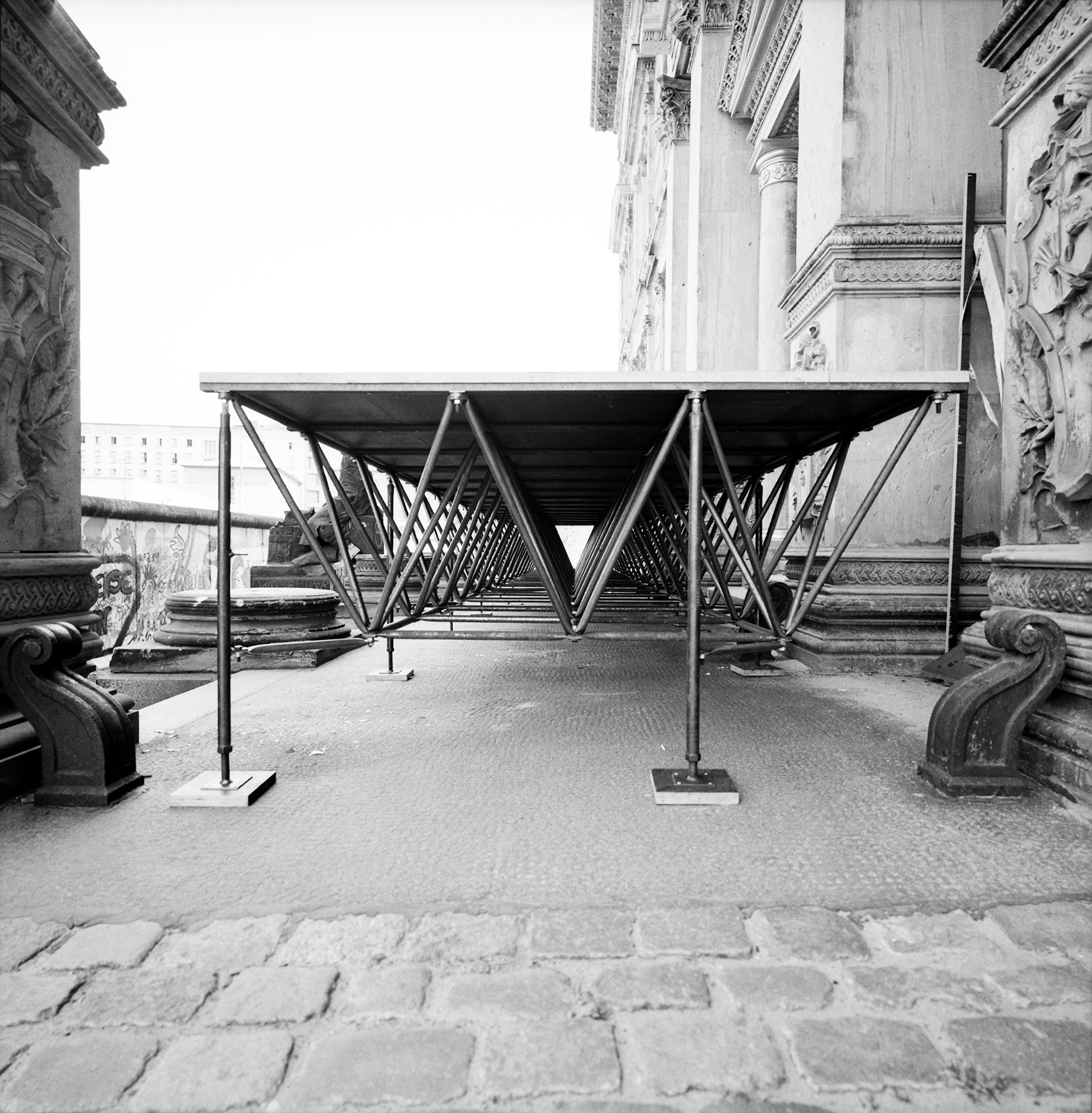 Obwohl es Freude macht, das System 180® in Form von Design-Objekten zu zeigen, gab es immer wieder Umstände, bei denen die Rohre mit flachgepressten Enden wegen ihrer konstruktiven Qualität zum Einsatz kamen. Der modulare Aufbau erlaubte auch in Situationen mit wenig Bewegungsfreiheit stabile Konstruktionen. Ein gutes Beispiel ist die temporäre Rampe am damaligen Hintereingang des Martin-Gropius-Baus. Ein direkter Zugang quer zum Gebäude war nicht möglich, weil nahe am Gebäude die Mauer, und noch näher die Grenze zu Ost-Berlin verlief. Schwere Exponate gelangten über die Rampe ins Museum, sie konnten seitlich entlang der Rampe bis zum heutigen Haupteingang gefahren und dann um 90 Grad gedreht werden. Beauftragt wurde die Rampe von der Kunstspedition Hasenkamp, Köln.