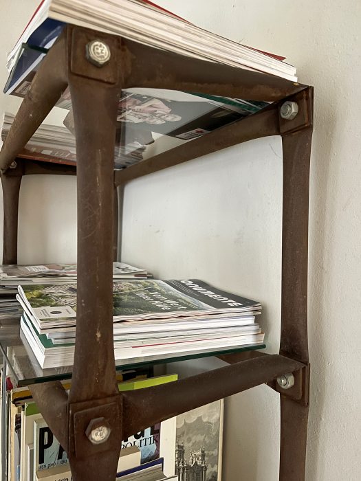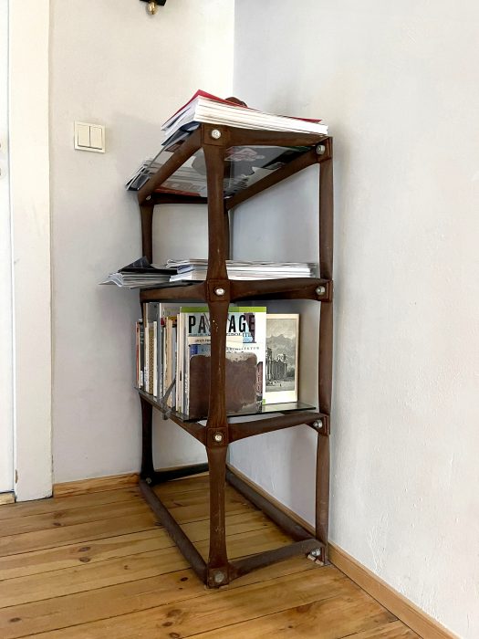 Auf dem Gemeinschaftsstand zeigten wir unser Regal mit den Maßen in 1200 (Höhe), 1400 (Breite), 300 (Tiefe) in Millimetern aus Stahlrohr 30/1,5 Millimeter, das ursprünglich grau lackiert und mit vier Sicherheitsglasplatten ausgestattet war. Stabilität erreichte das Regal Möbelmesse 1, wie wir es später nannten, ohne Diagonalen durch die unterschiedliche