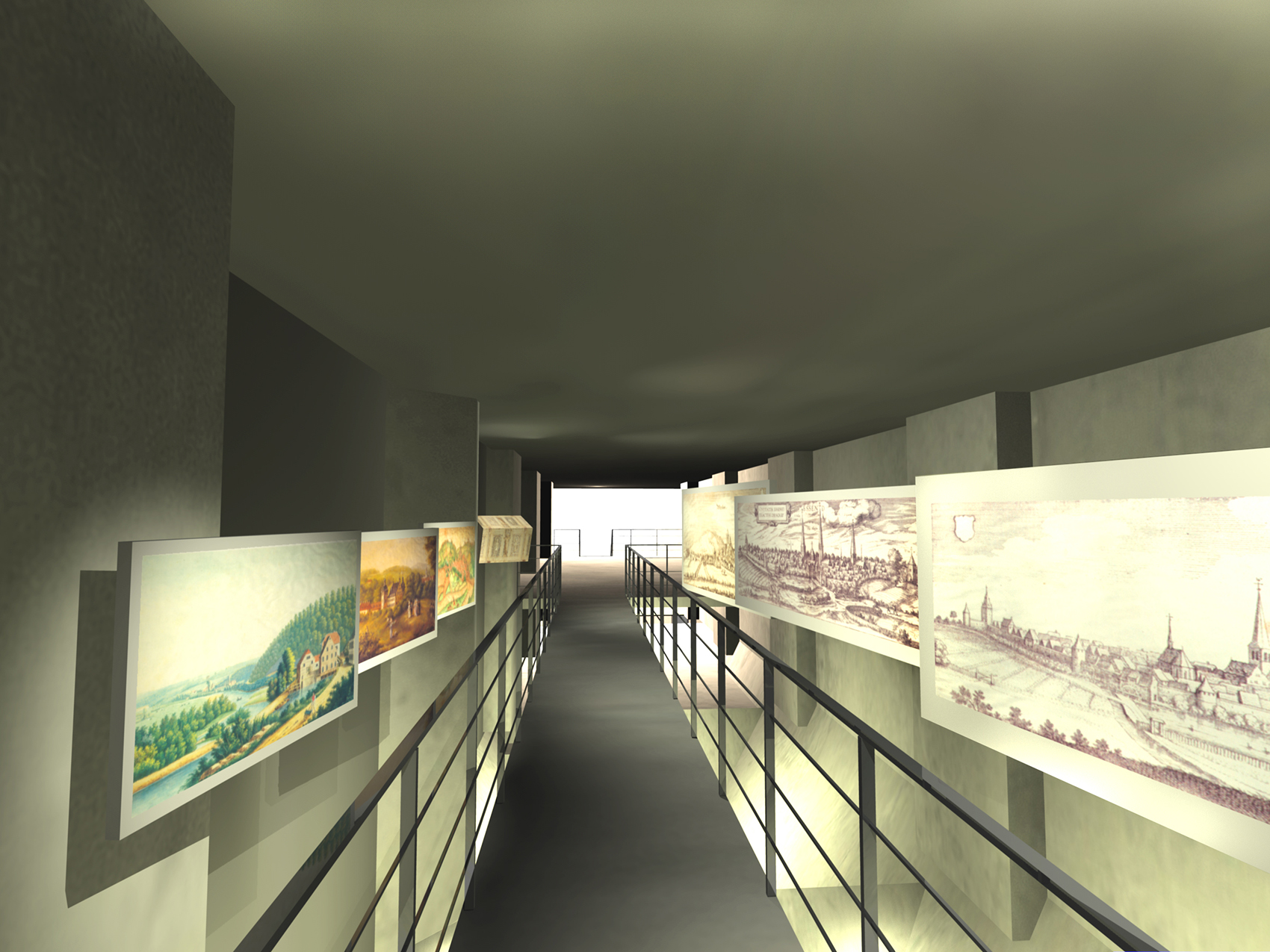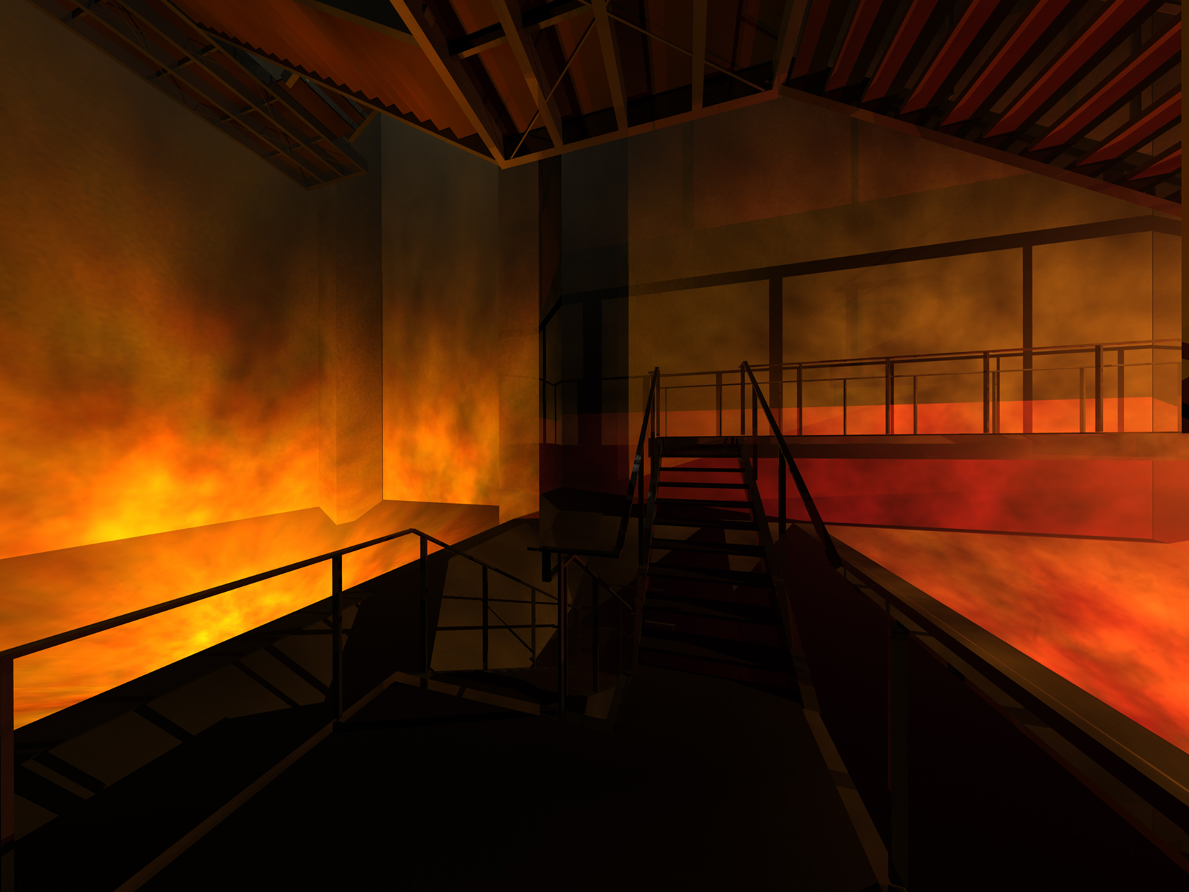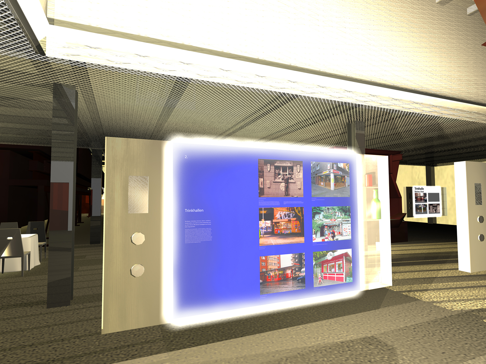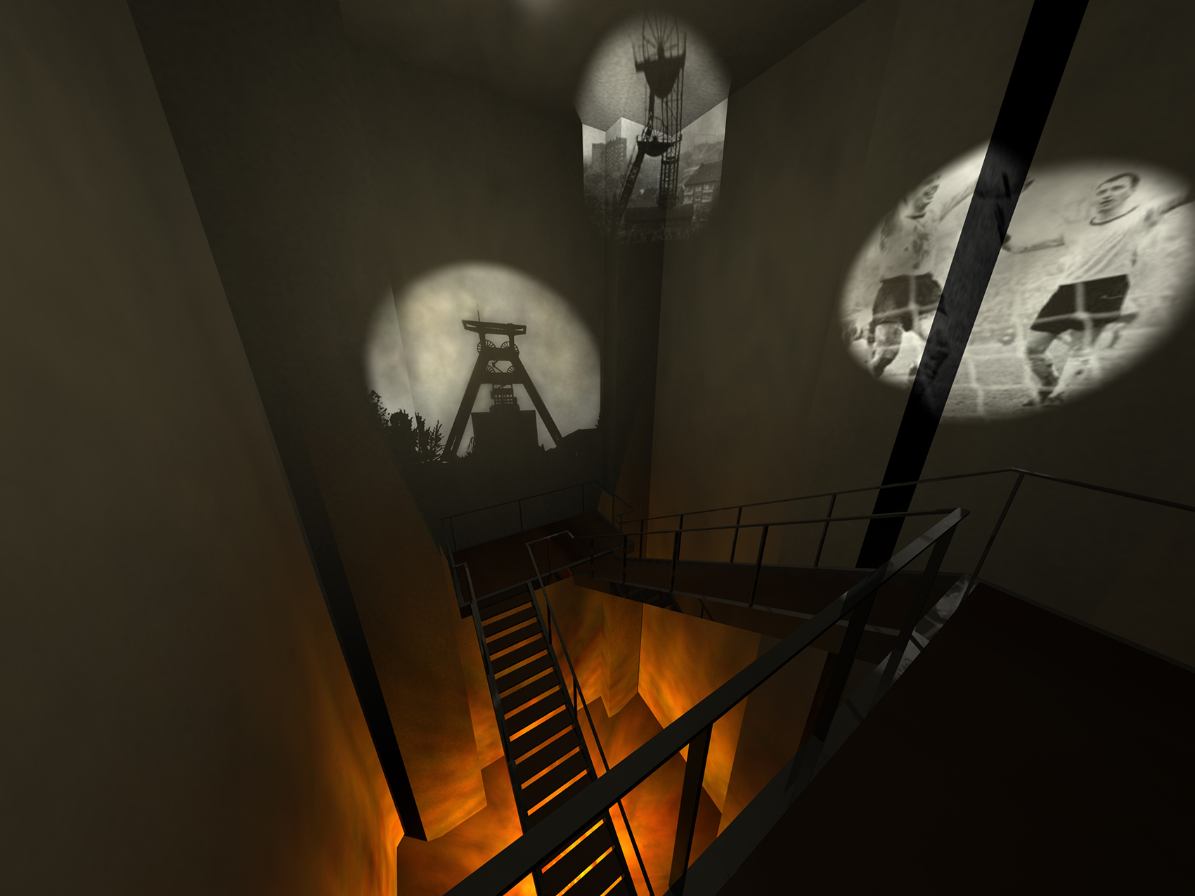 Während des SONNENAUFGANGES liest der Besucher auf den WANDZEITUNGEN über tatsächliche Besonderheiten er Region. Am MORGEN studiert der Besucher historische Karten und Bildstatistiken. Die monumentalen Becherwerke schaffen das Ambiente für eine SCHULE der aufregenden Art. Gegen MITTAG betritt man das MUSÉE SENTIMENTAL und schwelgt in den Erinnerungen an frühere Zeiten. Im tief stehenden Licht des NACHMITTAGES durchschreiten die Besucher die KUNST- UND WUNDERKAMMERN in den alten Kohlebunkern. Der Abend ist zur NACHT geworden und die Besucher beenden den Rundgang durch das Feuer, welches diese Region einst formte.