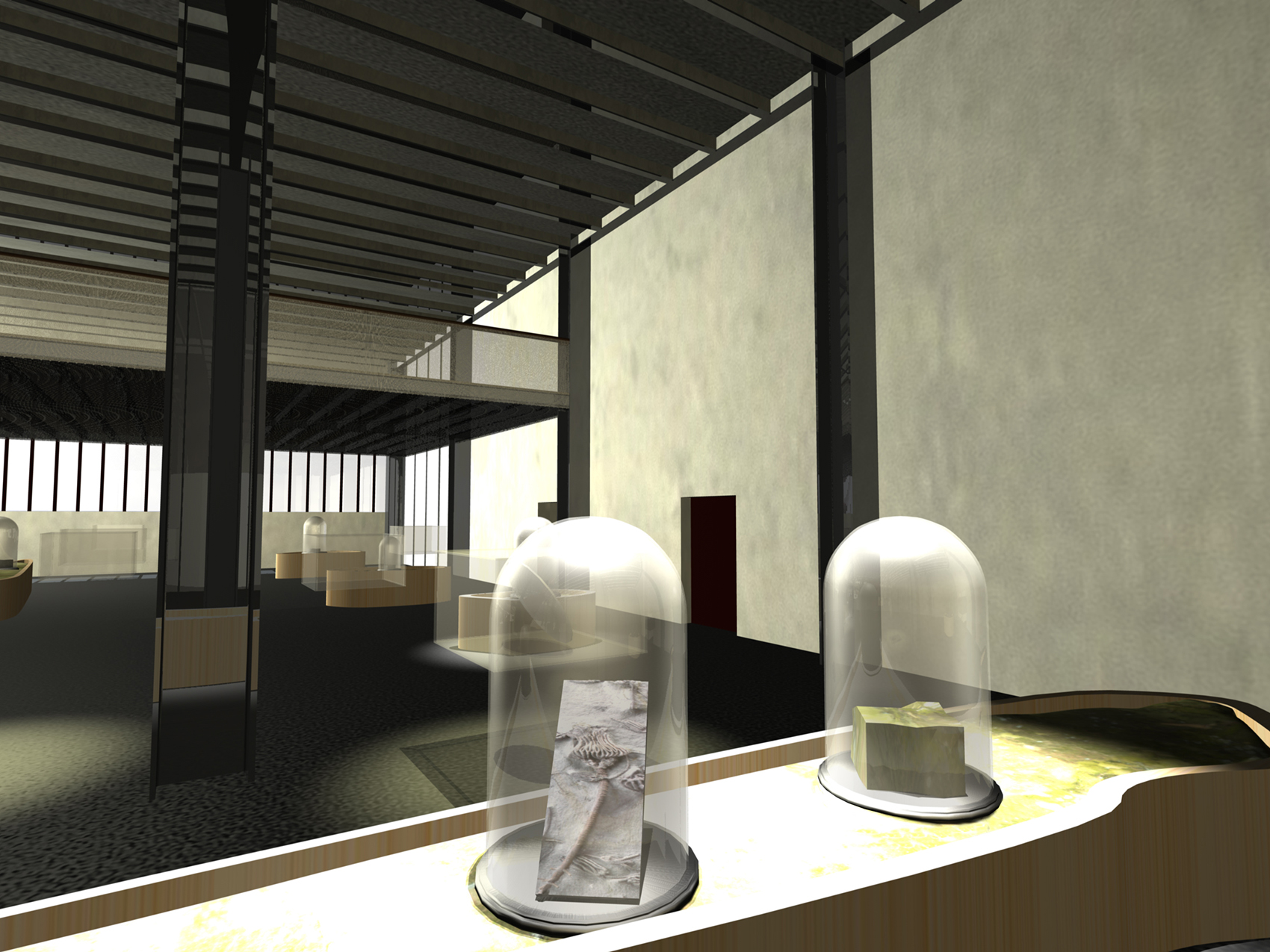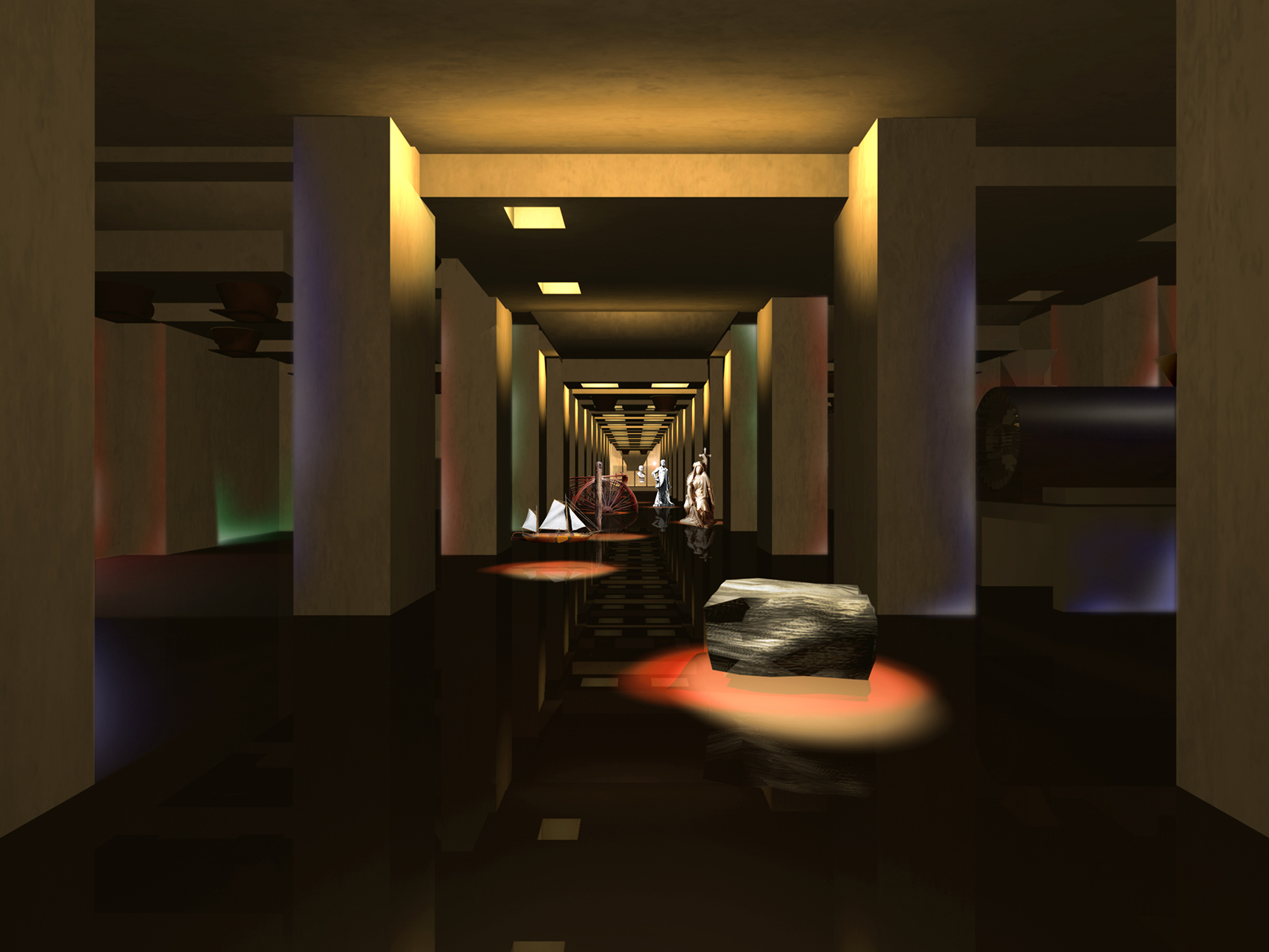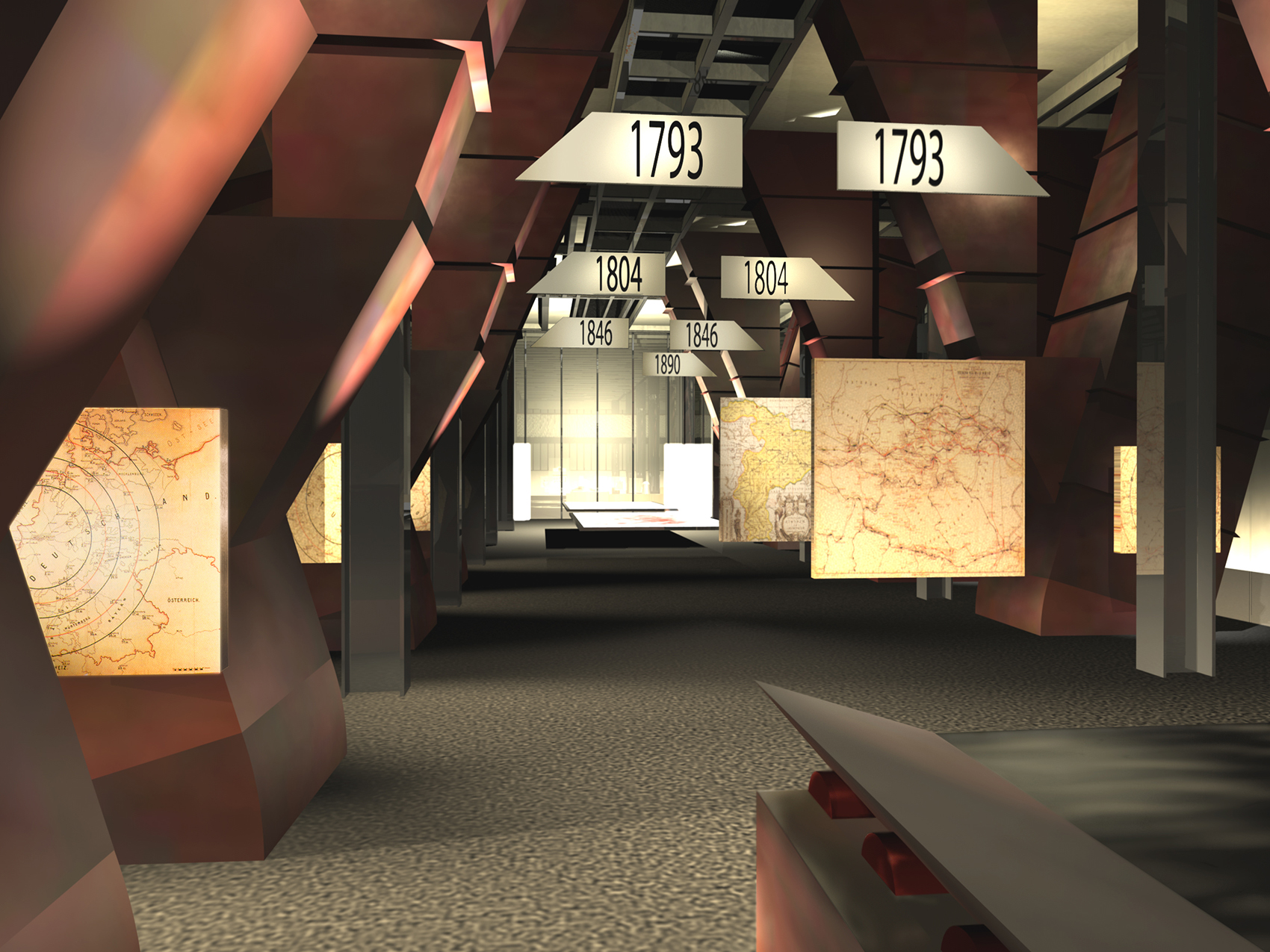 Während des SONNENAUFGANGES liest der Besucher auf den WANDZEITUNGEN über tatsächliche Besonderheiten er Region. Am MORGEN studiert der Besucher historische Karten und Bildstatistiken. Die monumentalen Becherwerke schaffen das Ambiente für eine SCHULE der aufregenden Art. Gegen MITTAG betritt man das MUSÉE SENTIMENTAL und schwelgt in den Erinnerungen an frühere Zeiten. Im tief stehenden Licht des NACHMITTAGES durchschreiten die Besucher die KUNST- UND WUNDERKAMMERN in den alten Kohlebunkern. Der Abend ist zur NACHT geworden und die Besucher beenden den Rundgang durch das Feuer, welches diese Region einst formte.