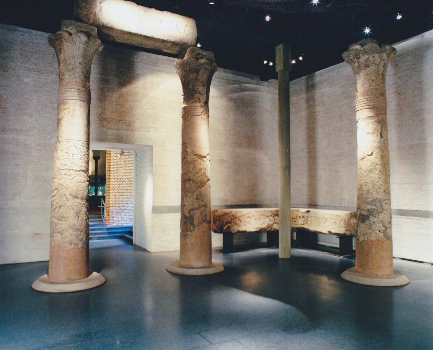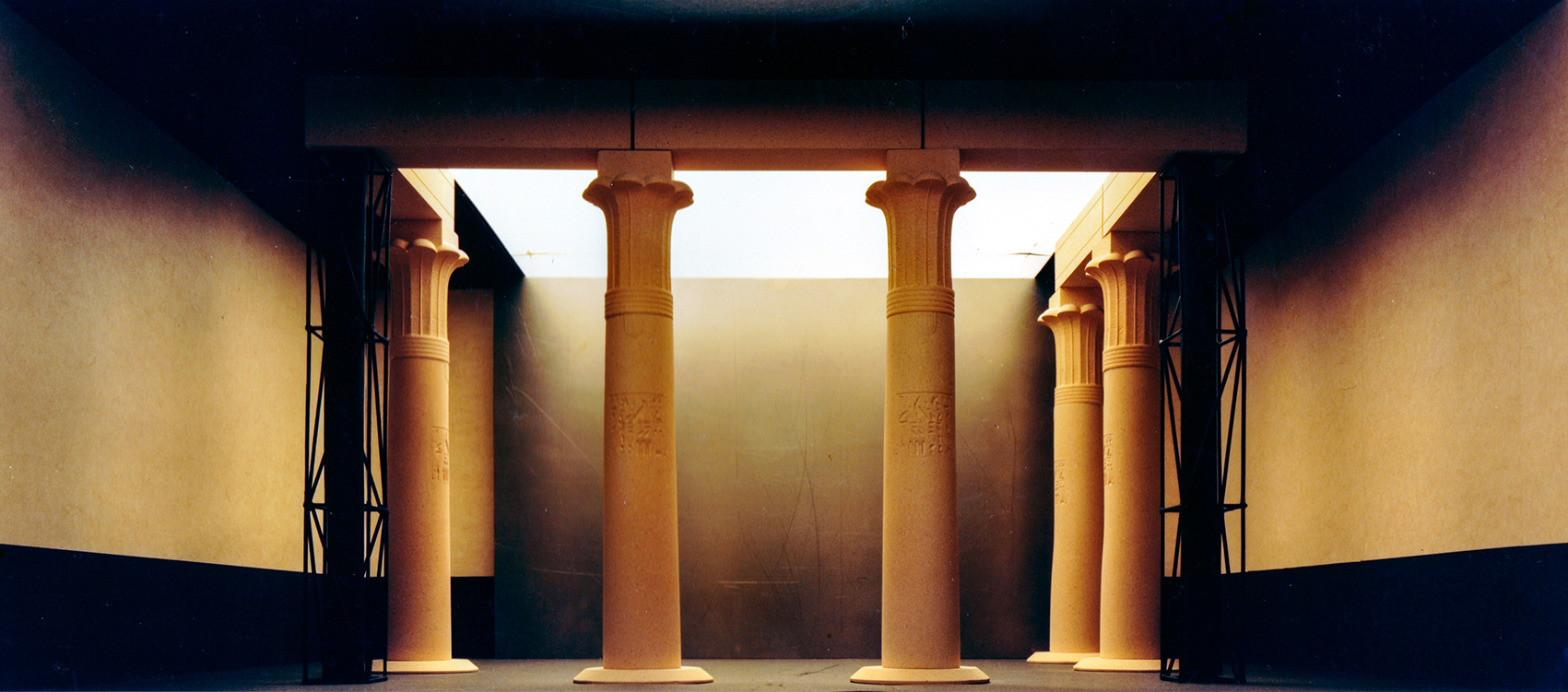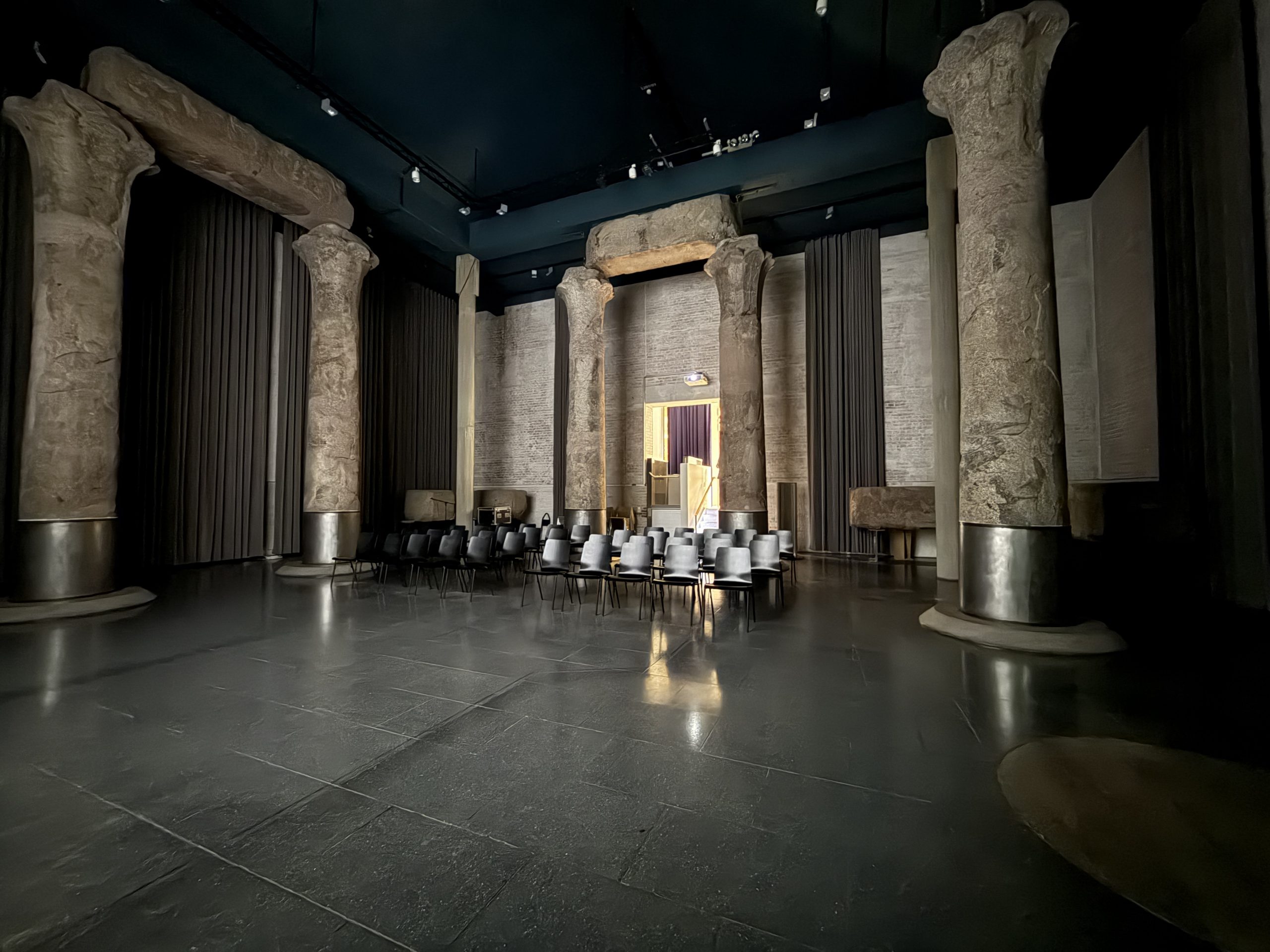 Ralf Schüler baute ein fensterloses Gebäude an die Museumsräume in Berlin-Charlottenburg. Doch über sein Innenraumkonzept entzweiten sich Bauherrin und Architekt. So betraute die Senatsbauverwaltung und der Direktor des Ägyptischen Museums, Dietrich Wildung, das Büro Steiner mit der Innenausstattung: Geschlämmte Wände, dunkler Deckenraum und Kunststeinboden erzeugten einen spannenden Dialog des Fragmentarischen. Die ersten beiden Bilder sind vom Arbeitsmodell. Die letzten beiden zeigen den Raum am 26. Juli 2025 als Kinosaal der Sammlung Scharf-Gerstenberg, die hier nach dem Auszug des Ägyptischen Museums ihr Domizil gefunden hat.