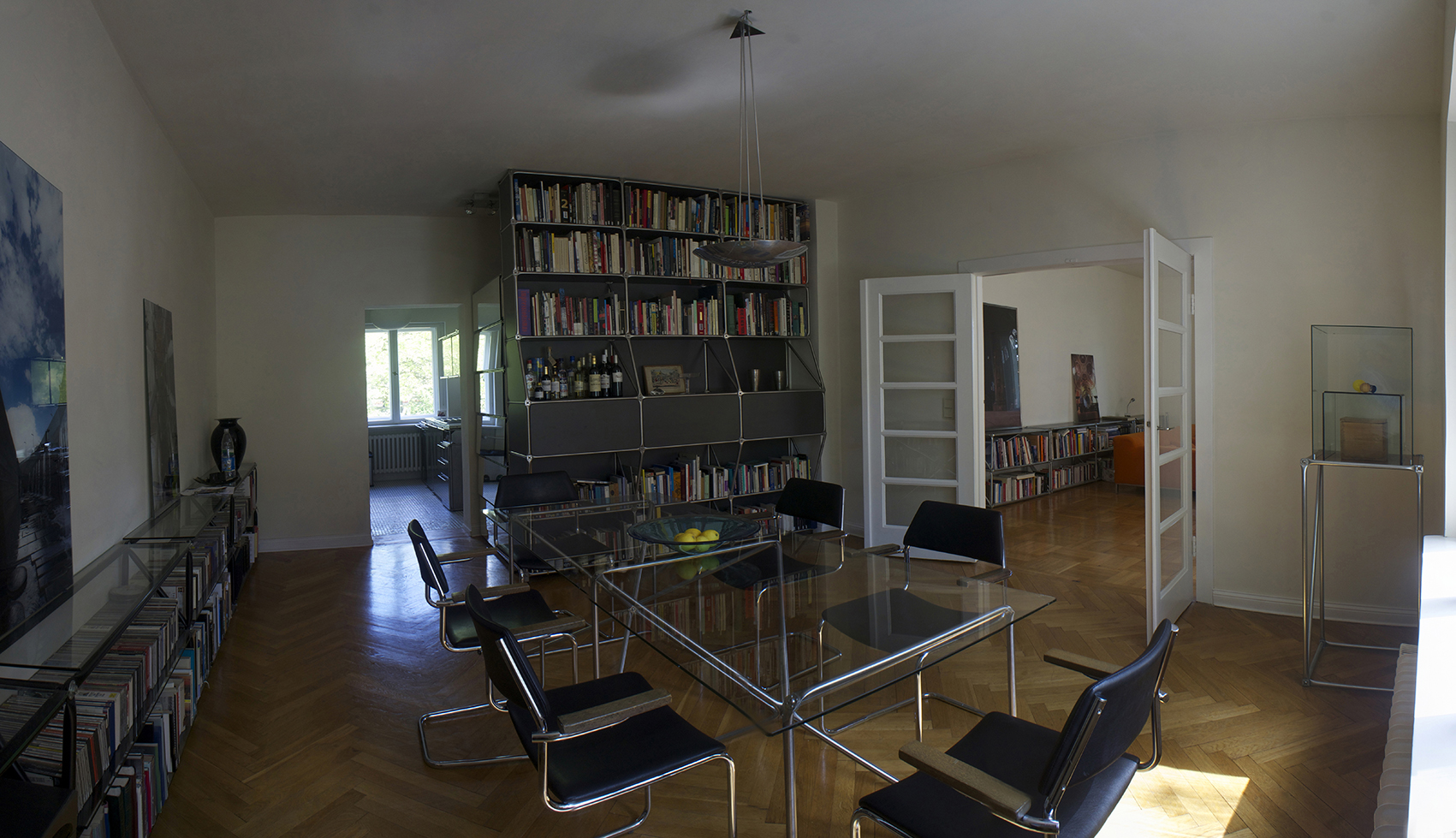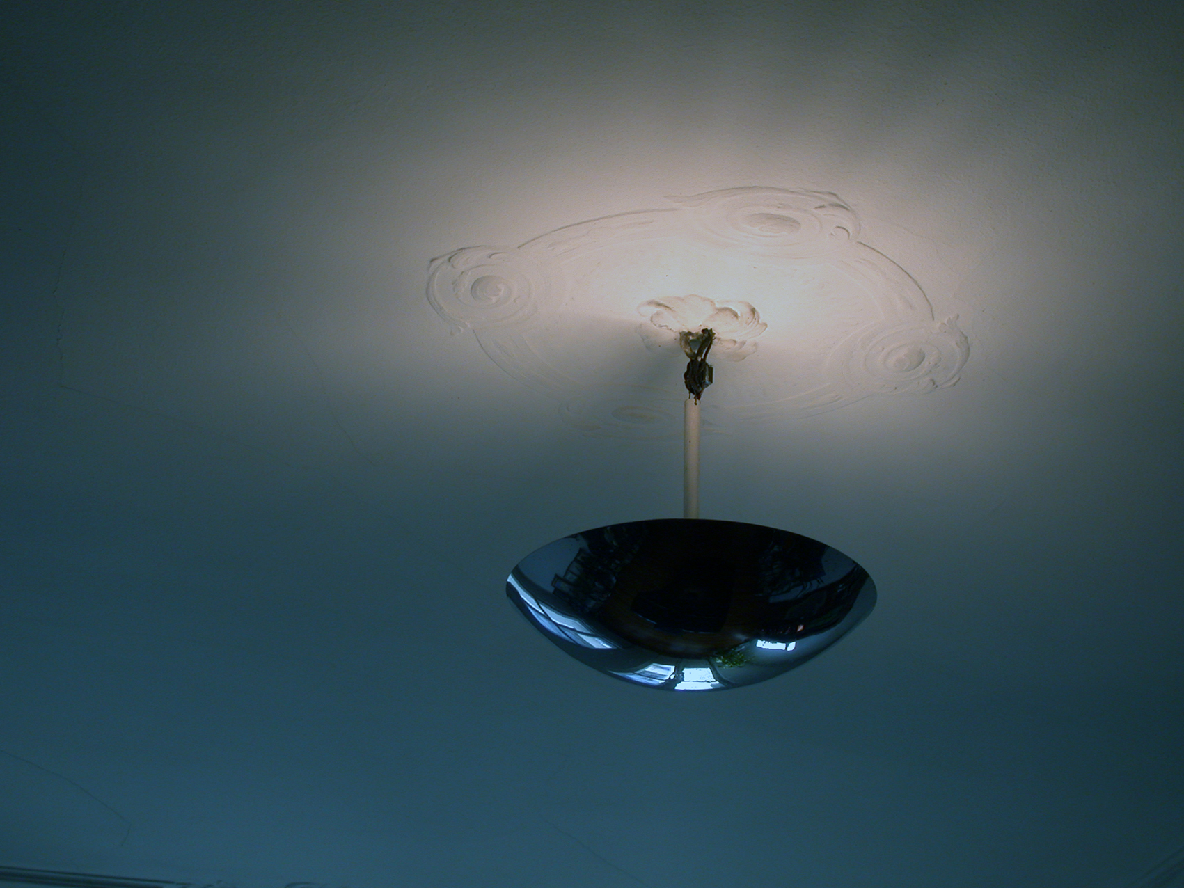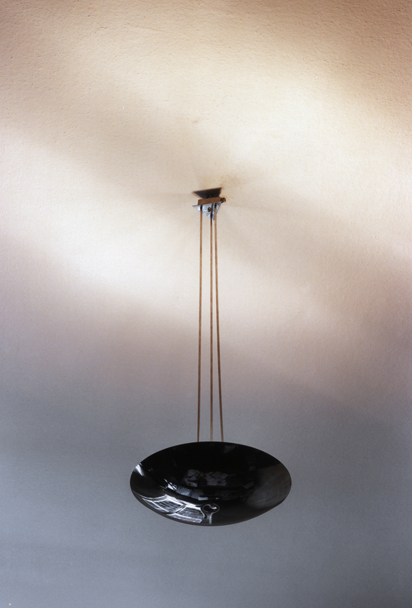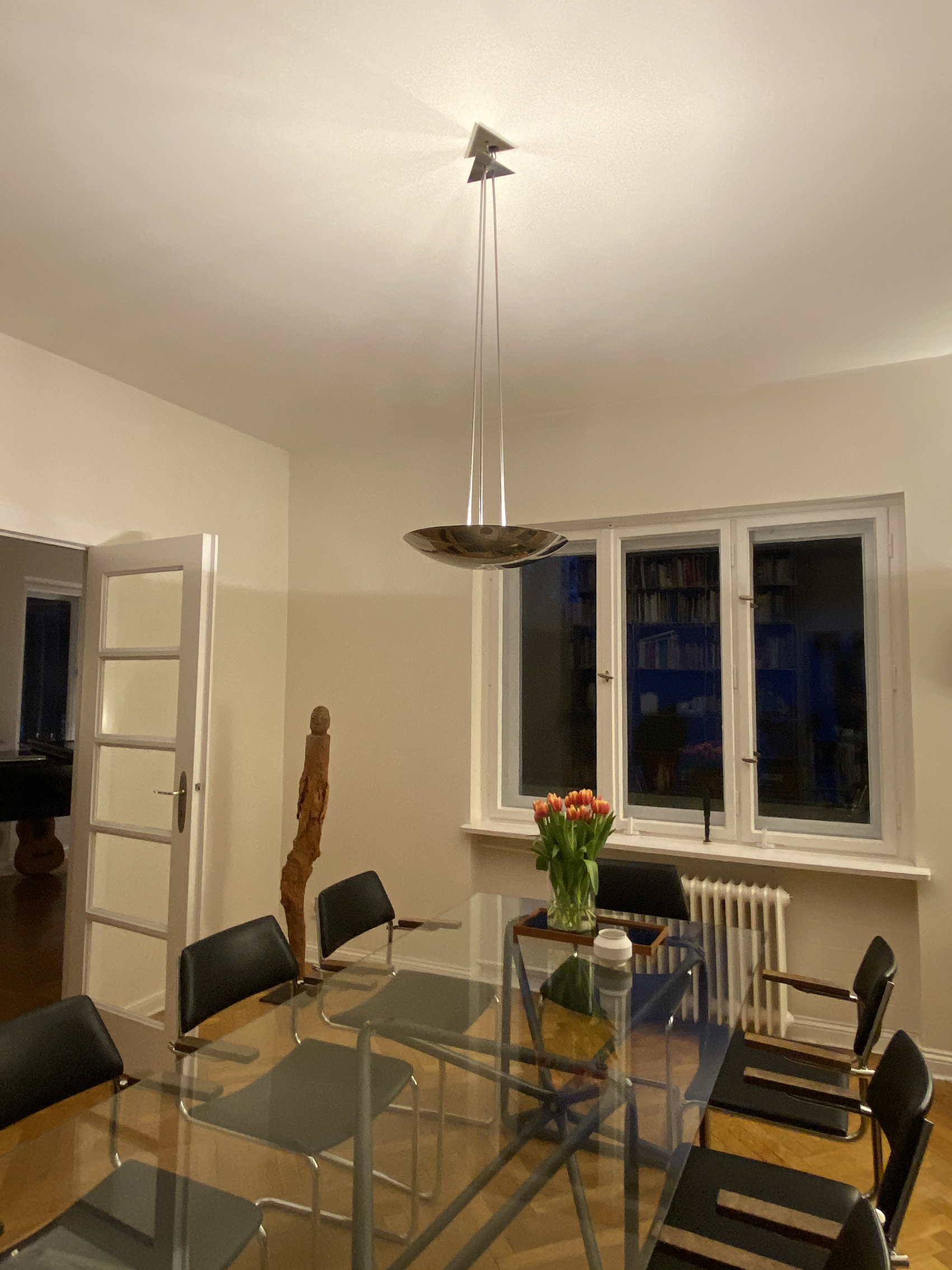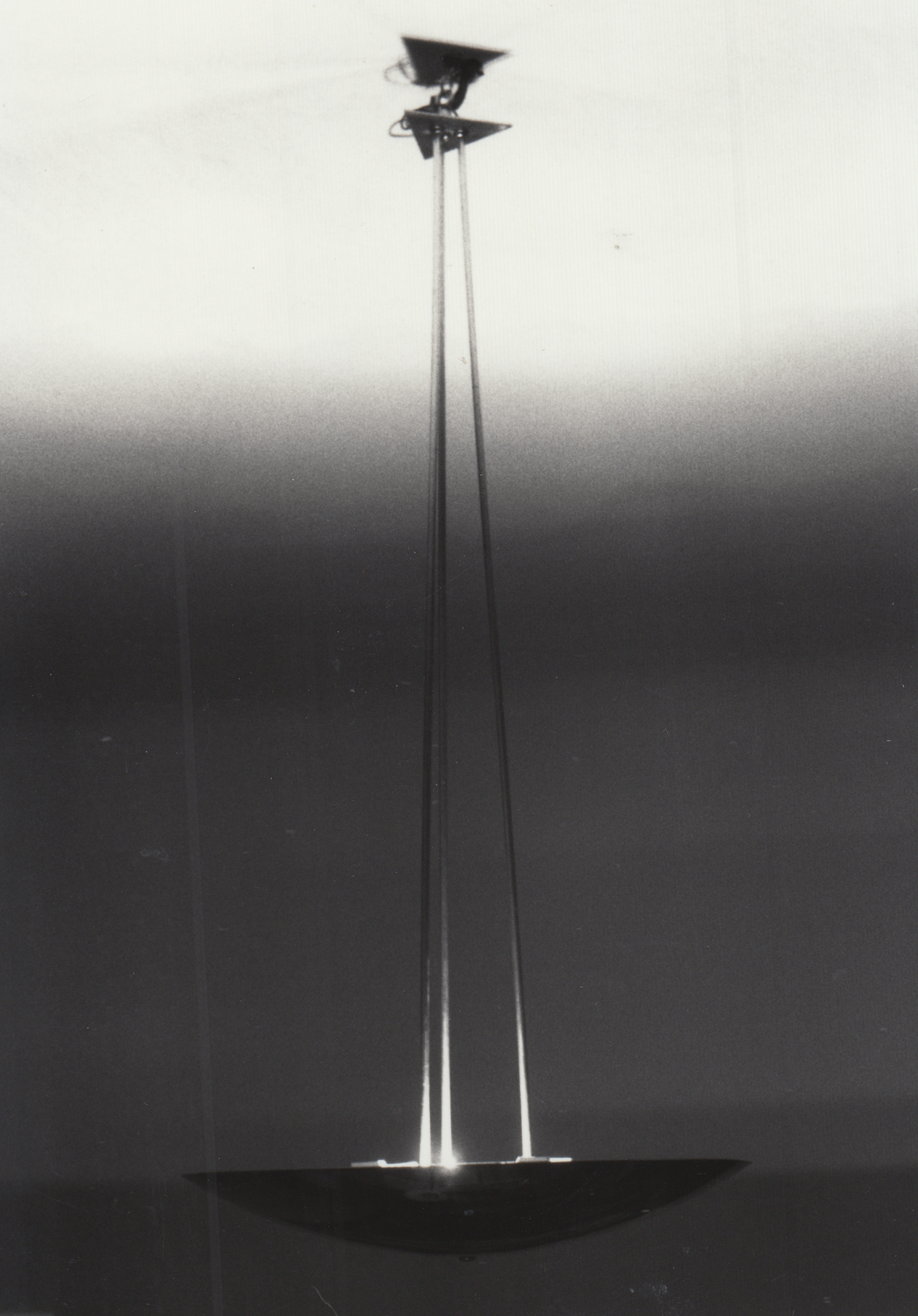Durch die drei dünnen Abhängeröhrchen aus Aluminium werden isolierte Stromkabel geführt. Der obere dreieckige Abschluss an der Decke wirkt optisch richtiger als runde Scheiben, die erprobt und verworfen worden sind. Auch übliche Baldachine haben sich nicht als richtig erwiesen. Diese Leuchte hing viele Jahre im Büro Steiner in der Berliner Bleibtreustraße 10 (1. Bild) und jetzt in der Heerstrasse 97 (zweites Bild). Eine Variante mit einer zentralen Aufhängung zeigt das dritte Bild.