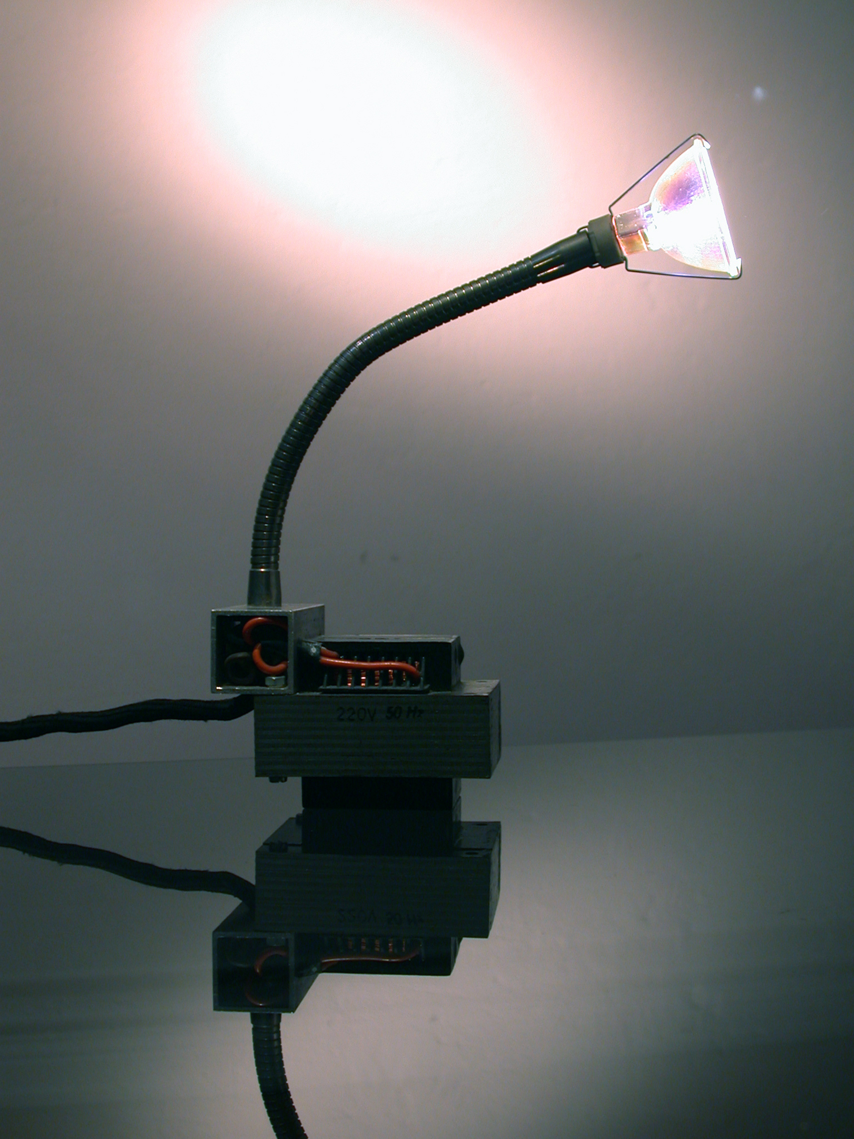 Vier Bauelemente werden zu einer Leuchte: Porzellanfassung, Schwanenhals, Verbindungsrohr und Transformator. Schwanenhälse wurden bis zu unserer Adaption als flexible Halterung für Mikrofone genutzt: sie halten die Position, in die sie einmal gebogen werden. Ein Schnittkerntransformator wandelt die Spannung auf 12 Volt und verhilft zur notwendigen Stabilität.