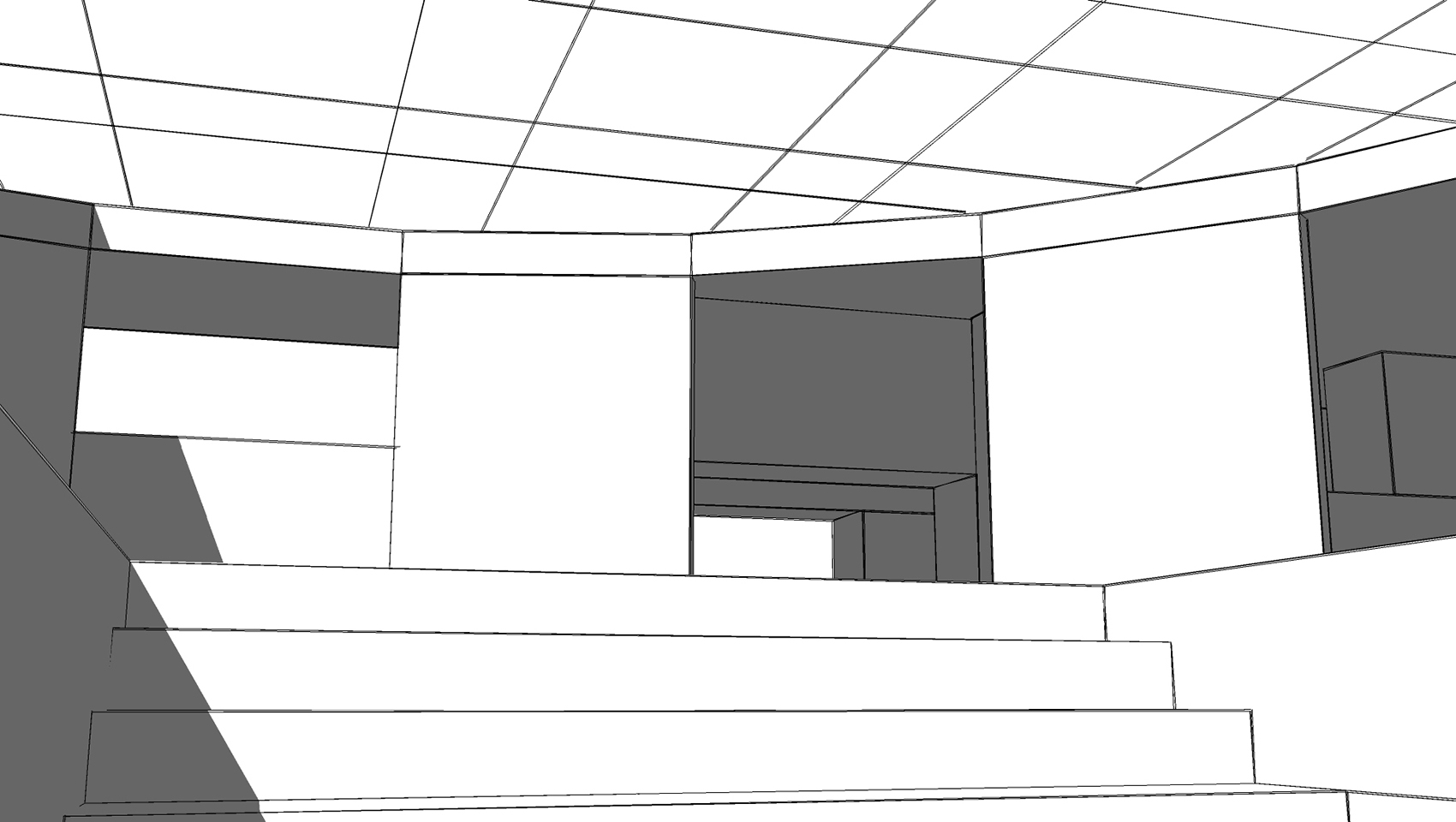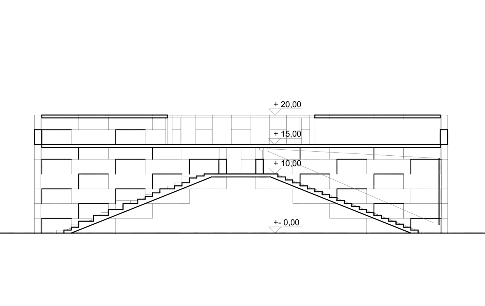Der vorliegende Entwurf geht davon aus, dass im Normalbetrieb das Kino klassisch von hinten betreten wird. Am Ende der Vorstellung wird es vorn, also unten, verlassen. Treppenläufe im Inneren und Ausgänge zu den grossen Treppen garantieren eine schnelle und einfache Entleerung, so dass fast gleichzeitig das nachrückende Publikum ohne Gegenstrom eintreten kann. Das Kino kann von vorn auch von der Ausstellung getrennt betrieben werden. Die grosszügige Reihentiefe und die Überhöhung ermöglichen vielfältige, bequeme Bestuhlung.