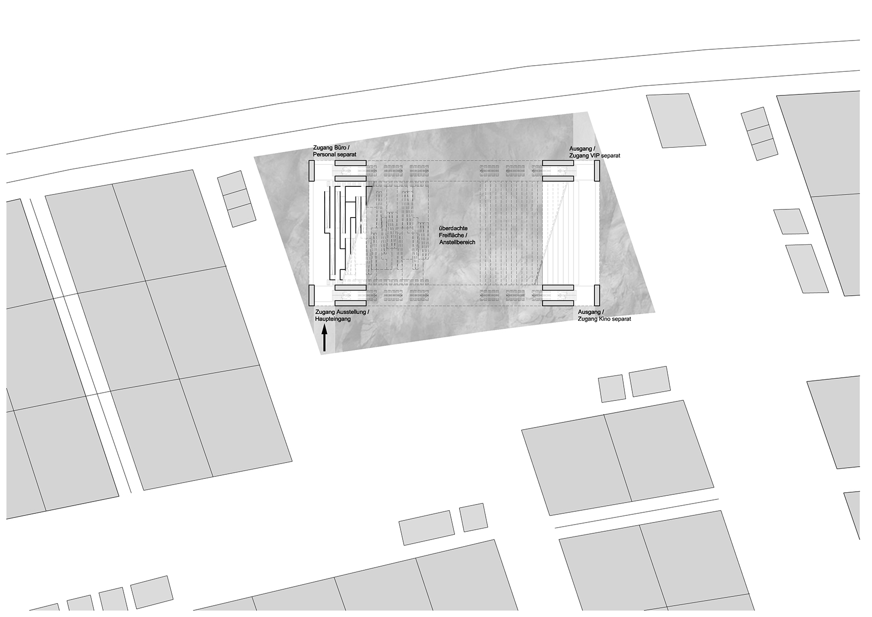 Das Gebäude verfügt über 4 gleichartige Öffnungen an den äusseren Enden der Längsseiten, von denen eine als Zugang im Normalbetrieb fungiert und einer als Zugang zum Kino, wenn die Ausstellung geschlossen ist. Die beiden weiteren Zugänge empfehlen die Nutzung als VIP- und Personalzugang. Das Aussengelände ist als eine sanft hügelige, unregelmässige Topografie aus Betonsteinen geplant, die ungezwungene Aufenthaltsqualität bietet. Die grosse Fläche unter der ›Brücke‹ schützt Wartende vor Regen und Sonneneinstrahlung.