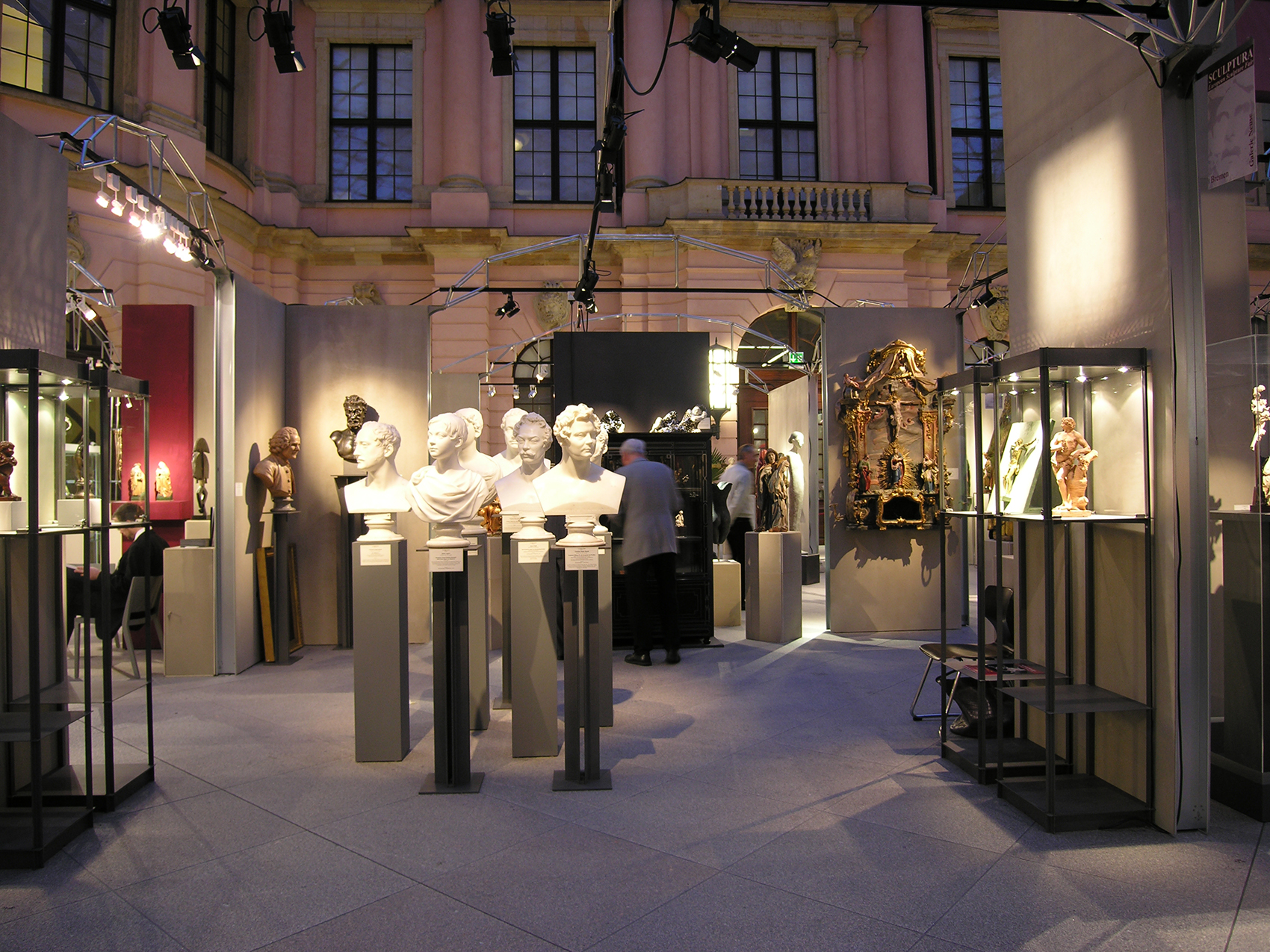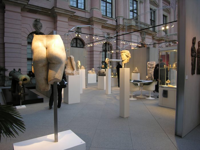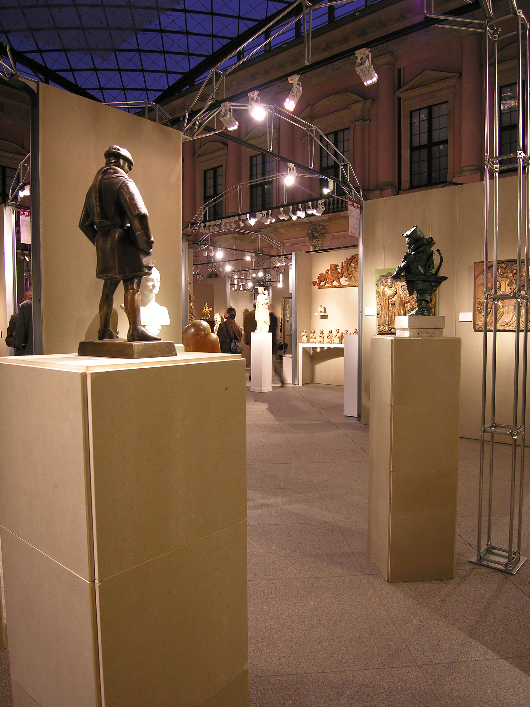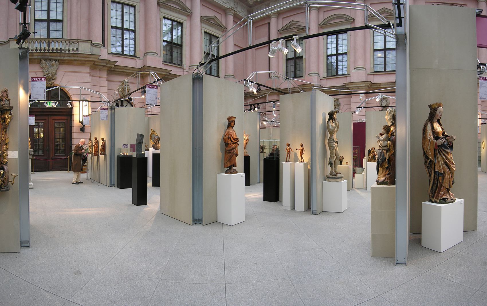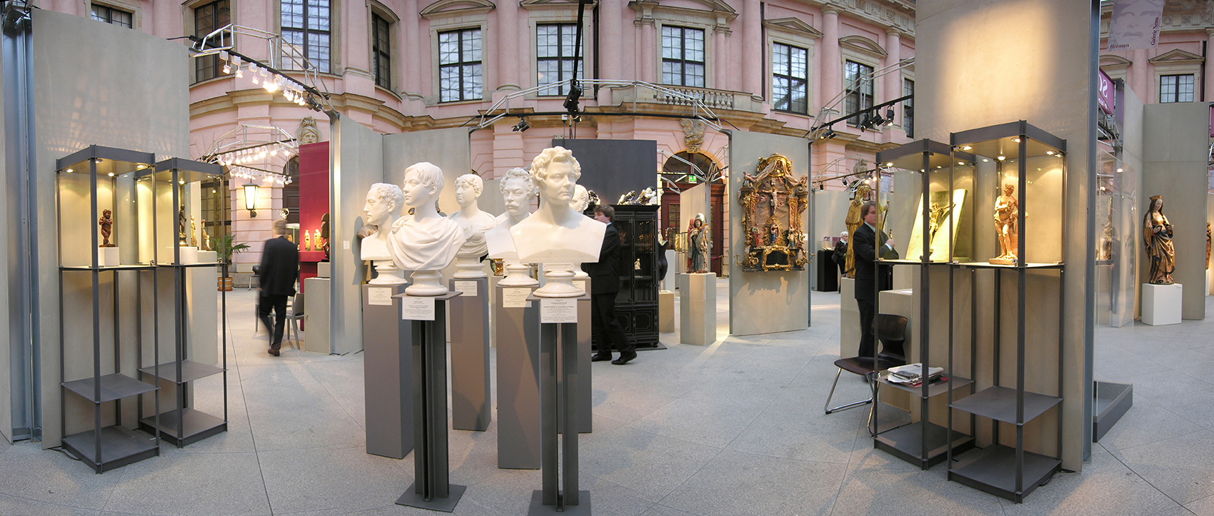 Nicht die Tatsache, dass dieses Museum auf Zeit in einer Nacht aufzubauen war, bestimmte die klare, selbststehende Konfiguration. Vielmehr galt es, fühlbare Räume zu schaffen, hohe Wände bereitzustellen und die versteifenden Träger auch als optimale Halterung für Beleuchtung nutzbar zu machen. Die Wände bestehen aus einem verzinkten Stahlrahmen, dessen Breitseiten mit zementgebundener Faserplatte in Sandsteinoptik beplankt sind, die Beleuchtungsträger bestehen aus 20 mm verzinktem Rohr als Druckstäbe und einer Dreiphasen-Stromschiene als Zuggurt. Renommierte Händler aus dem In- und Ausland nahmen die Gelegenheit wahr, sich bei dieser gänzlich neuartigen Veranstaltung in Berlin zu präsentieren.