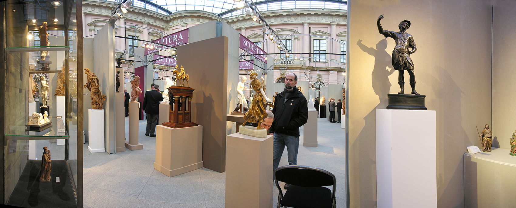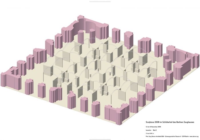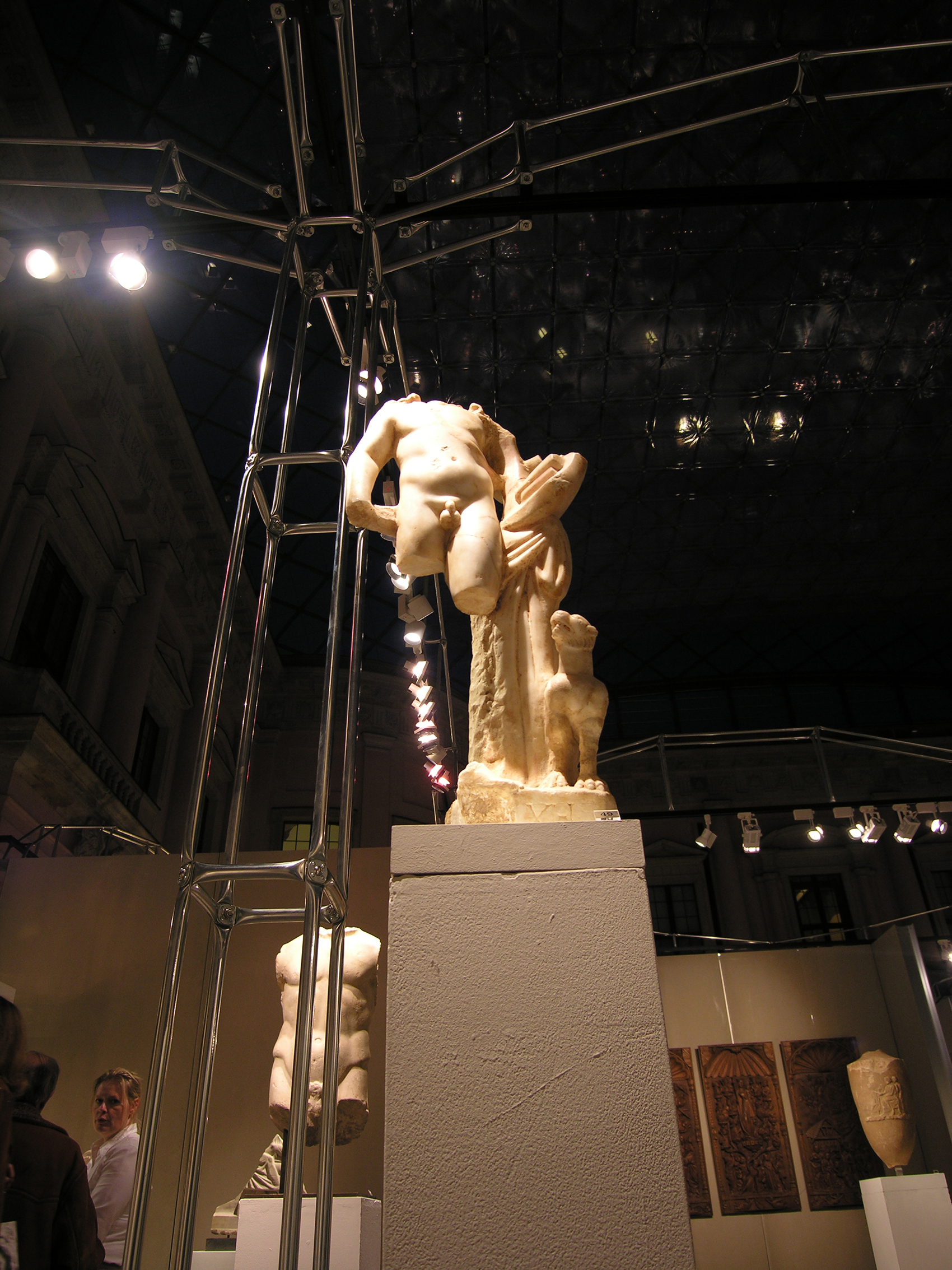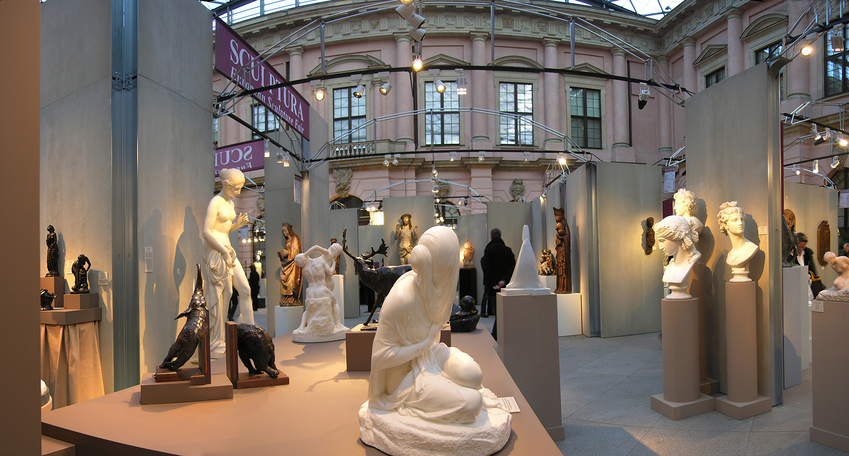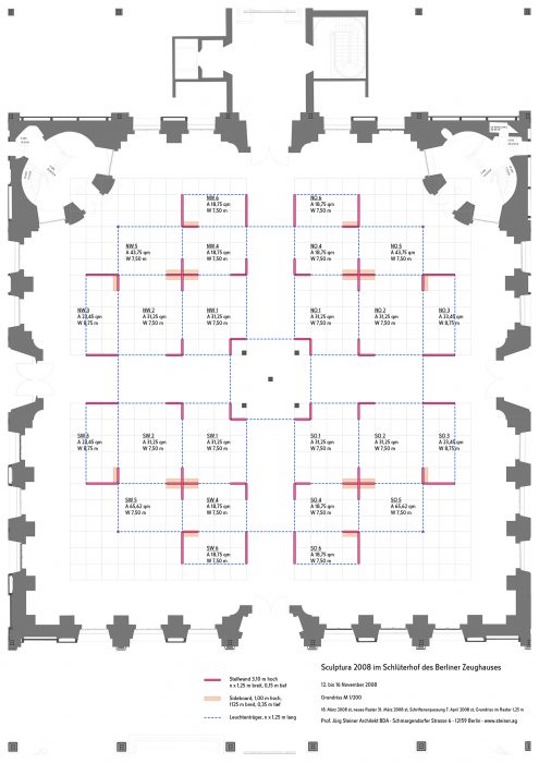 Nicht die Tatsache, dass dieses Museum auf Zeit in einer Nacht aufzubauen war, bestimmte die klare, selbststehende Konfiguration. Vielmehr galt es, fühlbare Räume zu schaffen, hohe Wände bereitzustellen und die versteifenden Träger auch als optimale Halterung für Beleuchtung nutzbar zu machen. Die Wände bestehen aus einem verzinkten Stahlrahmen, dessen Breitseiten mit zementgebundener Faserplatte in Sandsteinoptik beplankt sind, die Beleuchtungsträger bestehen aus 20 mm verzinktem Rohr als Druckstäbe und einer Dreiphasen-Stromschiene als Zuggurt. Renommierte Händler aus dem In- und Ausland nahmen die Gelegenheit wahr, sich bei dieser gänzlich neuartigen Veranstaltung in Berlin zu präsentieren.