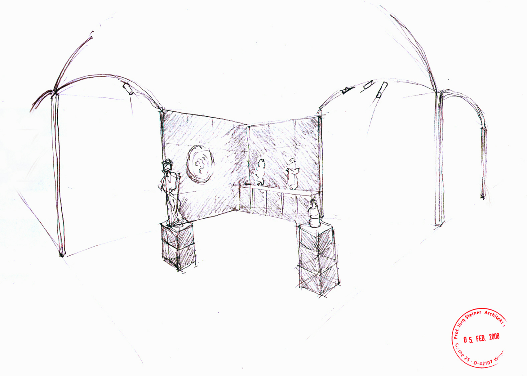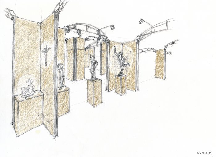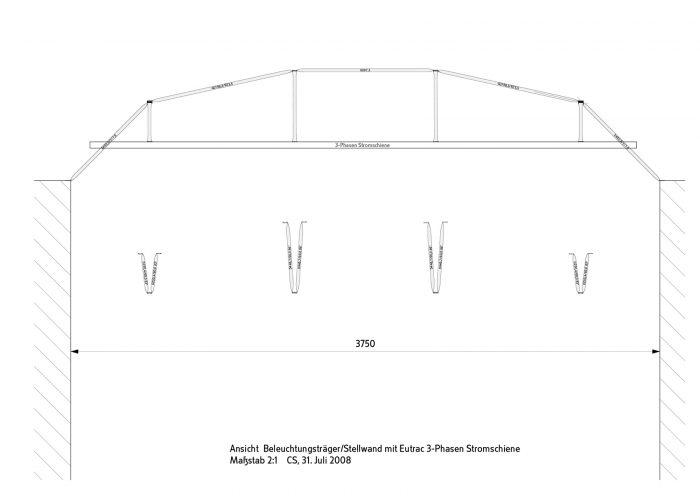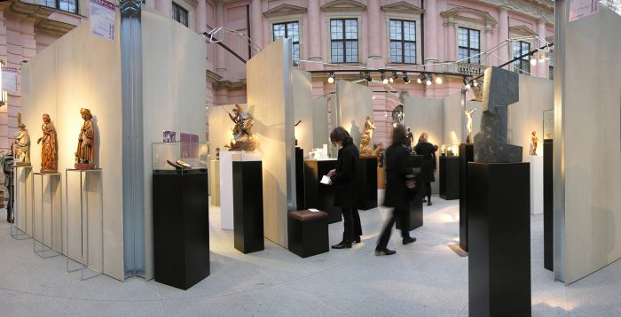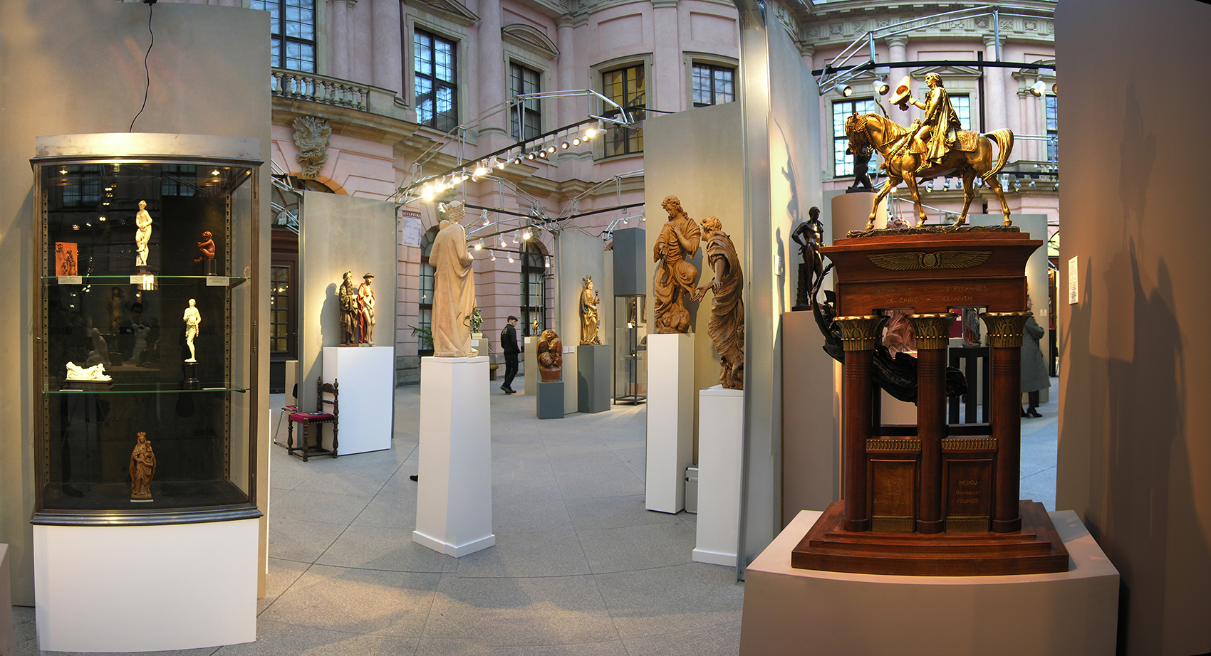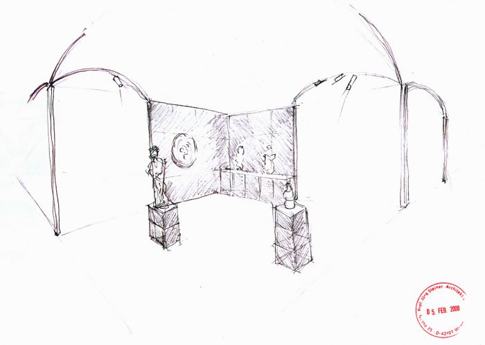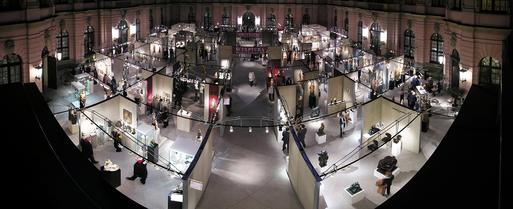 Nicht die Tatsache, dass dieses Museum auf Zeit in einer Nacht aufzubauen war, bestimmte die klare, selbststehende Konfiguration. Vielmehr galt es, fühlbare Räume zu schaffen, hohe Wände bereitzustellen und die versteifenden Träger auch als optimale Halterung für Beleuchtung nutzbar zu machen. Die Wände bestehen aus einem verzinkten Stahlrahmen, dessen Breitseiten mit zementgebundener Faserplatte in Sandsteinoptik beplankt sind, die Beleuchtungsträger bestehen aus 20 mm verzinktem Rohr als Druckstäbe und einer Dreiphasen-Stromschiene als Zuggurt. Renommierte Händler aus dem In- und Ausland nahmen die Gelegenheit wahr, sich bei dieser gänzlich neuartigen Veranstaltung in Berlin zu präsentieren.