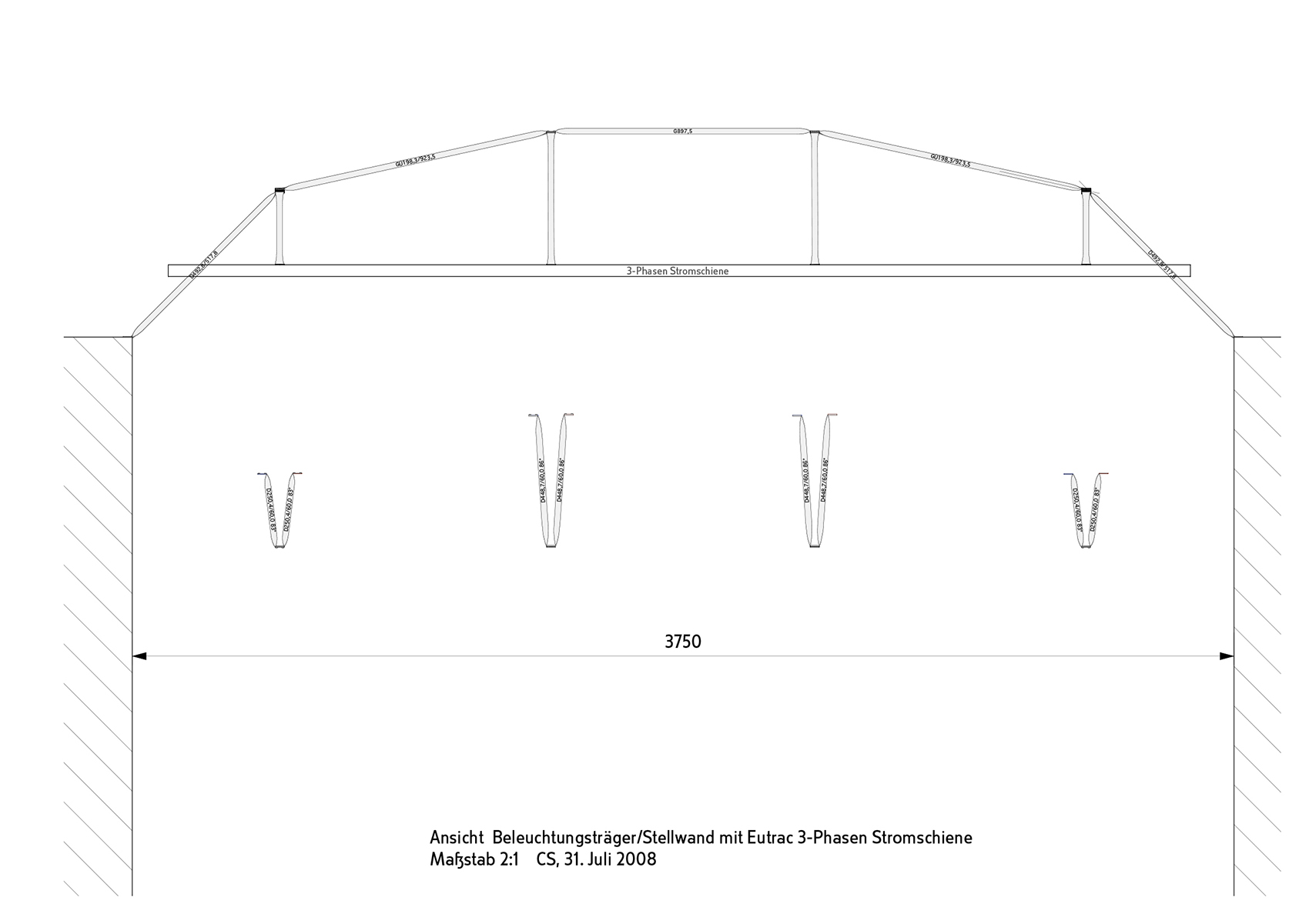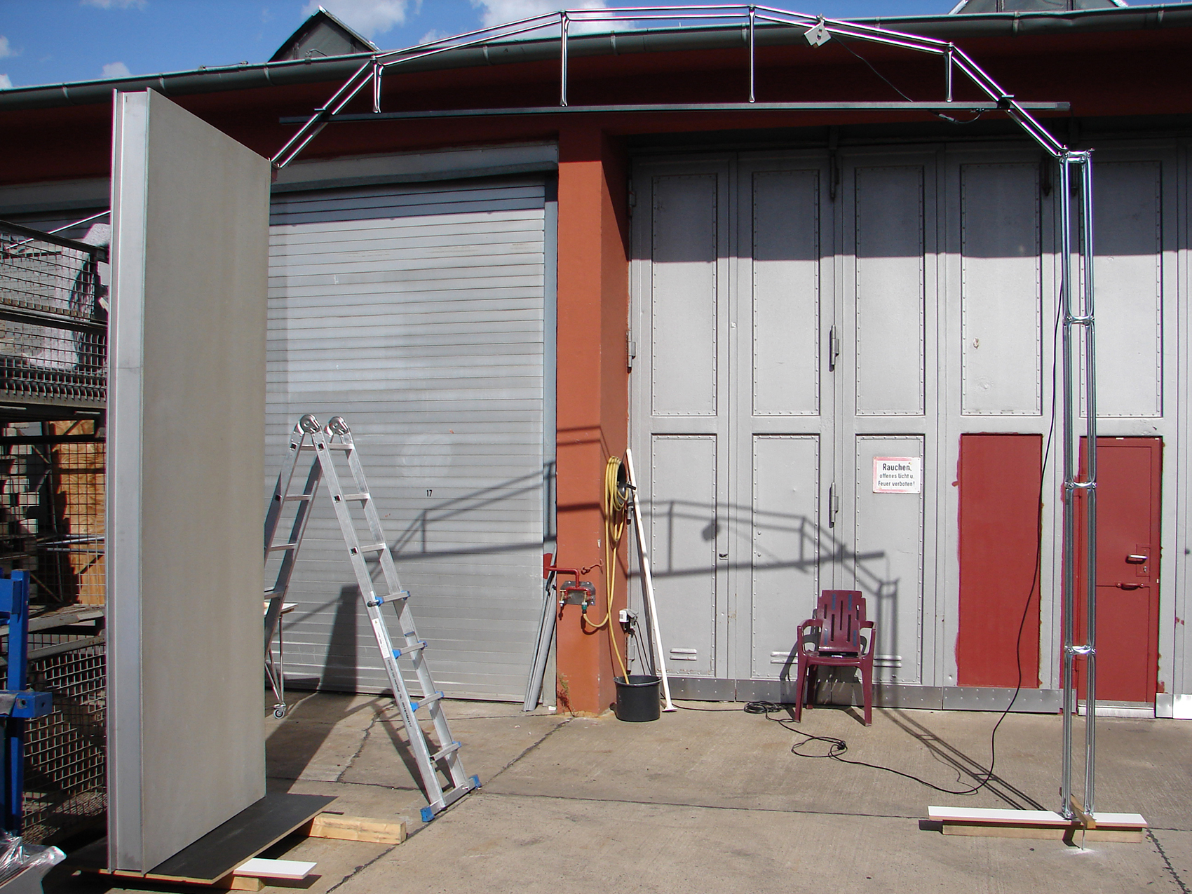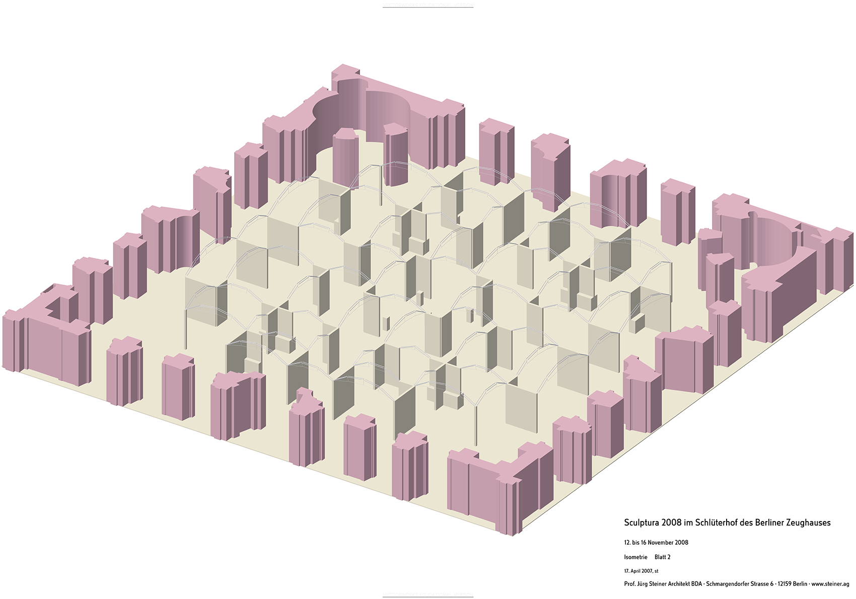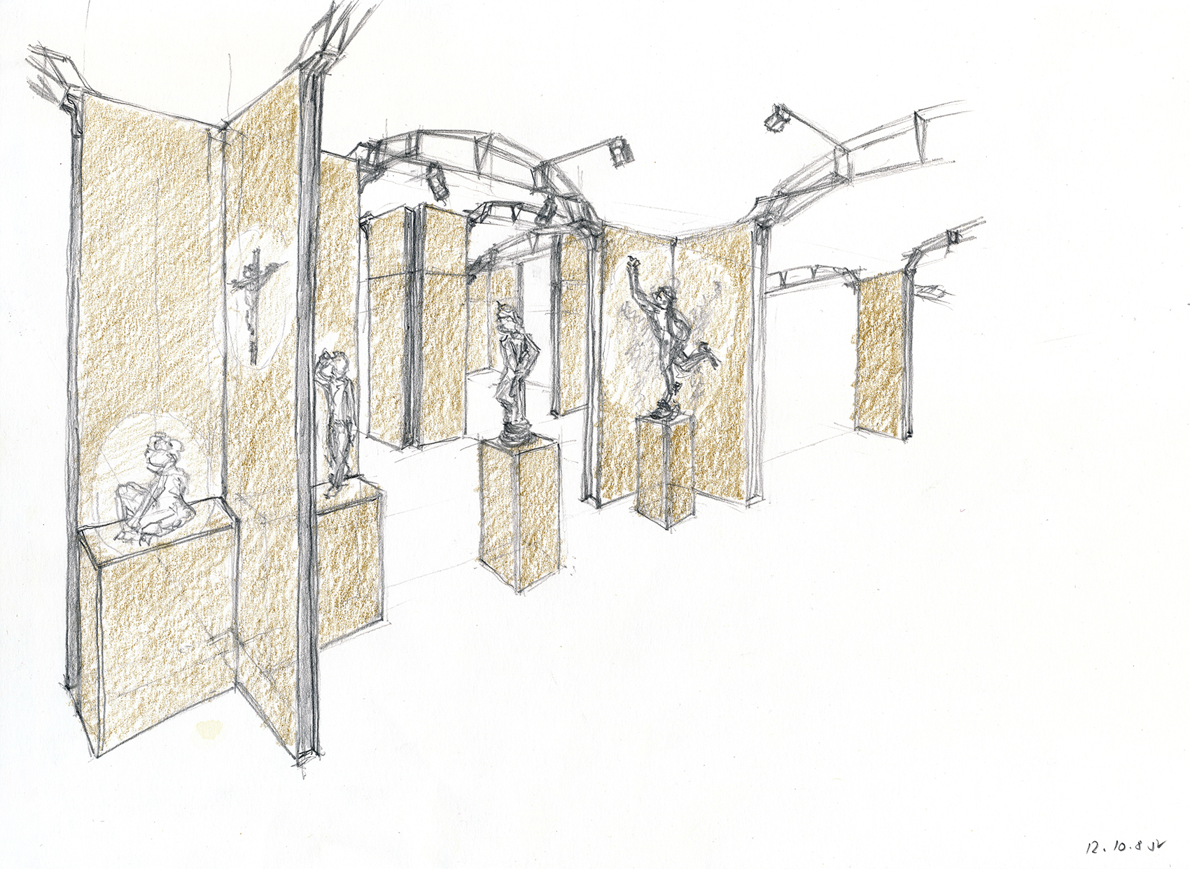 Nicht die Tatsache, dass dieses Museum auf Zeit in einer Nacht aufzubauen war, bestimmte die klare, selbststehende Konfiguration. Vielmehr galt es, fühlbare Räume zu schaffen, hohe Wände bereitzustellen und die versteifenden Träger auch als optimale Halterung für Beleuchtung nutzbar zu machen. Die Wände bestehen aus einem verzinkten Stahlrahmen, dessen Breitseiten mit zementgebundener Faserplatte in Sandsteinoptik beplankt sind, die Beleuchtungsträger bestehen aus 20 mm verzinktem Rohr als Druckstäbe und einer Dreiphasen-Stromschiene als Zuggurt. Renommierte Händler aus dem In- und Ausland nahmen die Gelegenheit wahr, sich bei dieser gänzlich neuartigen Veranstaltung in Berlin zu präsentieren.