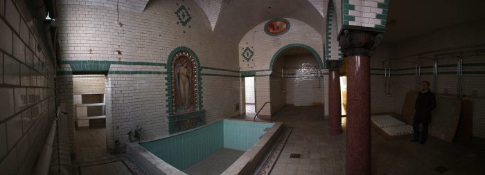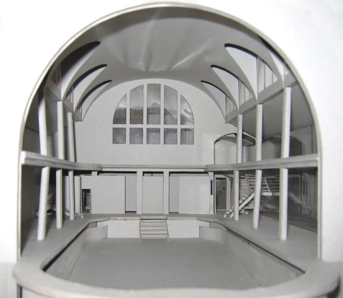 Ende 2003 gelang es Gabriele Berger, die bereits das Bewegungsbad Marienfelde betrieb, das Grundstück unter der Maßgabe zu erwerben, das Bad in privatwirtschaftlicher Organisationsstruktur wieder in Betrieb zu nehmen. Wasserfitness in verschiedenen Ausprägungen sollte über räumliche Vorgaben hinaus mit neuer Methodik adaptiert werden.  Die hinteren Bauteile dachte sie gastronomisch auszurichten, ein großer Hof lädt dort im Sommer zum Essen und Trinken im Freien ein – neben dem von uns entworfenen ›Café Freistil‹. Dank der Einordnung des Grundstücks in ein Gewerbegebiet waren Klagen wegen Ruhestörung nicht zu befürchten. Das durch einen eigenen Brunnen gespeiste, hauseigene Wasserwerk sollte seinen Platz in der großen Gaststube im einstigen Maschinensaal finden. Wie bei einer Hausbrauerei könnten dereinst die Gäste die Filterung des Berliner Wassers beobachten und durch eine möglichst transparente Anlage den Enteisungsprozess nachvollziehen.