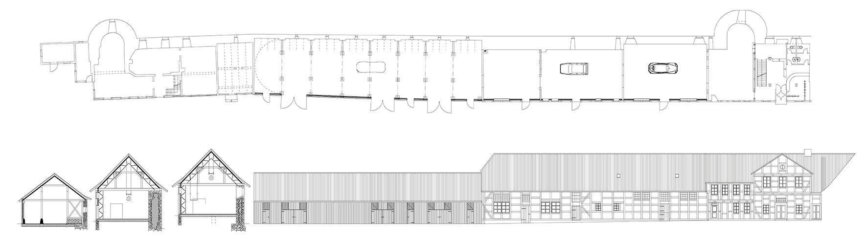 Für die teils baufälligen Anlagen plante das Büro Steiner eine innere Verstärkung aus Stahlrohrfachwerk, das sich auf der Natursteinwand zum Wassergraben aufstützt. Zwischen Tragstruktur und Altbau ist Platz für die Wärmedämmung, die nach innen mit Steinplatten abgeschlossen wird. Der Schnitt zeigt die Zeit der Käferproduktion mit Andeutung von Förderbändern im Dachbereich. Zusätzlich war vorgesehen, die Ausstellung von einem erhöhten Steg aus betrachten zu können.