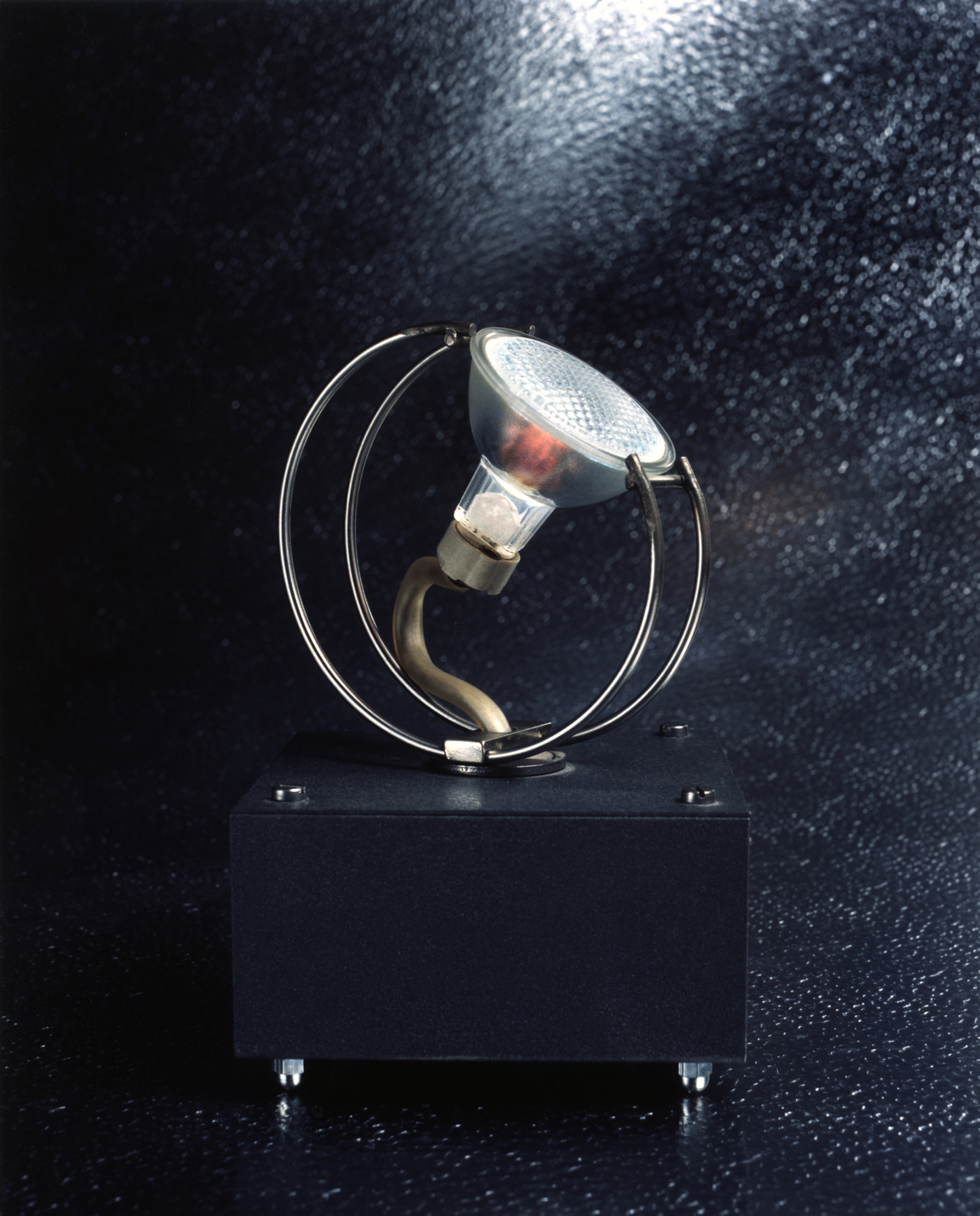 Bei der Mongolen-Ausstellung wurden in die Deckel der Vitrinen auf polygonalem Grundriss runde Löcher gesägt. An deren Rändern ließen sich die Leuchten aufstellen und dank des Drehrades auf den gewünschten Gegenstand in der Vitrine ausrichten.