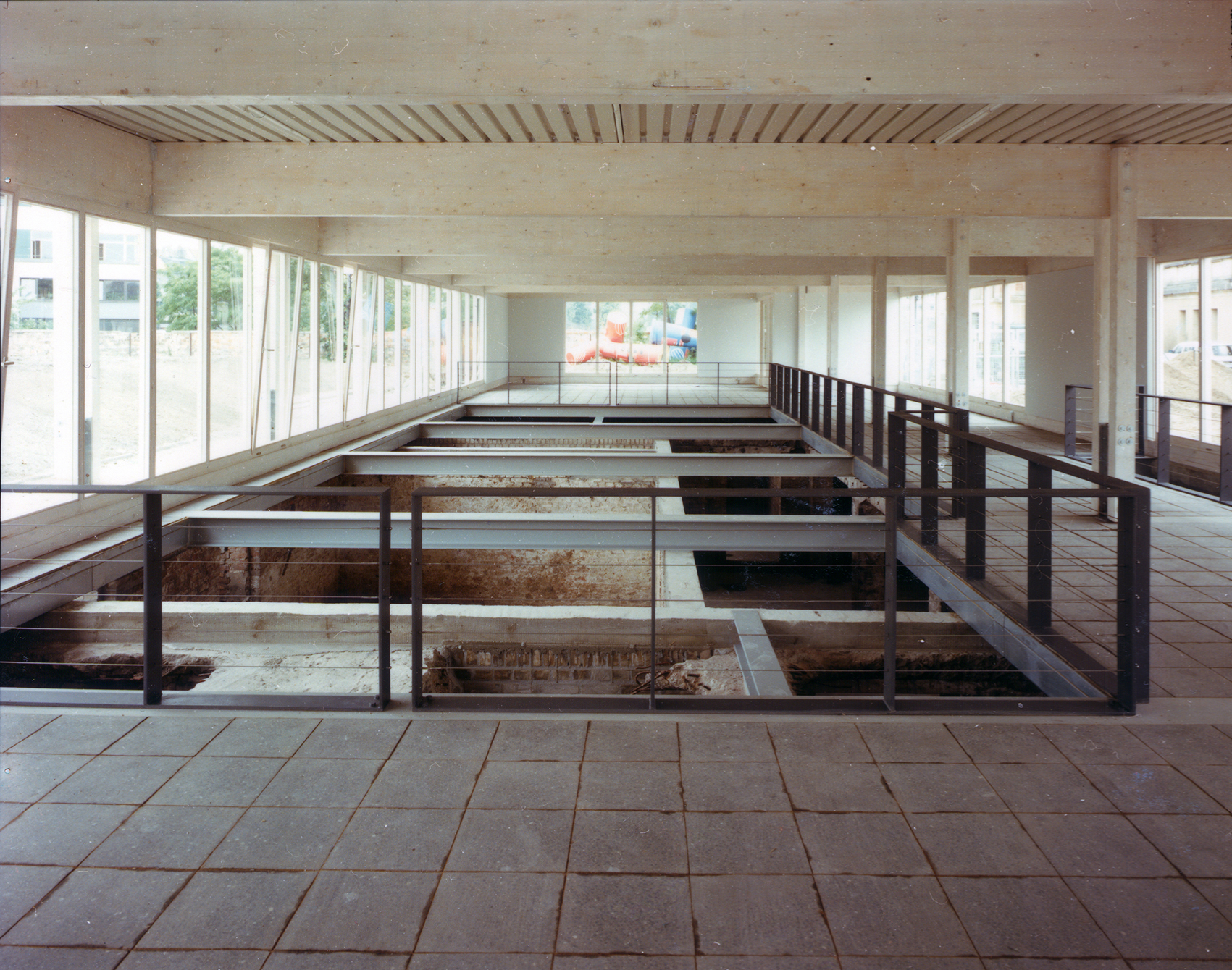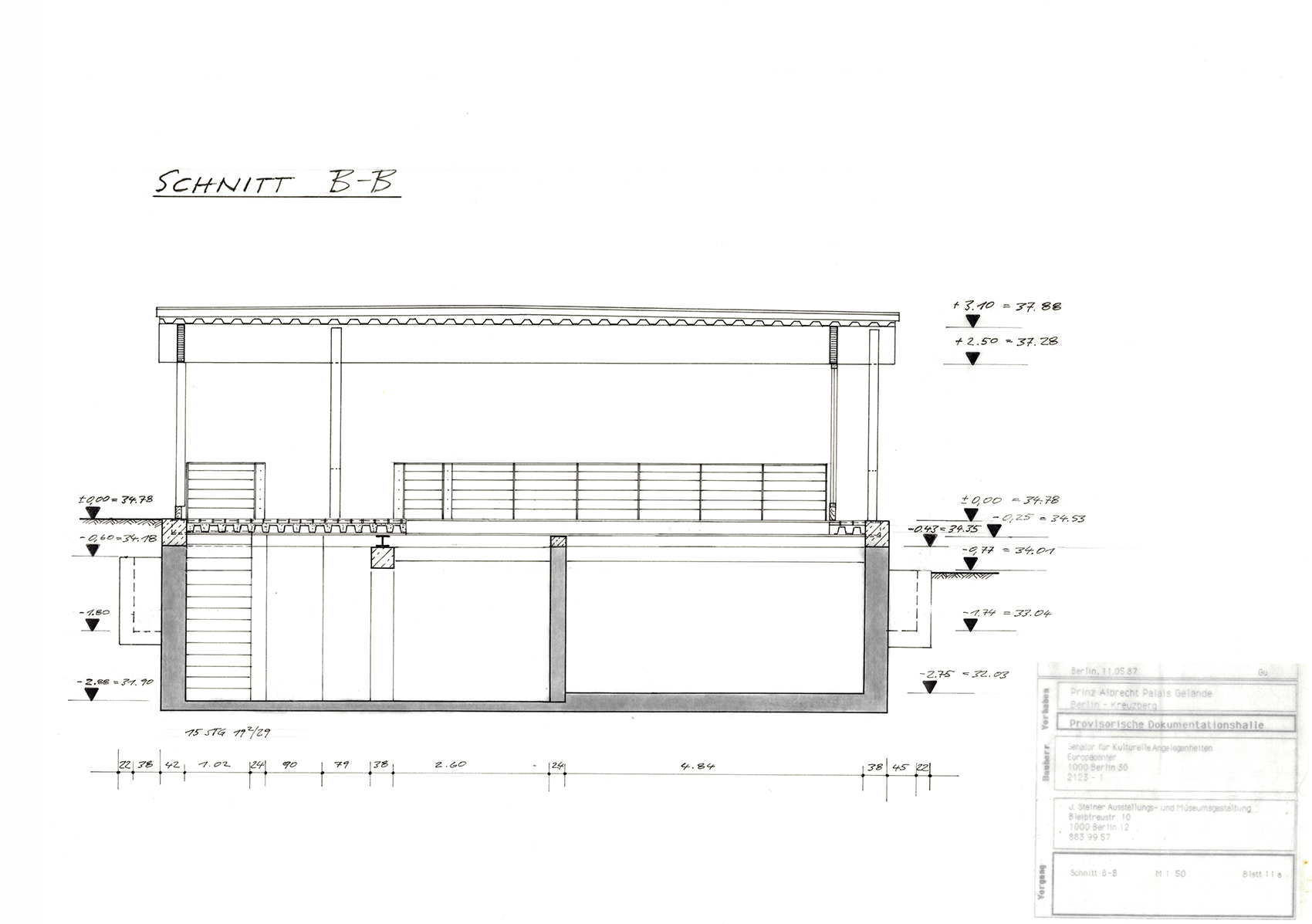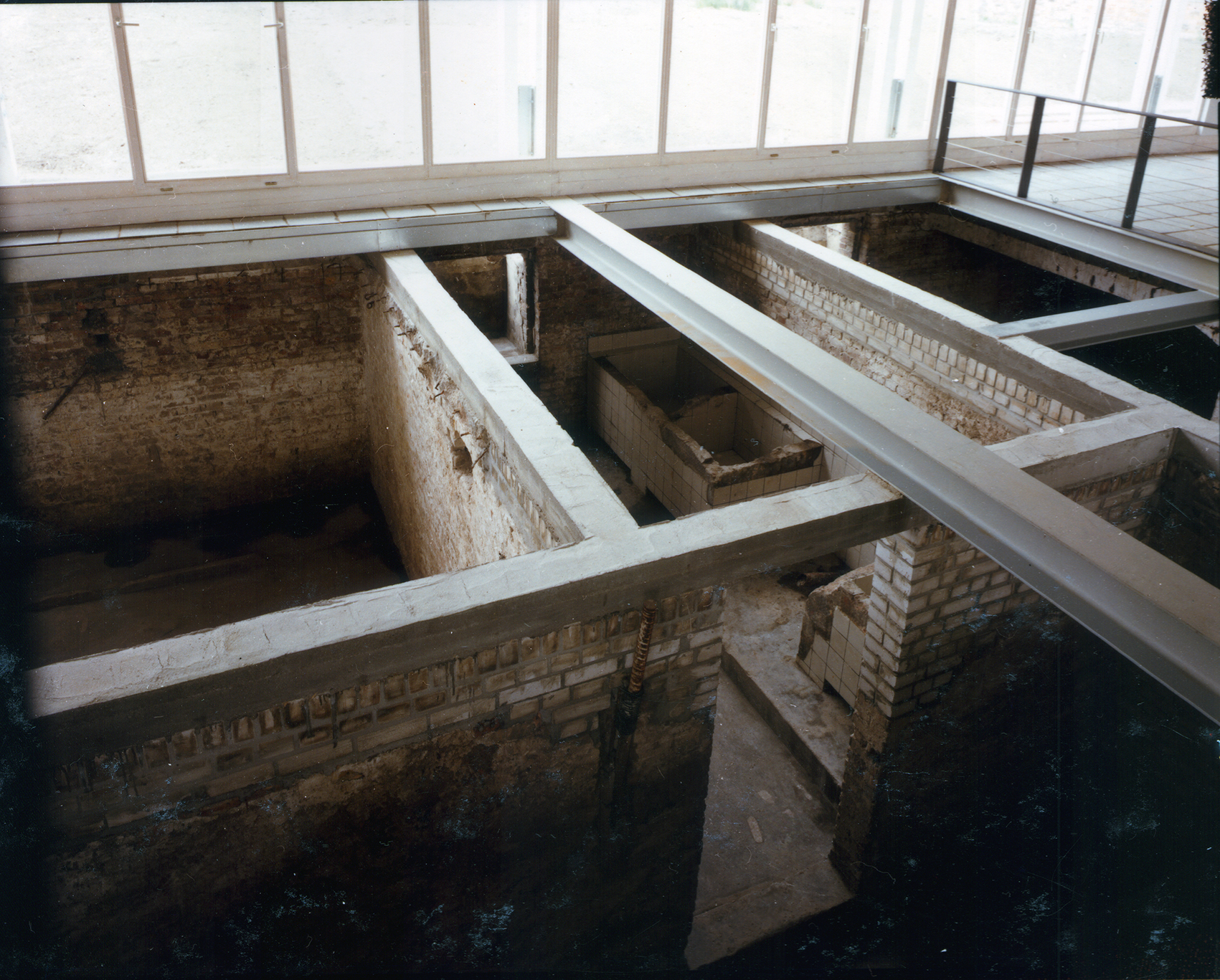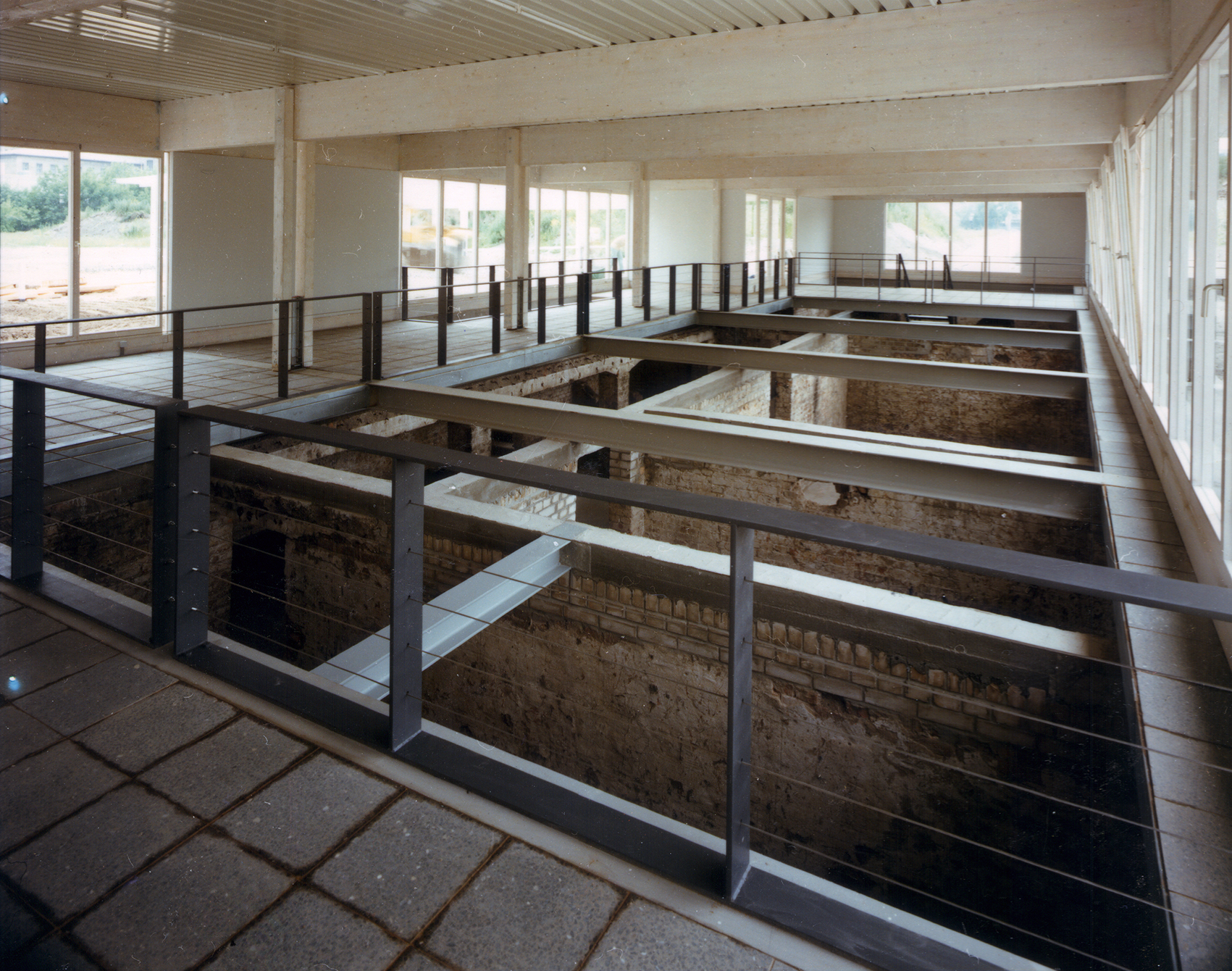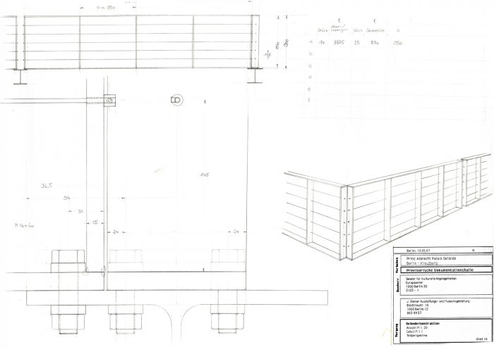 Im Auftrag der Berliner Festspiele GmbH, die zur 750-Jahrfeier Berlins im benachbarten Martin-Gropius-Bau die Ausstellung Berlin, Berlin veranstaltete, baute Jürg Steiner sein erstes Haus, einen einstöckigen Pavillon aus Leimschichtbindern. Darüber hinaus erstellte er ein Schutzdach für die für einige Jahre freigelegten Zellenböden des einstigen ›Reichssicherheitshauptamtes‹.Die während der Bautätigkeit entdeckten Kellerwände eines Küchengebäudes auf dem ehemaligen Gestapo-Gelände bildeten das Fundament und wurden Bestandteil der Ausstellung. Der lichte Bau, ursprünglich für eine dreimonatige Dauer errichtet, wurde wegen des großen Erfolgs der Ausstellung mehrmals ertüchtigt, sodass er eine Standzeit von zehn Jahren erreichte. Der Pavillon reagierte eindrucksvoll die Authentizität des Ortes. Der Dauerausstellung von Claus-Peter C. Gross kam der Pavillon umfassend entgegen (zweitletztes Bild).