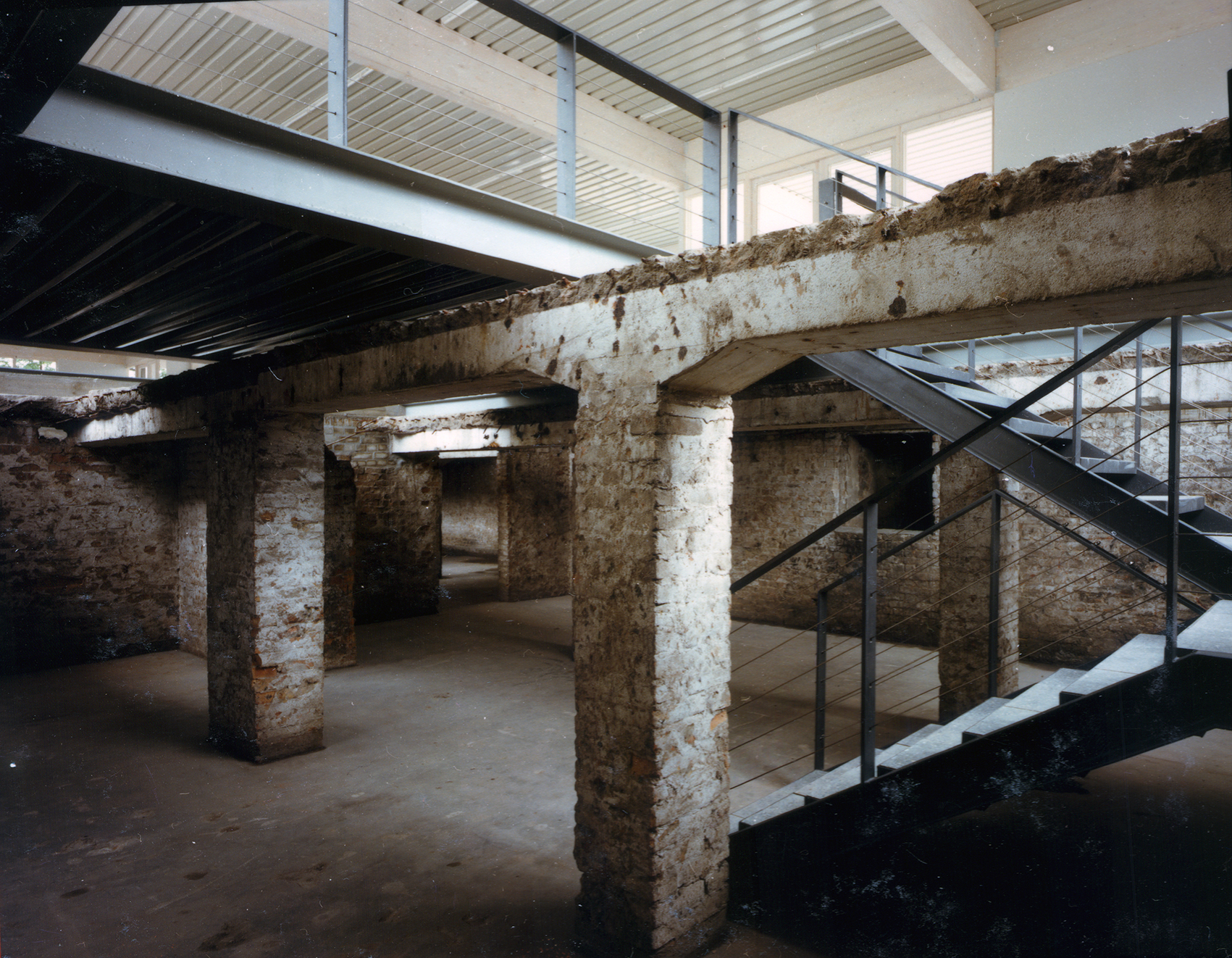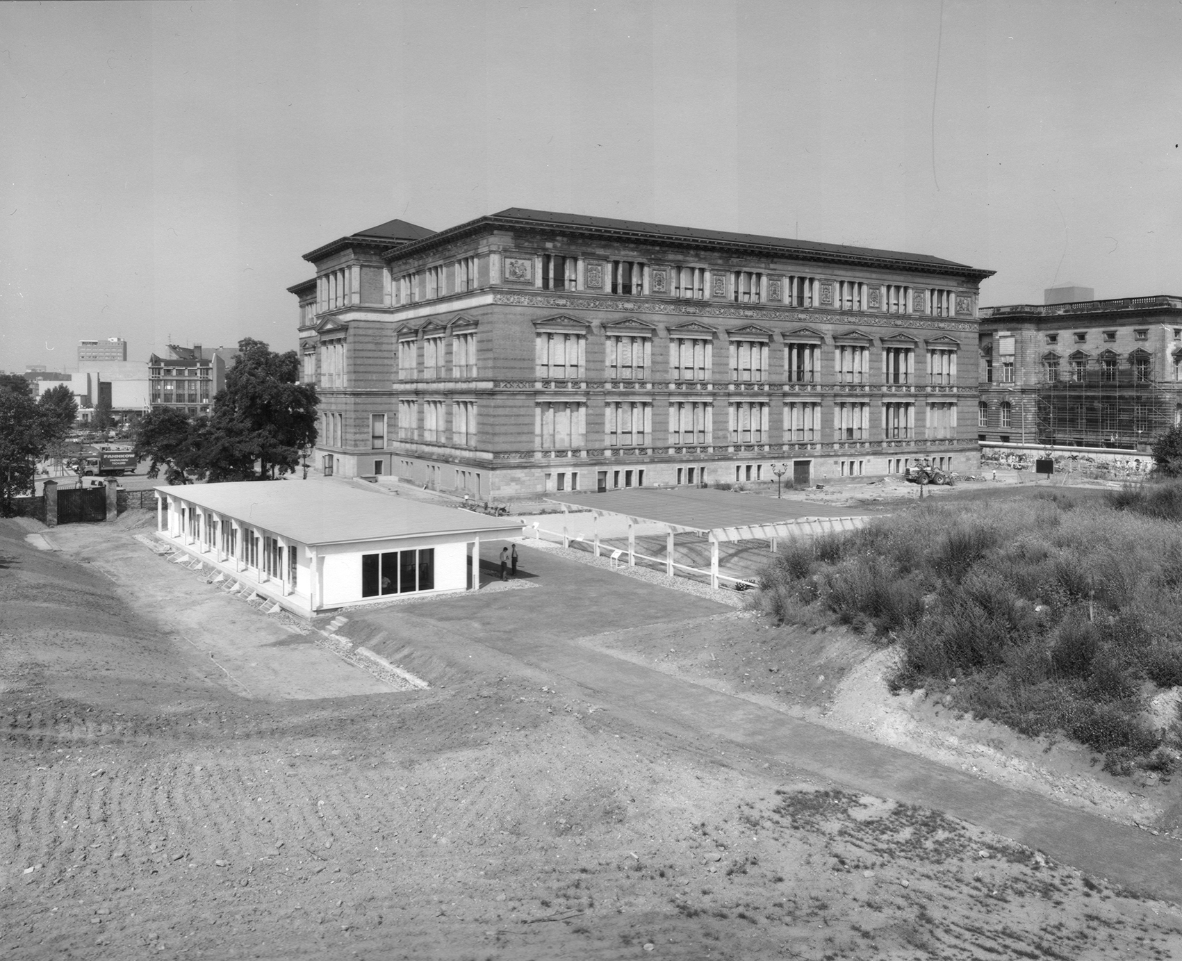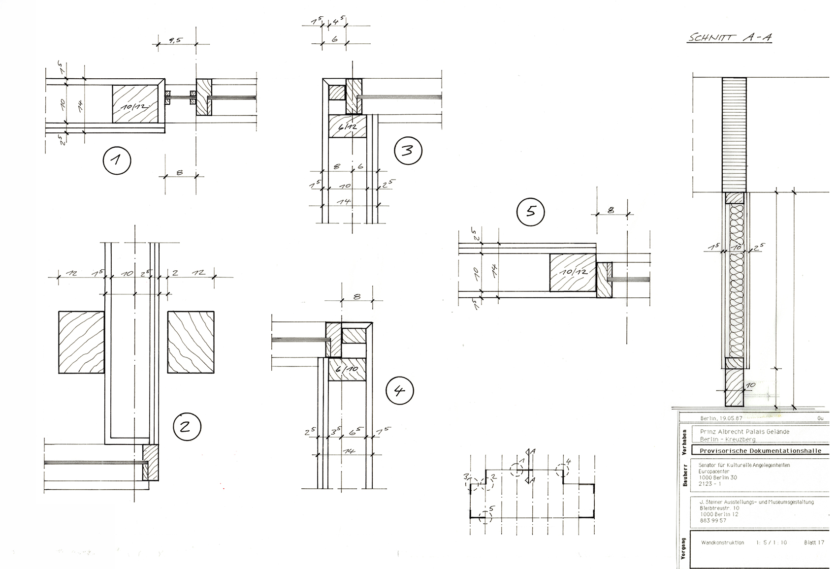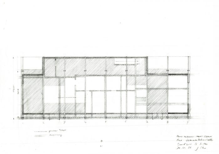 Im Auftrag der Berliner Festspiele GmbH, die zur 750-Jahrfeier Berlins im benachbarten Martin-Gropius-Bau die Ausstellung Berlin, Berlin veranstaltete, baute Jürg Steiner sein erstes Haus, einen einstöckigen Pavillon aus Leimschichtbindern. Darüber hinaus erstellte er ein Schutzdach für die für einige Jahre freigelegten Zellenböden des einstigen ›Reichssicherheitshauptamtes‹.Die während der Bautätigkeit entdeckten Kellerwände eines Küchengebäudes auf dem ehemaligen Gestapo-Gelände bildeten das Fundament und wurden Bestandteil der Ausstellung. Der lichte Bau, ursprünglich für eine dreimonatige Dauer errichtet, wurde wegen des großen Erfolgs der Ausstellung mehrmals ertüchtigt, sodass er eine Standzeit von zehn Jahren erreichte. Der Pavillon reagierte eindrucksvoll die Authentizität des Ortes. Der Dauerausstellung von Claus-Peter C. Gross kam der Pavillon umfassend entgegen (zweitletztes Bild).