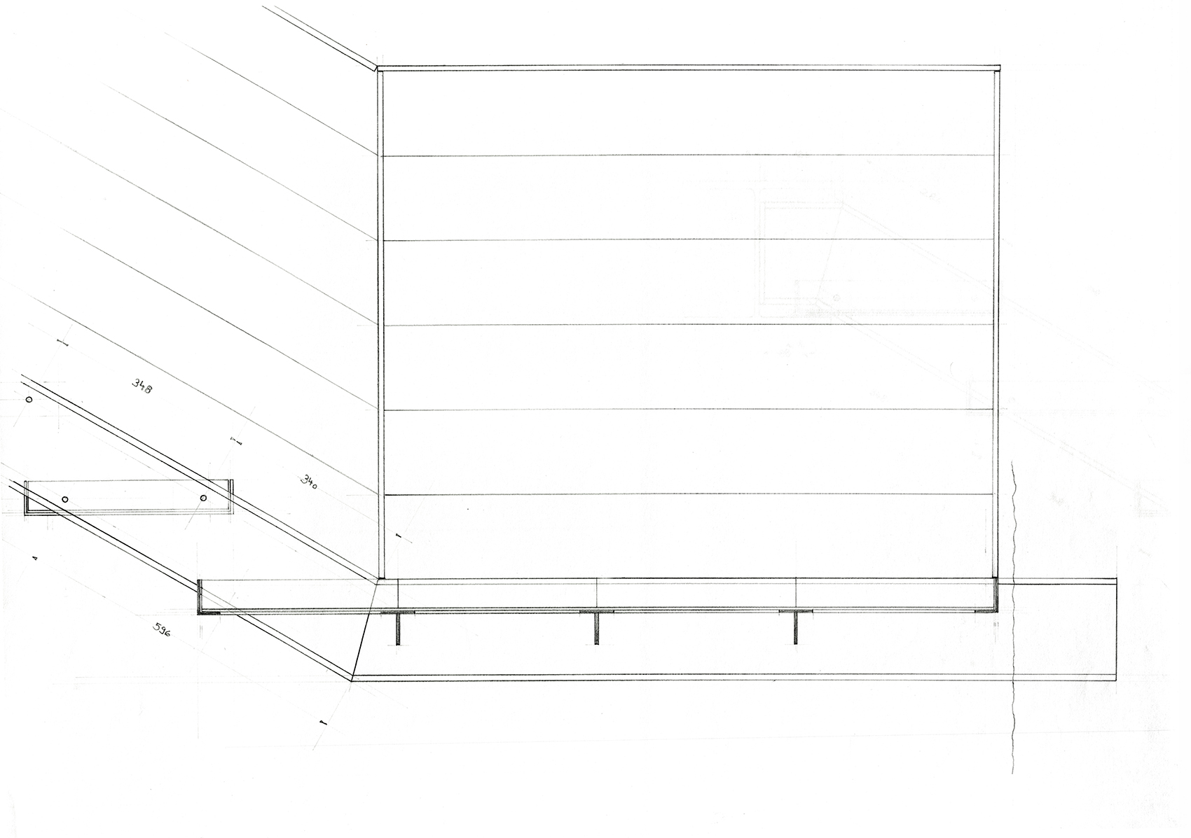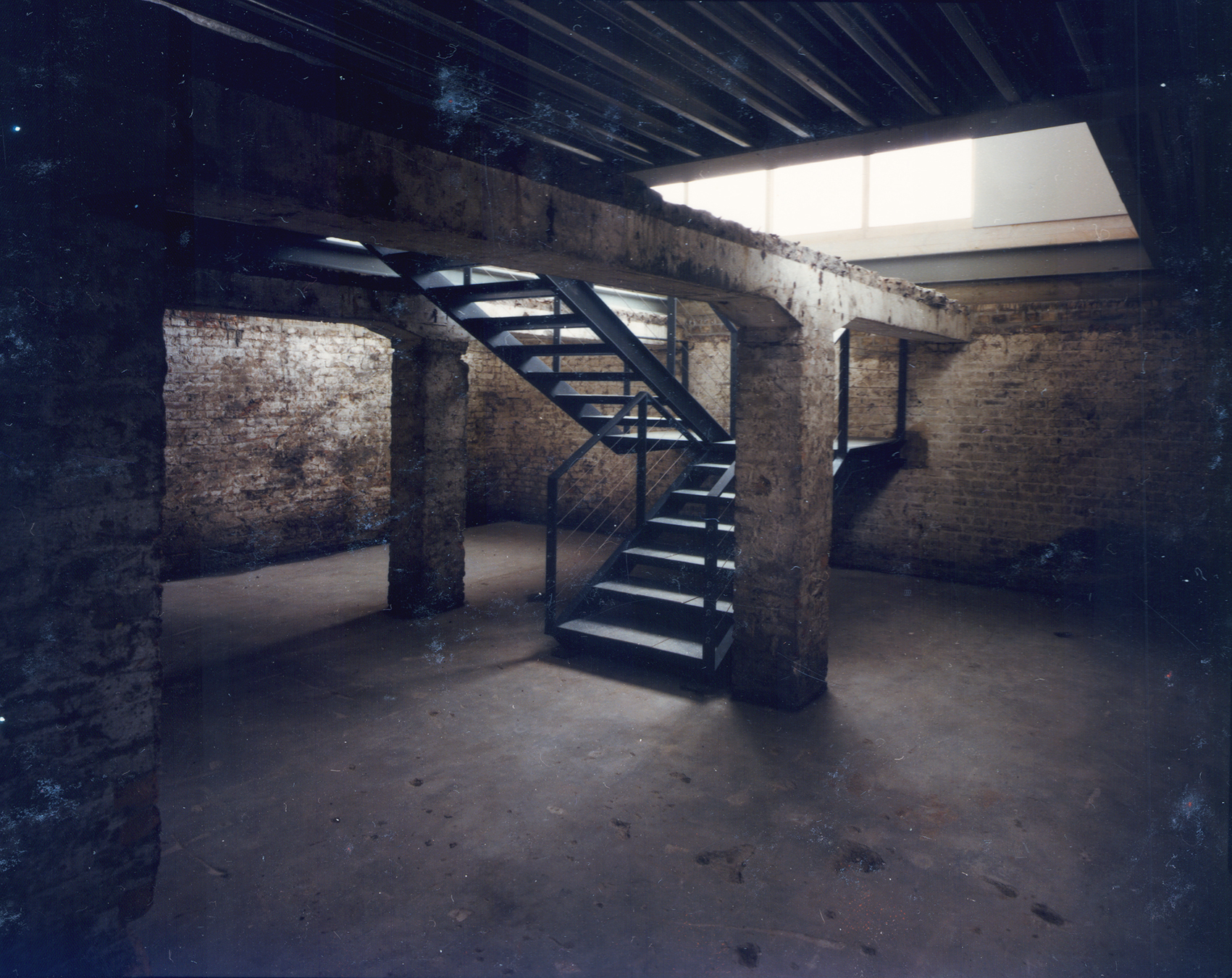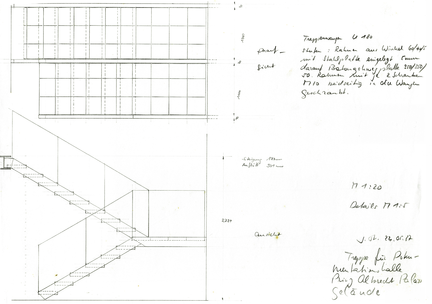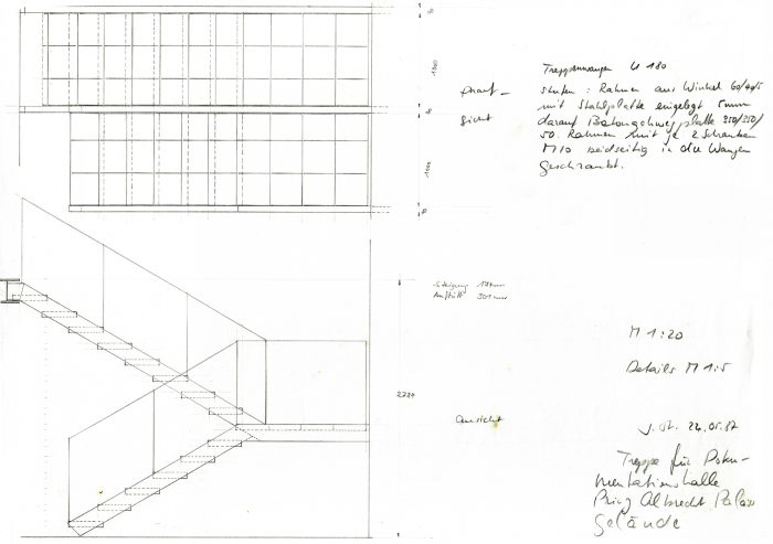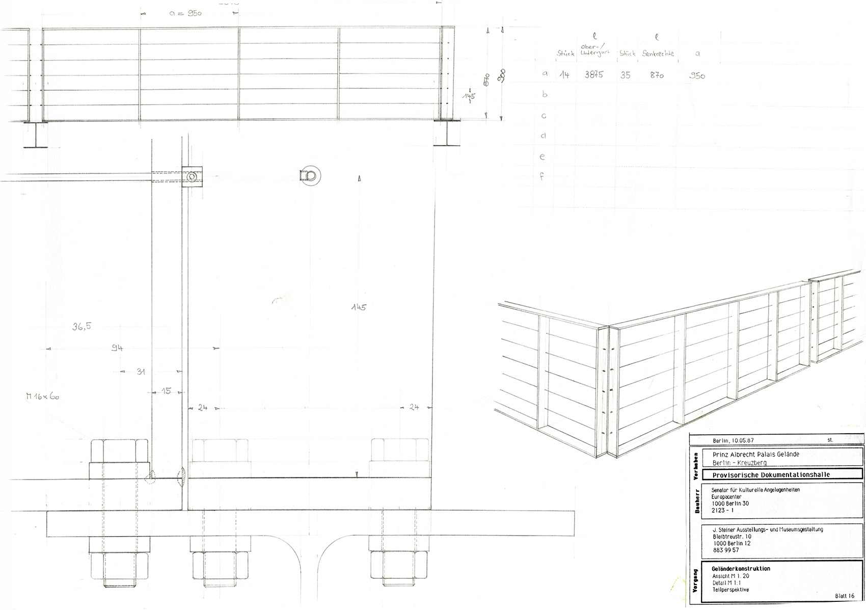 Im Auftrag der Berliner Festspiele GmbH, die zur 750-Jahrfeier Berlins im benachbarten Martin-Gropius-Bau die Ausstellung Berlin, Berlin veranstaltete, baute Jürg Steiner sein erstes Haus, einen einstöckigen Pavillon aus Leimschichtbindern. Darüber hinaus erstellte er ein Schutzdach für die für einige Jahre freigelegten Zellenböden des einstigen ›Reichssicherheitshauptamtes‹.Die während der Bautätigkeit entdeckten Kellerwände eines Küchengebäudes auf dem ehemaligen Gestapo-Gelände bildeten das Fundament und wurden Bestandteil der Ausstellung. Der lichte Bau, ursprünglich für eine dreimonatige Dauer errichtet, wurde wegen des großen Erfolgs der Ausstellung mehrmals ertüchtigt, sodass er eine Standzeit von zehn Jahren erreichte. Der Pavillon reagierte eindrucksvoll die Authentizität des Ortes. Der Dauerausstellung von Claus-Peter C. Gross kam der Pavillon umfassend entgegen (zweitletztes Bild).