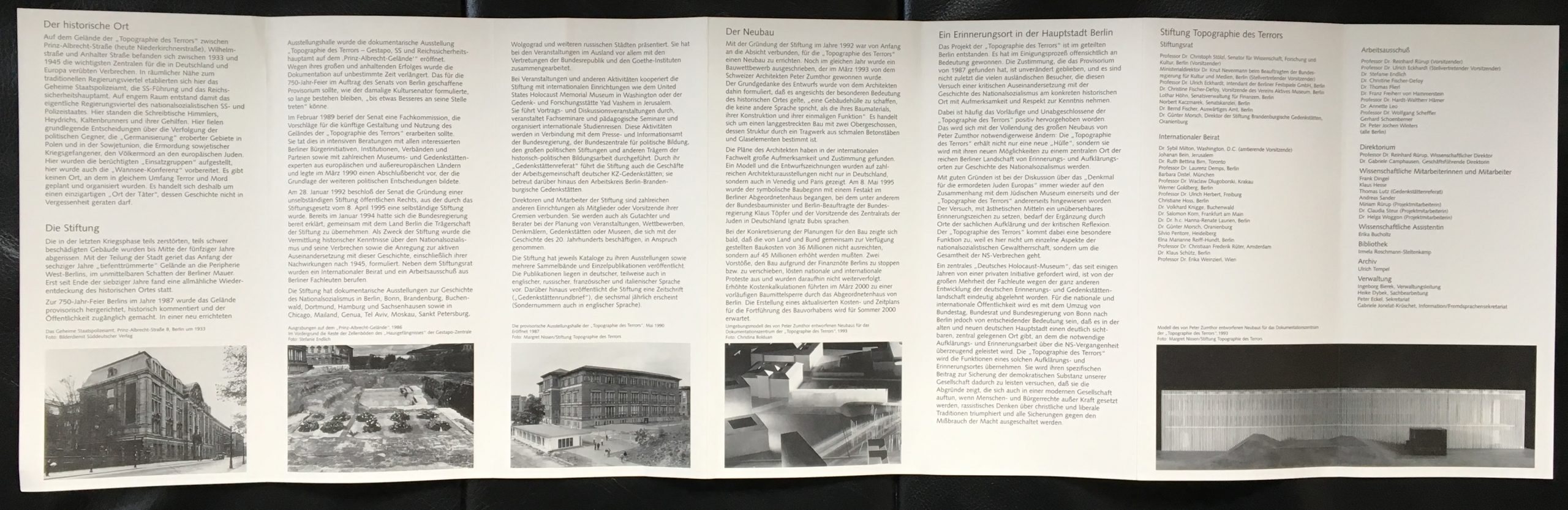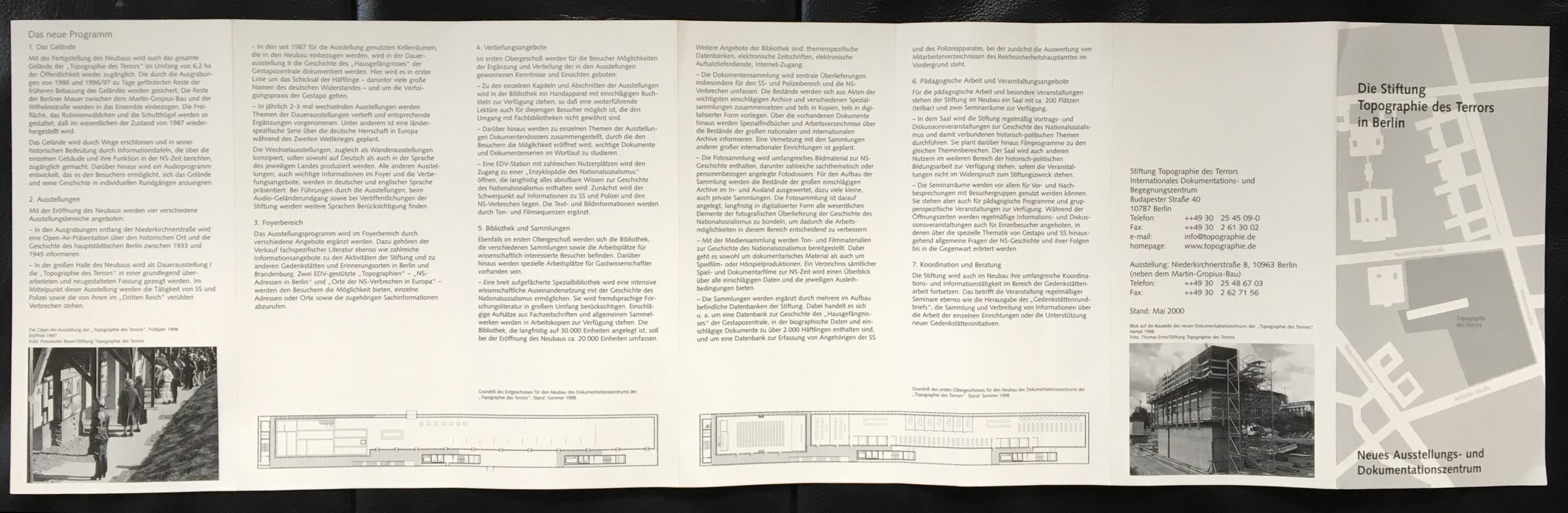 Für das Ausstellungs- und Dokumentationszentrum der Topographie des Terrors in Berlin gestaltete das Büro Steiner diesen Leporello. Das Bauprojekt geriet inzwischen ins Stocken. Der beauftragenden Stiftung war daran gelegen, den vielen negativen Pressemeldungen ein Zeichen der Zuversicht entgegenzusetzen.