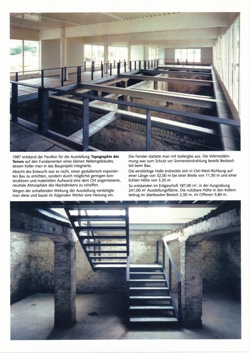 Nach zehnjähriger Standzeit riss man 1997 für einen geplanten Neubau den ursprünglich für eine Standzeit von drei Monaten konzipierten Ausstellungspavillon der Topographie des Terrors mit der mit dem Ort verbundenen Geschichte ab. Hier hatte das »Reichssicherheitshauptamt«, die SS- und Gestapo-Führung ihren Sitz. Das Büro Steiner wurde beauftragt, das Material der vorhandenen Ausstellung zur Topographie des Terrors wetterfest zu machen und im Außenbereich einer weiteren von uns mit Wetterschutz versehenen Grundmaueranlage in den ehemaligen Kellern der verschiedenen Gebäude entlang der einstigen Prinz-Albrecht-Straße zu installieren. Der Ausgrabungsbereich erhielt einen Weg, zum Teil tief eingegraben, zwei Treppenanlagen und eine Rampe, die auch Gehbehinderten die Besichtigung ermöglichte. Die Authentizität des Ortes verbindet sich auf einmalige Weise mit der Brisanz der zurückhaltend gestalteten Ausstellung, mit dem pikanten Hintergrund der Reste der Berliner Mauer.