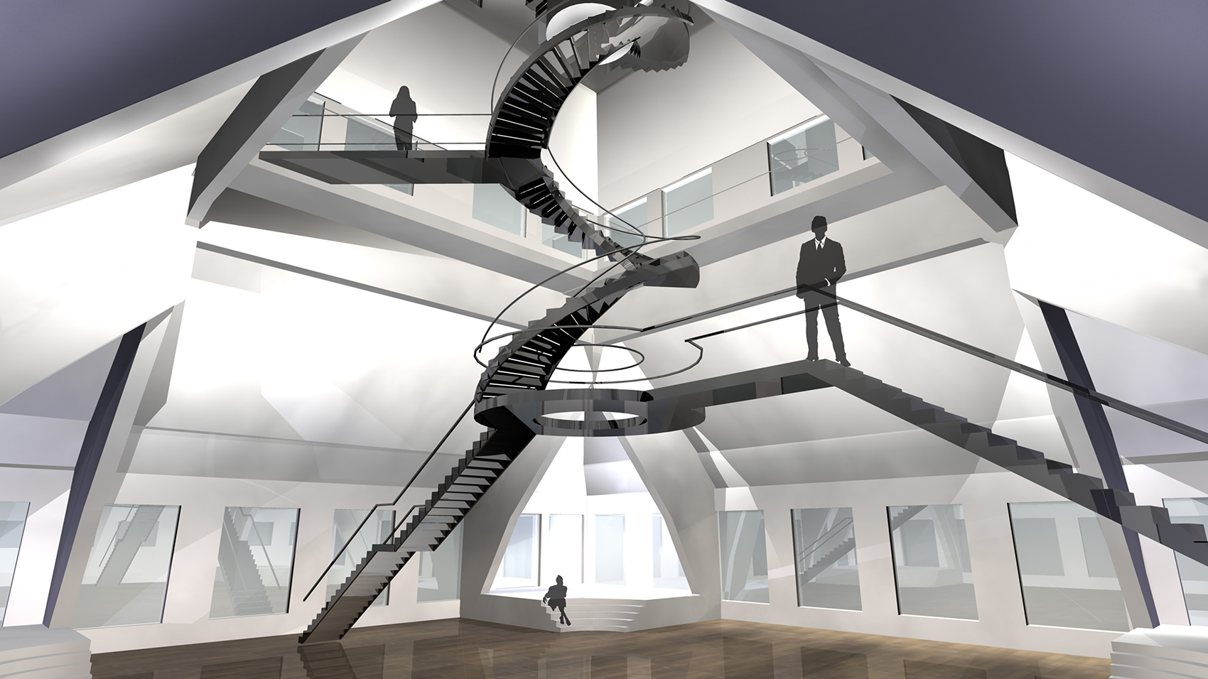 Eine neue Medienfassade zeichnet die Abbruchkanten ehemaliger Anbauten nach, die darüberliegende Fassade wird lediglich ausgebessert. So bleibt die städtebauliche Wirkung erhalten, ohne die neue Nutzung zu verleugnen. Unrenoviert belassene Inseln bilden die vertikale Erschließung, das Denkmal bleibt erfahrbar. Indem diese verspringen, schaffen sie stets neue Räume, sich stetig wandelnde Aus- und Einblicke. Direkt unter dem markanten U befindet sich der Veranstaltungssaal. Neue Tragelemente entlasten die vorhandene Struktur und akzentuieren den Raum. Die neue Treppe zum Aussichtspunkt schafft Raum für variable Nutzungen.
