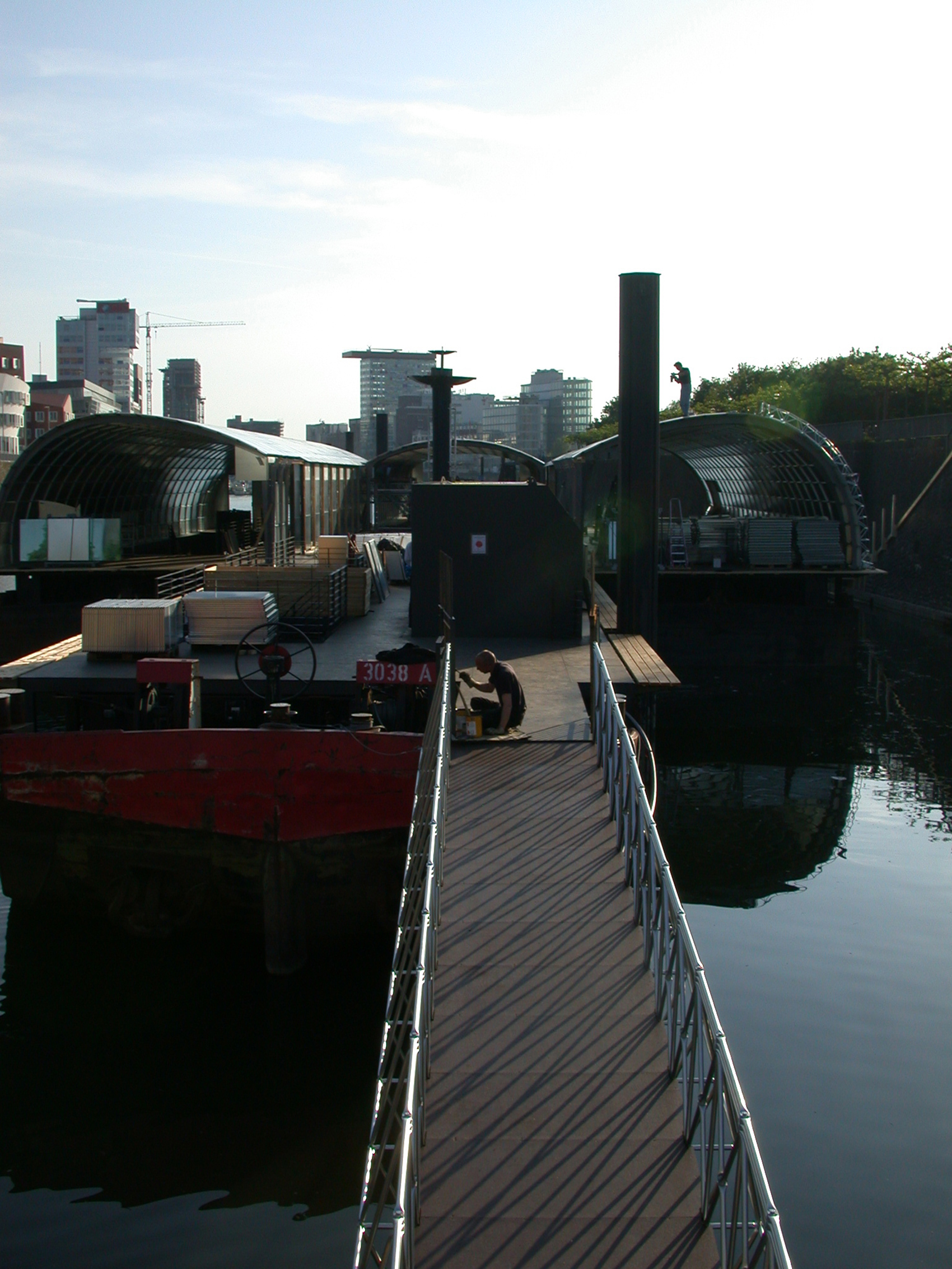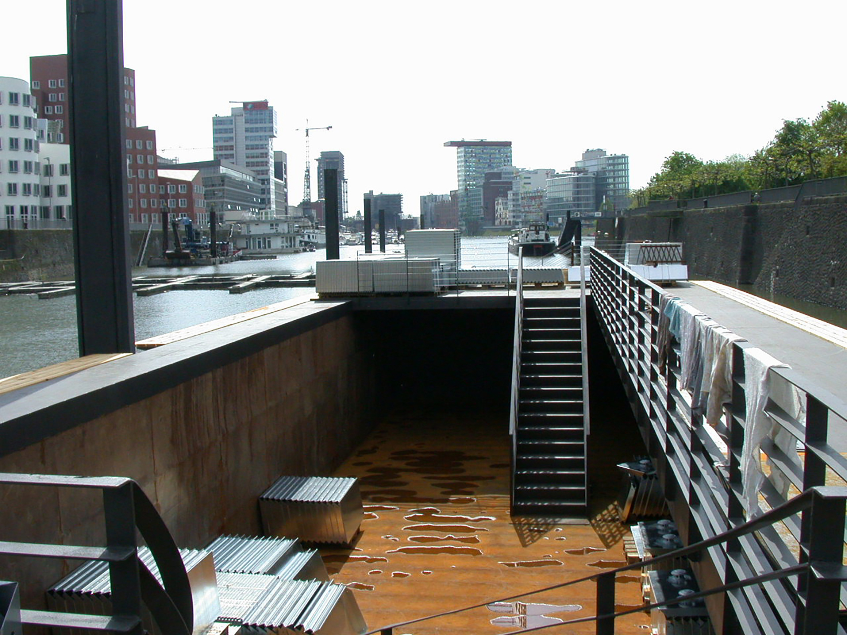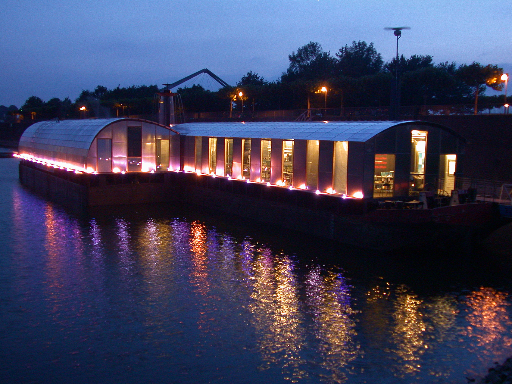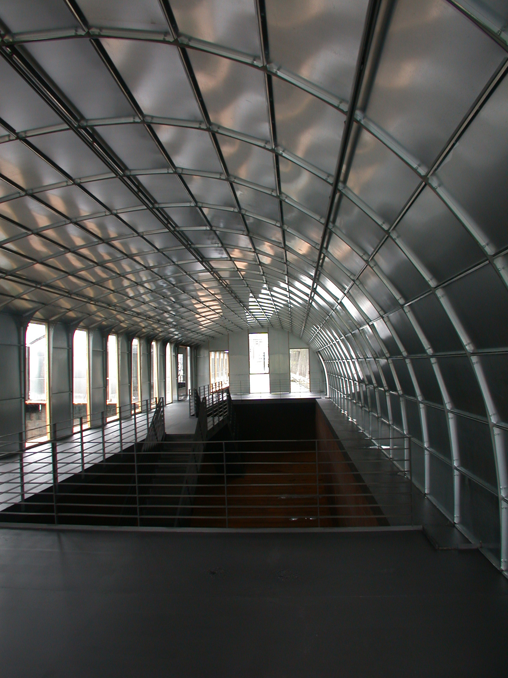 Die Anordnung der Schubleichter formt ein ›Wasseratrium‹, aus dem in der Mitte eine hohe Dalbe ragt. Darüber hinaus entstand so eine umlaufende, zusammenhängende Galerie. Diese ist der innere Teil der neuen Ebenen und Ort der Vogelschau-Einsicht in die Laderäume, die ungewöhnliche Ausstellungsräume mit vier geschlossenen rostigen Wänden bilden. Die Leichter werden von einer Konstruktion aus Stahlspanten überwölbt und mit flächigen zweilagigen verzinkten Stahlblechkassetten ausgefacht. Gerade diesen matt spiegelnden gebogenen Decke gelingt es im Konzert der umliegenden Gebäude mitzuspielen und eine technische und gestalterische Synthese zwischen Umfeld, Schiff und Ausstellungsraum zu erzeugen.