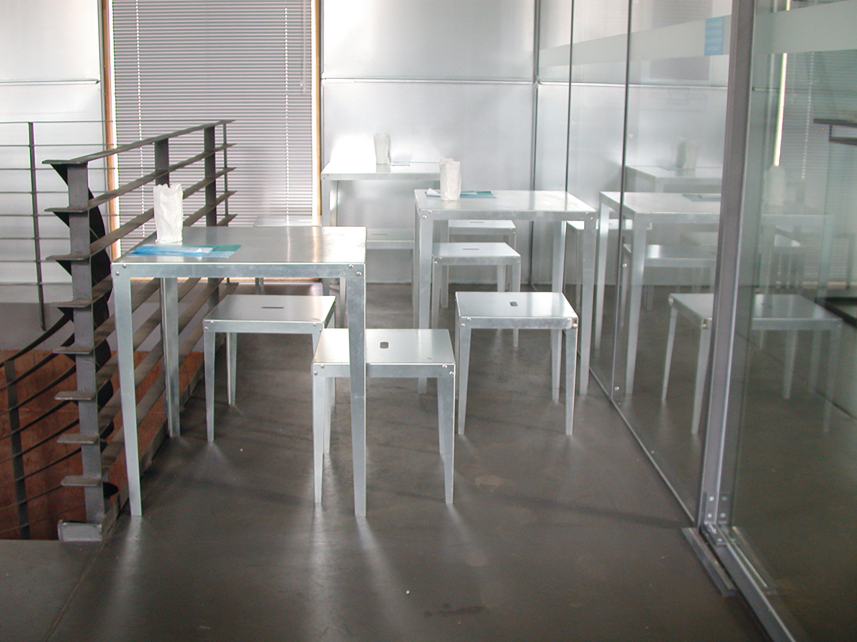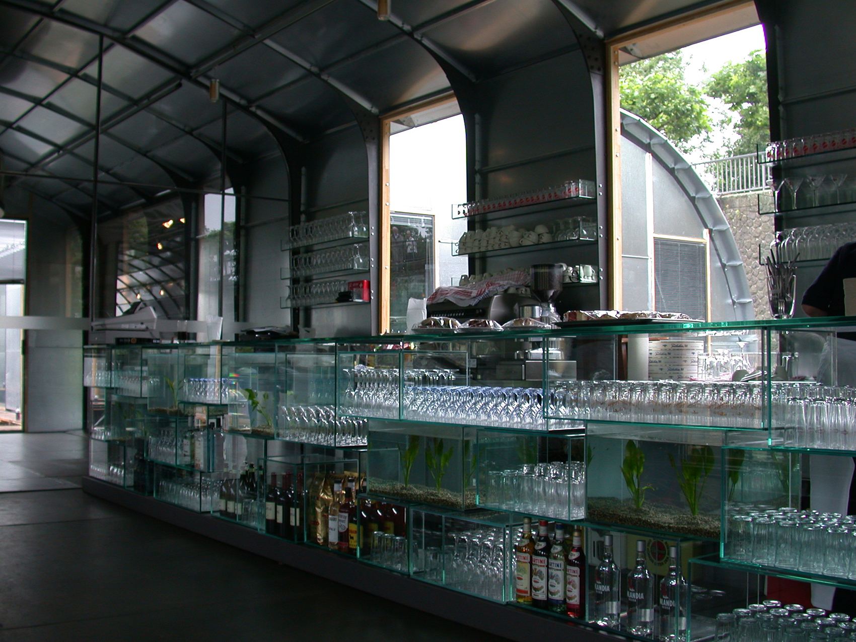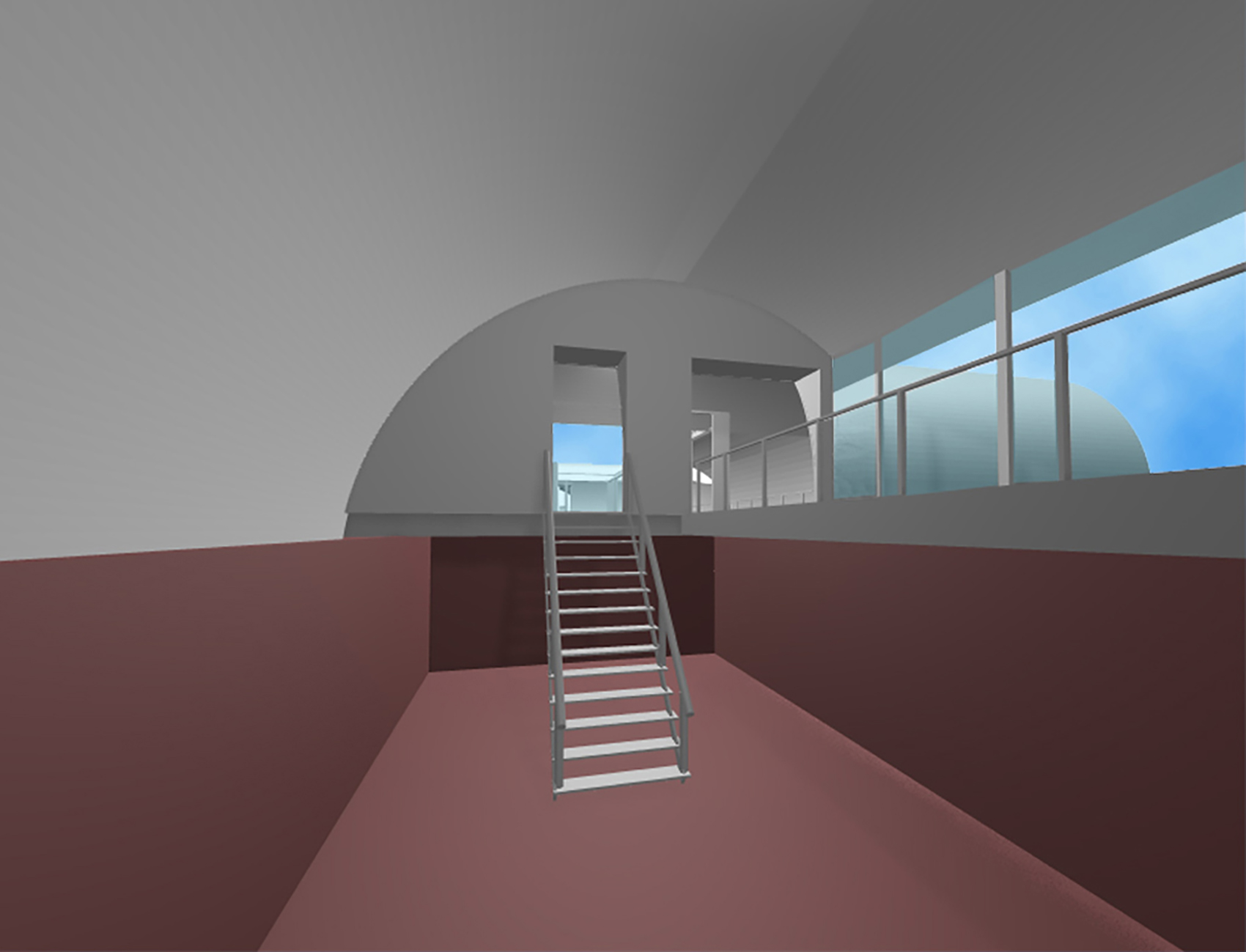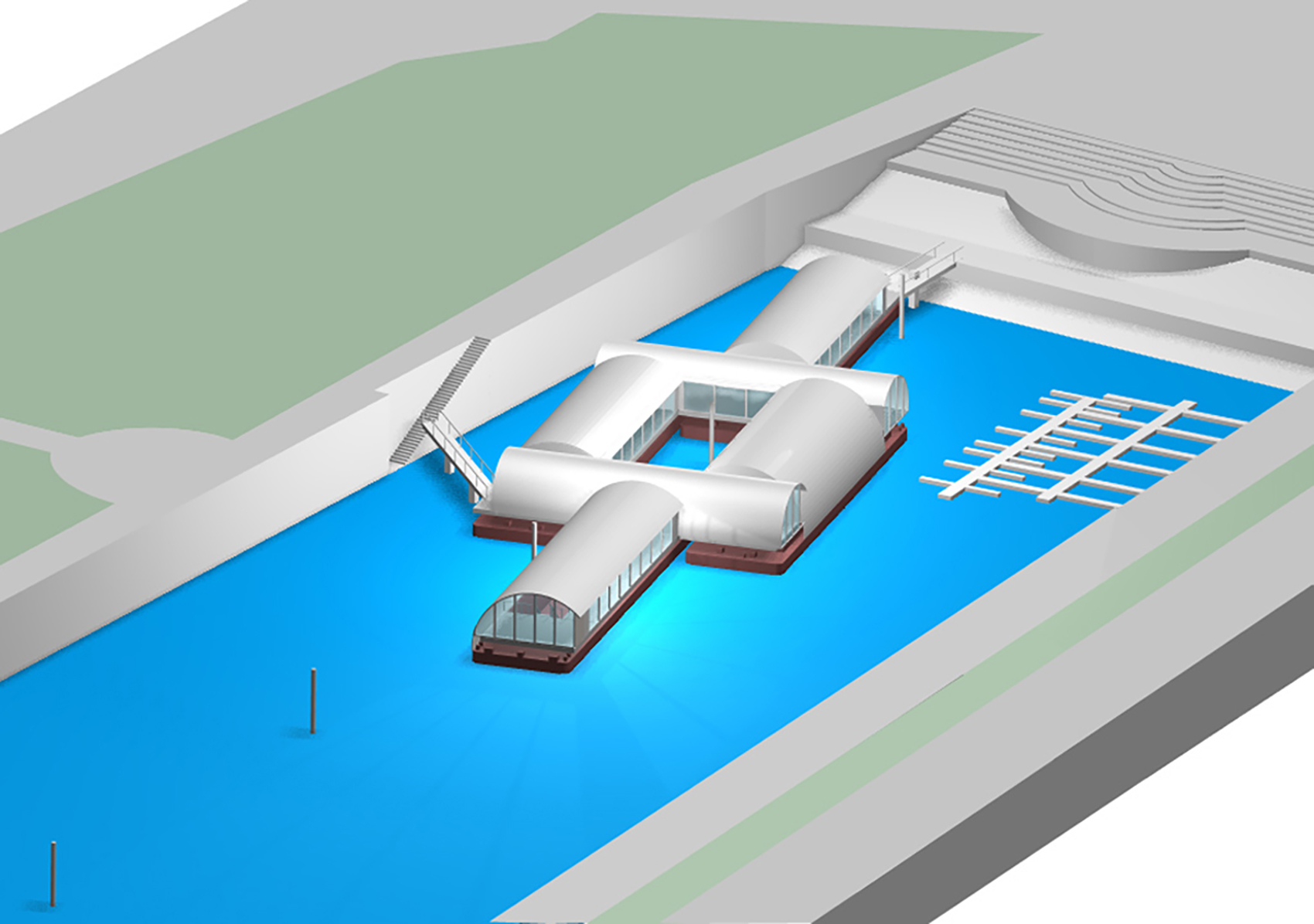 Die Anordnung der Schubleichter formt ein ›Wasseratrium‹, aus dem in der Mitte eine hohe Dalbe ragt. Darüber hinaus entstand so eine umlaufende, zusammenhängende Galerie. Diese ist der innere Teil der neuen Ebenen und Ort der Vogelschau-Einsicht in die Laderäume, die ungewöhnliche Ausstellungsräume mit vier geschlossenen rostigen Wänden bilden. Die Leichter werden von einer Konstruktion aus Stahlspanten überwölbt und mit flächigen zweilagigen verzinkten Stahlblechkassetten ausgefacht. Gerade diesen matt spiegelnden gebogenen Decke gelingt es im Konzert der umliegenden Gebäude mitzuspielen und eine technische und gestalterische Synthese zwischen Umfeld, Schiff und Ausstellungsraum zu erzeugen.