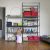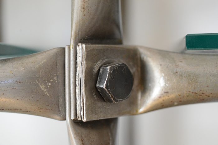 Dieses erste Regal aus Rohr mit flachgepressten Enden ist an seinem zweiten Standort 25 Jahre nach der Herstellung fotografiert worden. Die Rohre mit einem Durchmesser von 25 mm und einer Wandstärke von 1,5 mm hatte der Erfinder des Systems 180® in der provisorischen Schlosserei des Martin-Gropius-Baus eigenhändig gesägt, im Schraubstock gepresst und in der Ständerbohrmaschine gelocht. Die Stabilität erhält dieses Regal durch die zur Stabachse um 45 Grad versetzte Lage der Knoten. Diese Bauweise, die auf diagonale Versteifung verzichten wollte, ist später nur noch selten praktiziert worden, vor allem weil die horizontalen Stäbe in der Tiefe verspringen. Dennoch hat dieses Urregal Tausende nach sich gezogen.