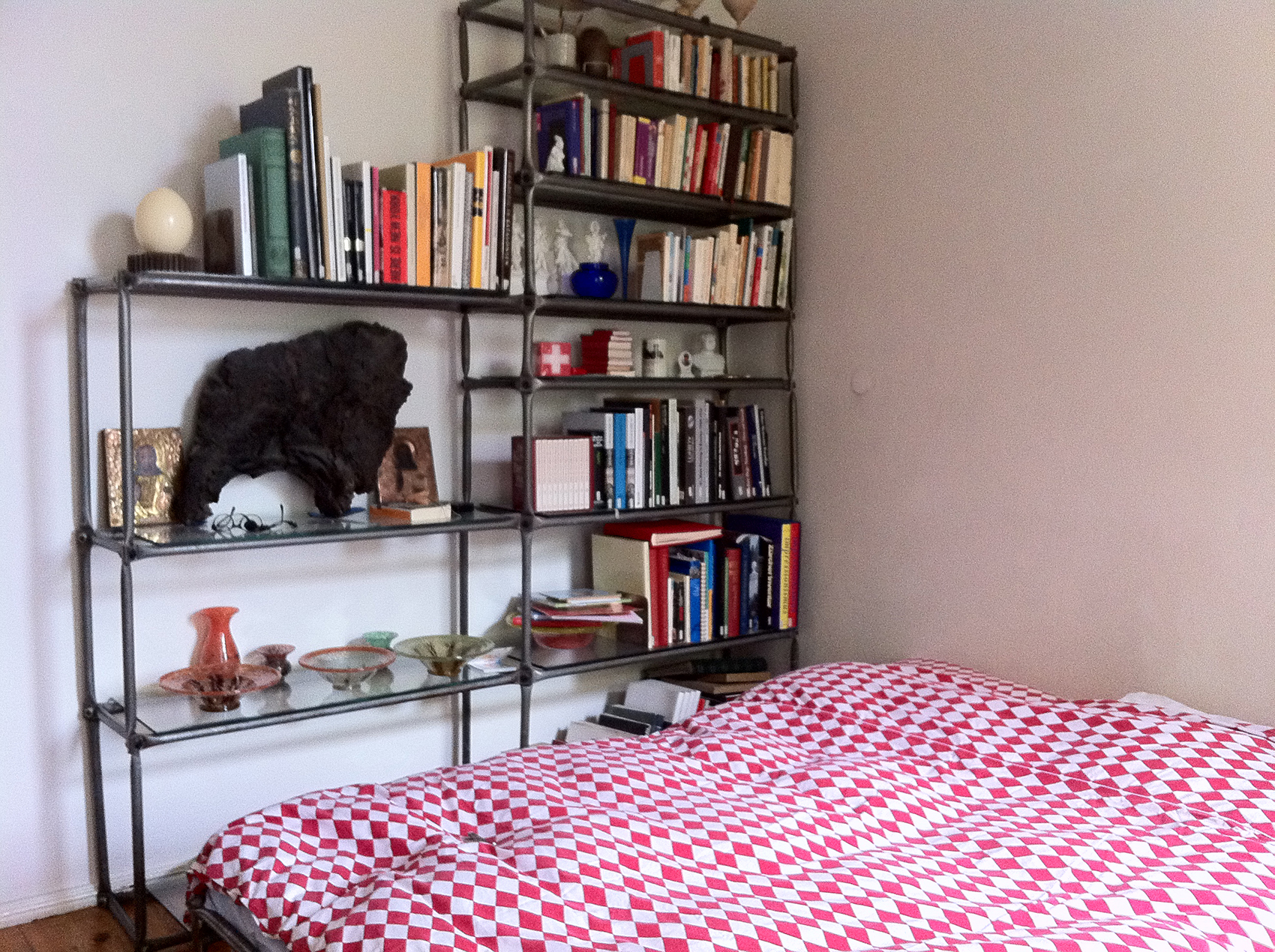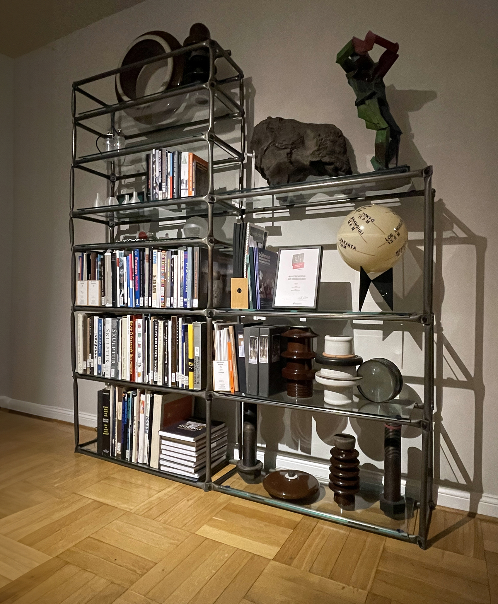 Dieses erste Regal aus Rohr mit flachgepressten Enden ist an seinem zweiten Standort 25 Jahre nach der Herstellung fotografiert worden. Die Rohre mit einem Durchmesser von 25 mm und einer Wandstärke von 1,5 mm hatte der Erfinder des Systems 180® in der provisorischen Schlosserei des Martin-Gropius-Baus eigenhändig gesägt, im Schraubstock gepresst und in der Ständerbohrmaschine gelocht. Die Stabilität erhält dieses Regal durch die zur Stabachse um 45 Grad versetzte Lage der Knoten. Diese Bauweise, die auf diagonale Versteifung verzichten wollte, ist später nur noch selten praktiziert worden, vor allem weil die horizontalen Stäbe in der Tiefe verspringen. Dennoch hat dieses Urregal Tausende nach sich gezogen.