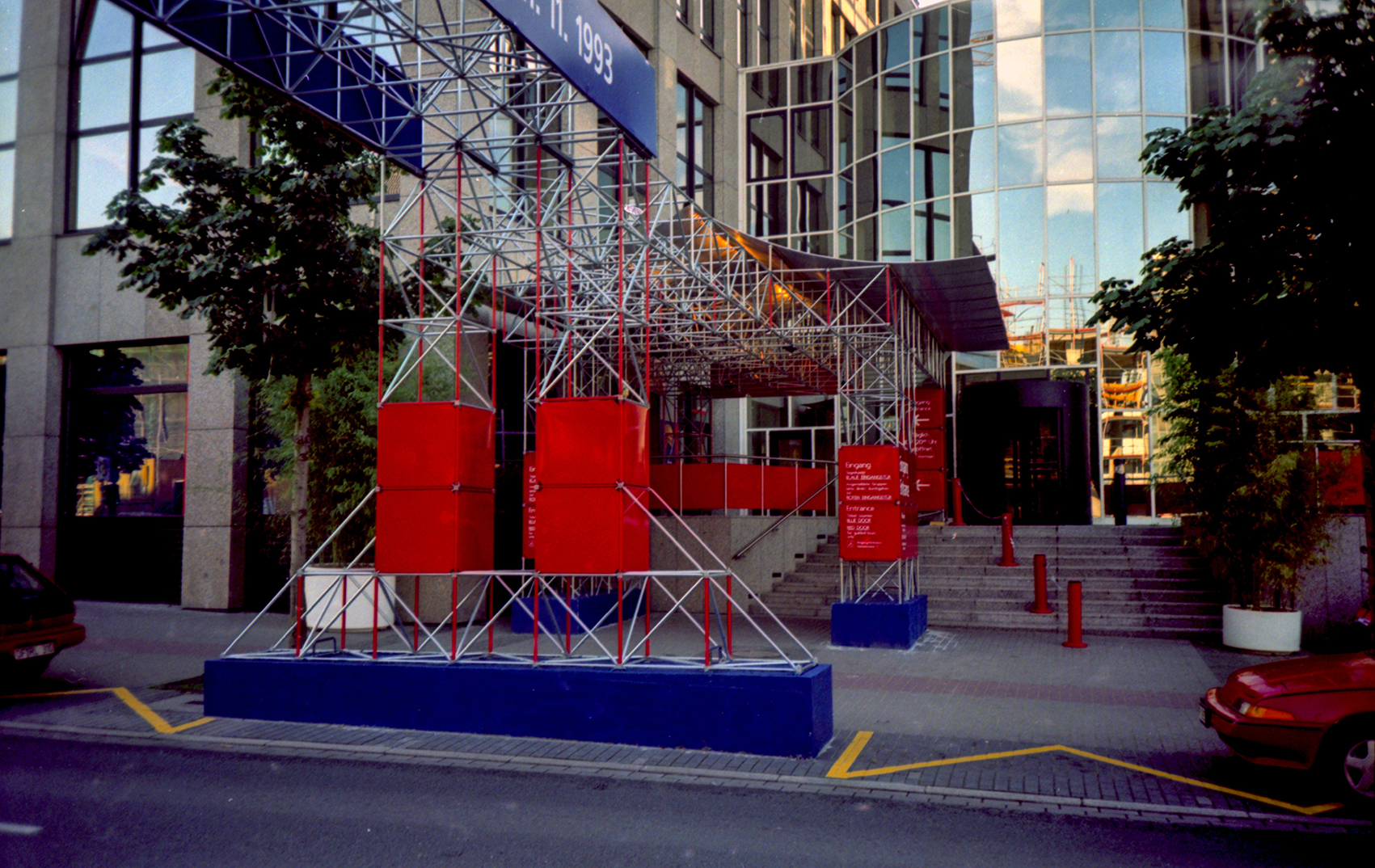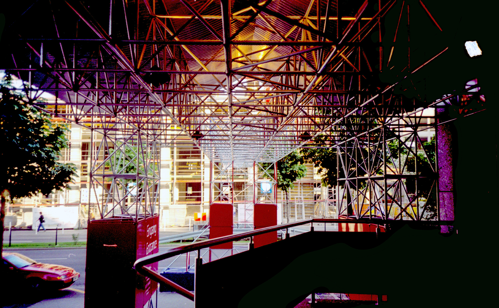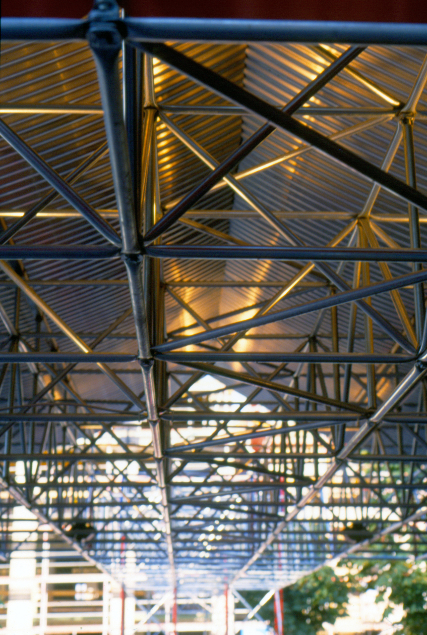 Die Konstruktion aus System 180 erforderte Versuchsreihen am Institut für Stahlbau der Technische Universität Braunschweig, da wir zum einzigen Mal alle Schrauben in gleicher, vertikaler Richtung anordneten – auch in den Pfeilern. Dadurch mussten rechnerisch auch Pfosten (Mutternstäbe) Zugkräfte weiterleiten können, sodass als Ergebnis der Untersuchungen die integrierten Mutternstücke mit Spannstiften gegen Herausziehen zu sichern waren. Das letzte Bild zeigt den Belastungsversuch bis zum Versagen.