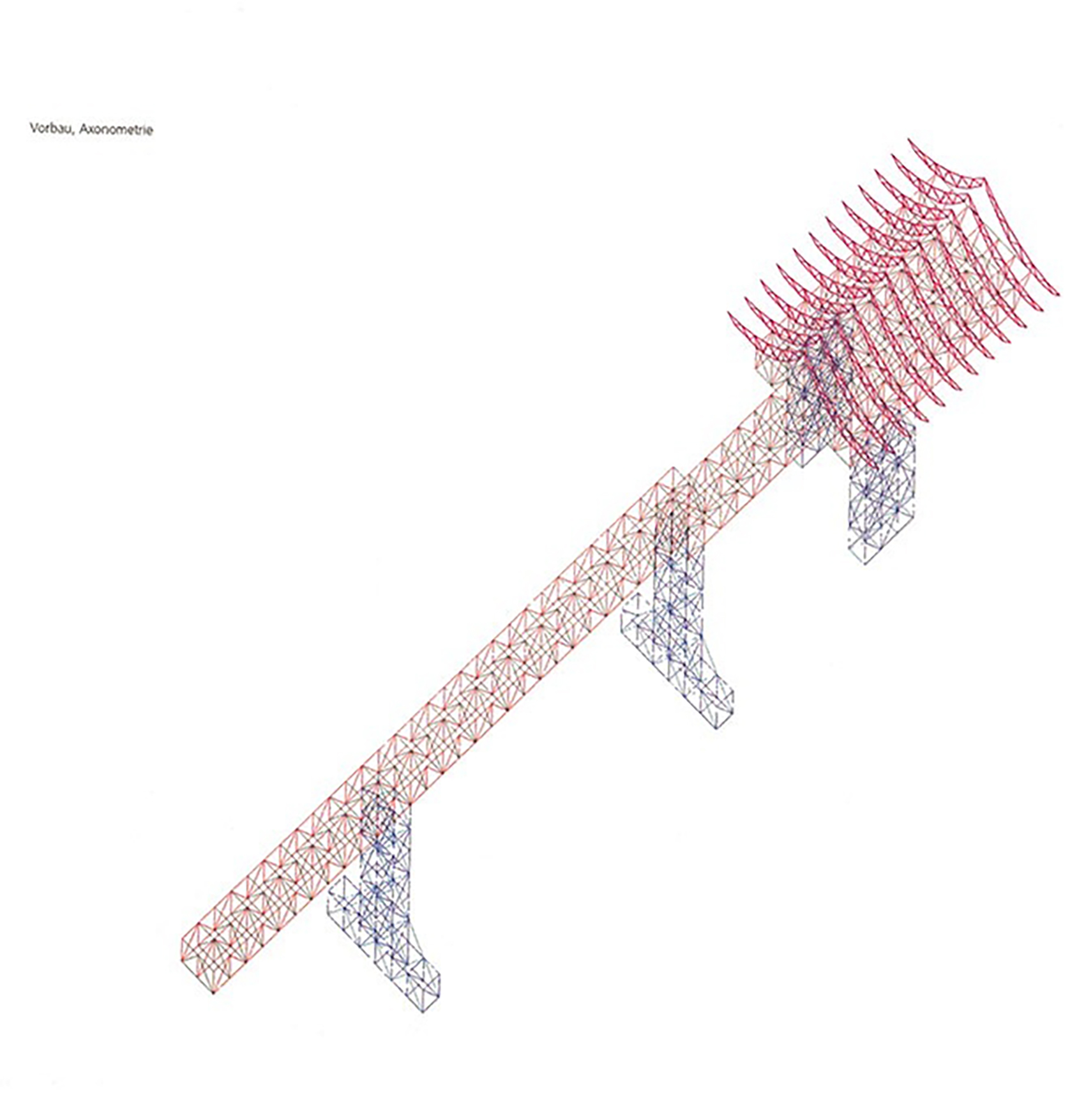Die Konstruktion aus System 180 erforderte Versuchsreihen am Institut für Stahlbau der Technische Universität Braunschweig, da wir zum einzigen Mal alle Schrauben in gleicher, vertikaler Richtung anordneten – auch in den Pfeilern. Dadurch mussten rechnerisch auch Pfosten (Mutternstäbe) Zugkräfte weiterleiten können, sodass als Ergebnis der Untersuchungen die integrierten Mutternstücke mit Spannstiften gegen Herausziehen zu sichern waren. Das letzte Bild zeigt den Belastungsversuch bis zum Versagen.