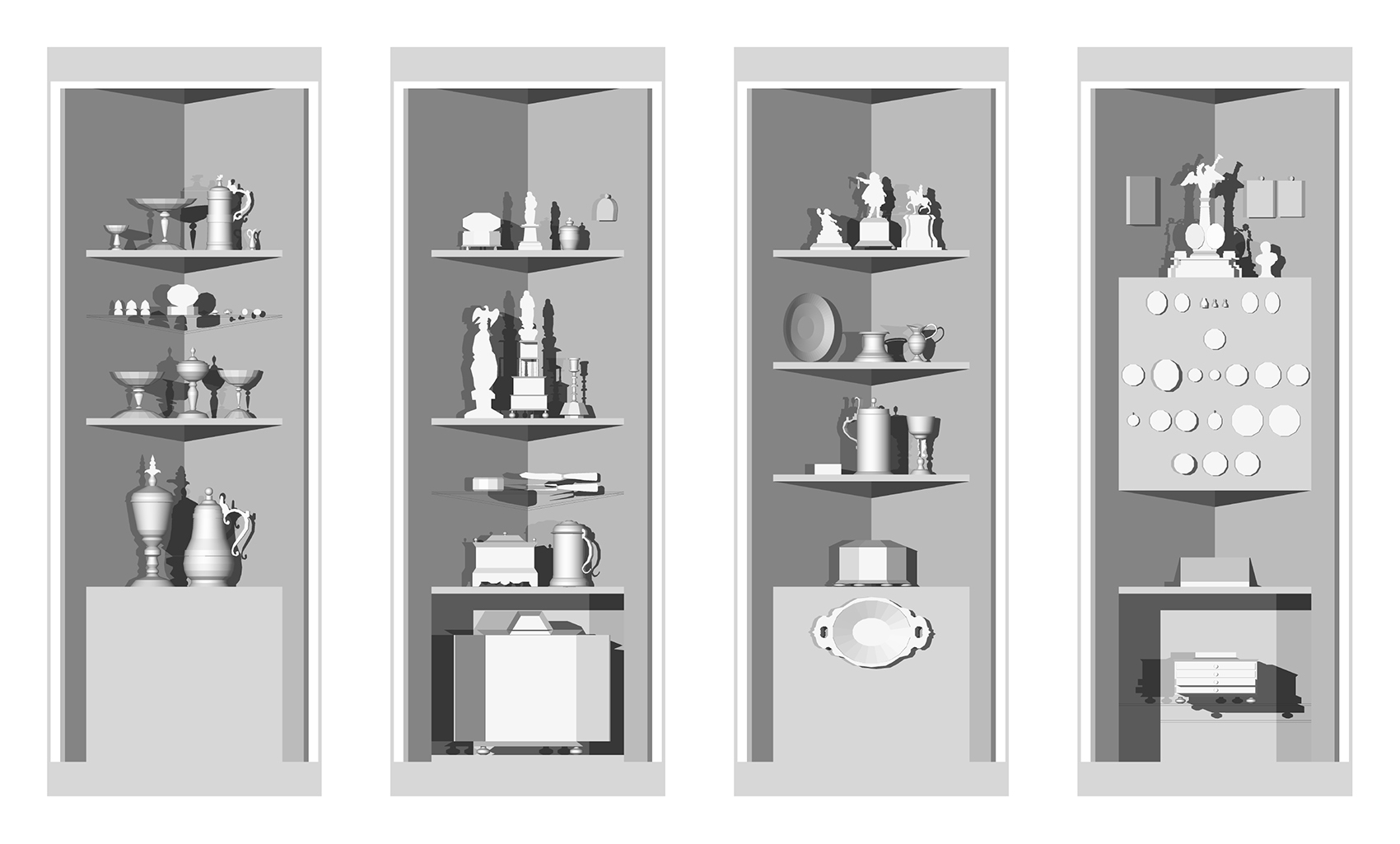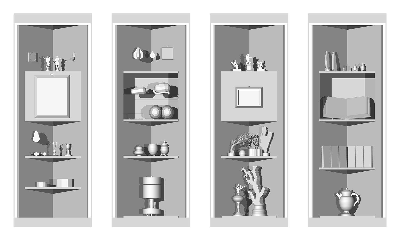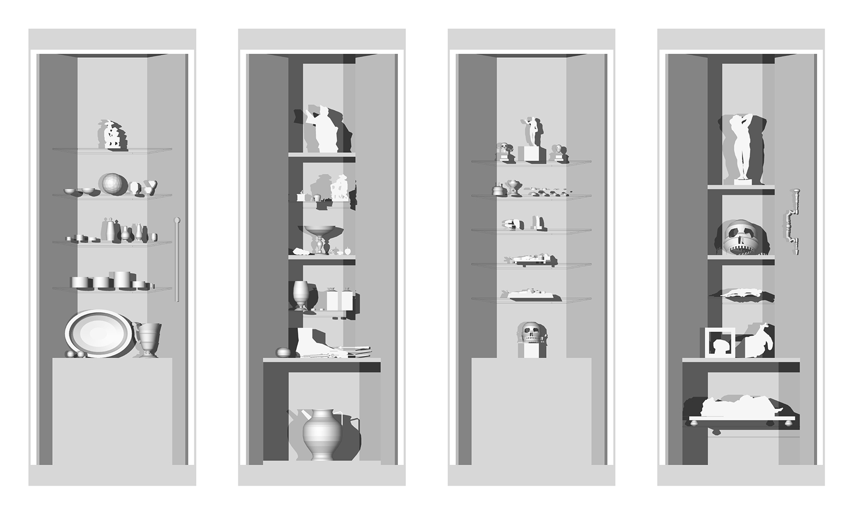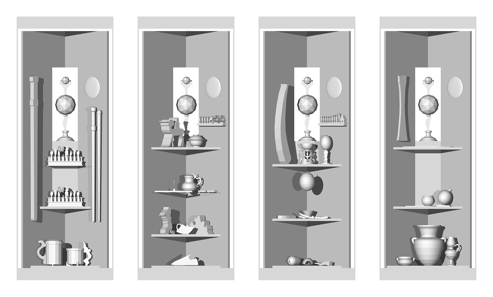 Je nach Größe der Objekte können die vier übereinander geschichteten Einbauelemente auf andreaskreuzförmiger Grundstruktur verkleinert oder vergrößert werden. Die entsprechende Gegenform wirkt sich auf den restlichen drei Seiten aus – Hohlräume galt es zu vermeiden. An den Stößen der Schichten sind notwendige Böden aus dem ausschließlich verwendeten Ahornholz gefertigt, weitere Zwischenböden sind aus Glas, mal mattiert, oder auch klar. Nach der Herstellung einer Prototypvitrine wurde klar, die Exponatbeschreibungen außerhalb zu platzieren, da die 56 Mikroarchitekturen in ihrer Reinheit, ganz auf die Objekte bezogen, wirken sollen. Die Kugelleuchten konnten an die richtigen Stellen und Höhen montiert werden, um die schwierige Ausleuchtung zu gewährleisten.