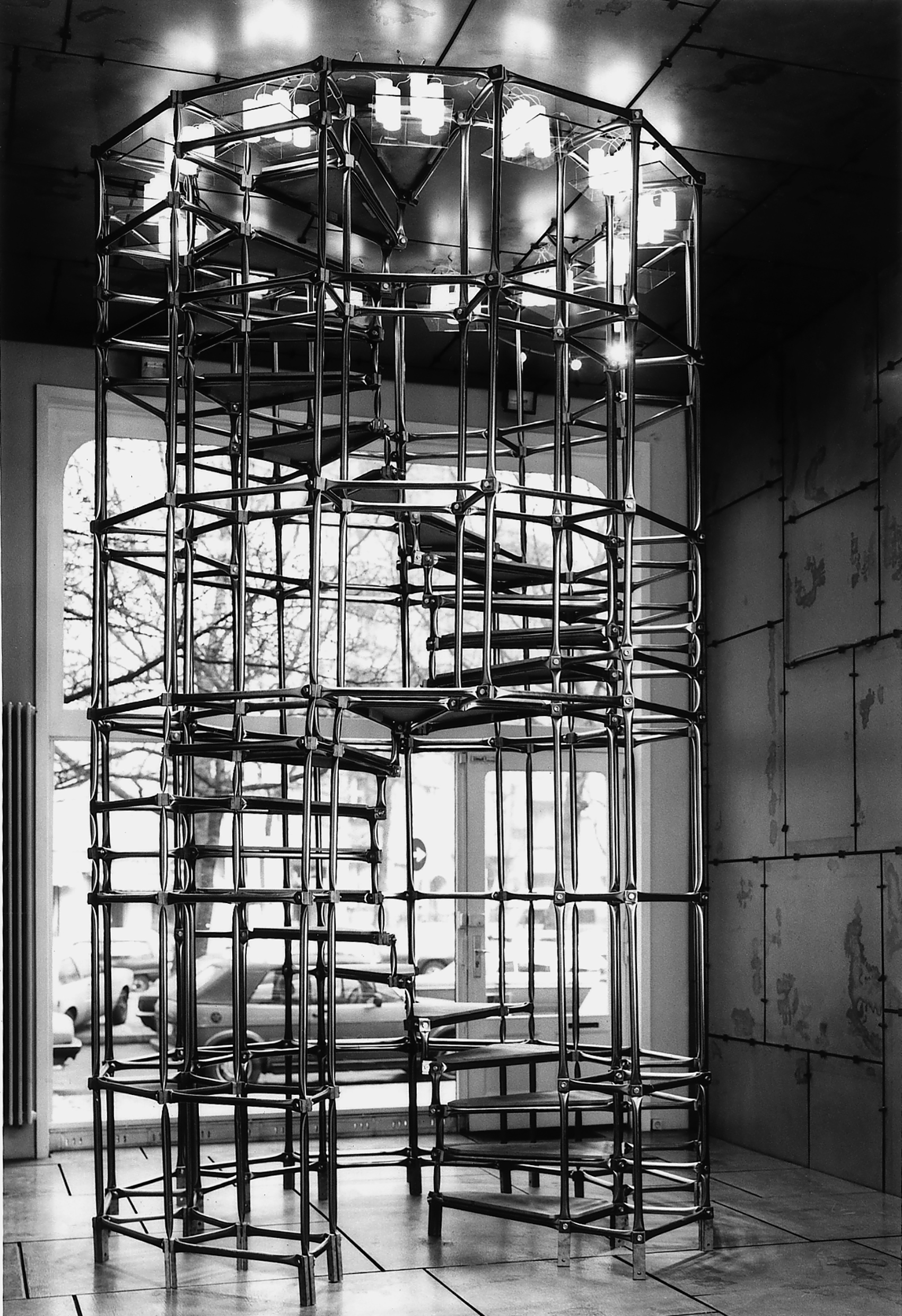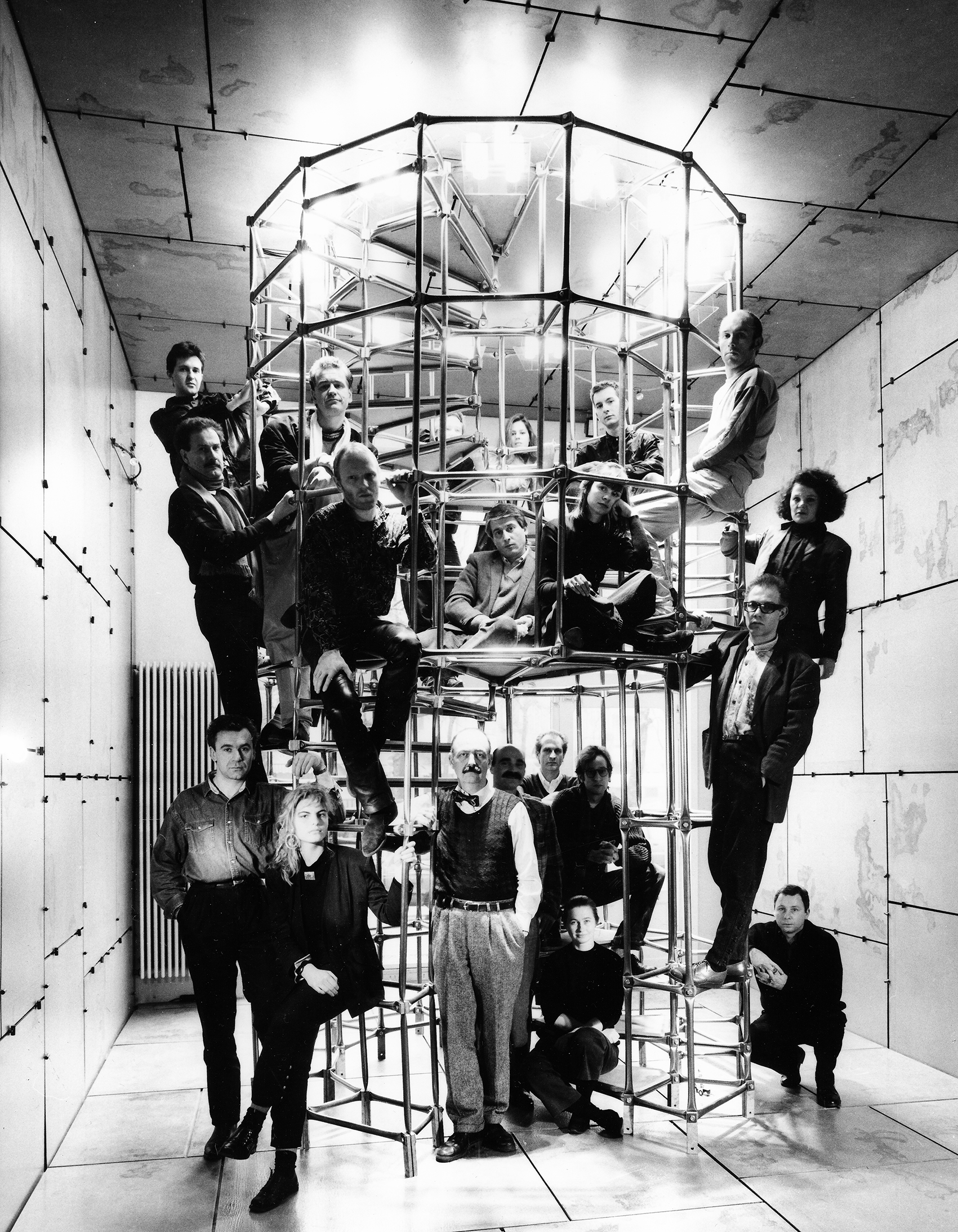 Die Wendeltreppe hat keine innere Stütze, sie erscheint dadurch offen und transparent. Auch ein inneres Geländer ist nicht notwendig, da der innere Abschluss der gegenüberliegenden Stufen auf halber Höhe als Absturzsicherung dient. Im doppellagigen Äusseren kann die Wendeltreppe zum Regal ausgebaut werden. Dieses als Verkehrsweg und Aufbewahrungsgerüst nutzbare Objekt war eine Initialzündung für viele folgende zylinderförmige Bauten aus System Steiner, das seit 1990 System 180 heisst. Auf dem zweiten Bild versammeln sich die die jungen, wilden Berliner Designer, die sich in der Agentur zusammenfanden.