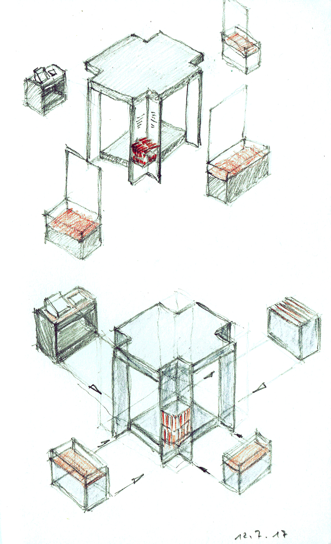Die Anforderungen waren recht umfangreich, sowohl was die Arbeitsplatzgestaltung als auch die Inhalte betraf. Vorgabe war ein Volumen von 3 x 3 x 3 m und die Verschieblichkeit des Objekts innerhalb des Doms. Drei Varianten sind auf den Bildern oben zu sehen. Zur Ausführung kam 2020 eine gänzlich andere Variante.