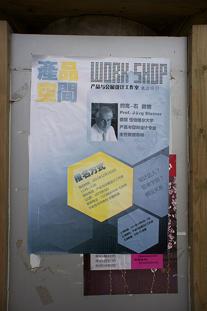 Auf Einladung von Prof. Dr. Weidong Wang leitete Jürg Steiner einen Workshop mit Studierenden im Fach Ausstellungsdesign. Er schlug vor, eine Ausstellung mit oder in Überseecontainern zu entwerfen. Seine Liebhaberei, Ausstellungen in special locations zu entwickeln, nahmen die Studierenden gut auf. Ein kurzer Überblick, was alles mit Containern gemacht wird ohne die Problematik der nur bedingten Modularität zu verschweigen, regte die Kreativität der Studierenden an, die sich mit innovativen Ideen an die Arbeit machten. Die meisten wählten Bleistift und Papier für den Entwurf, aber auch das computergestützte Entwerfen und der Modellbau wurden praktiziert. Die räumlichen Bedingungen und die Atmosphäre waren hervorragend.